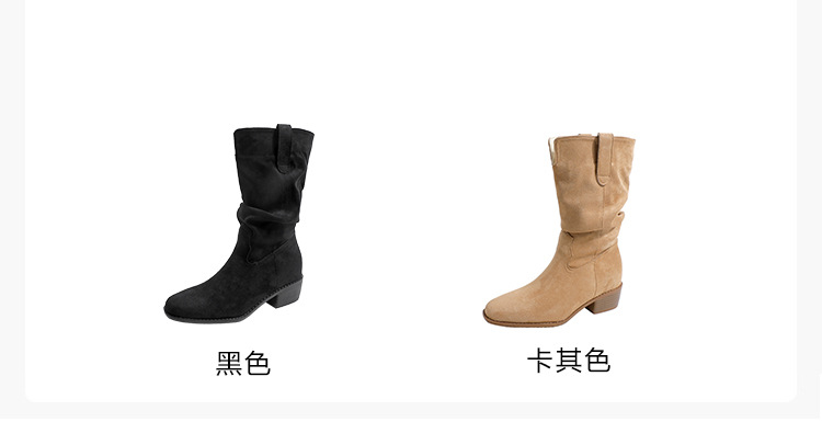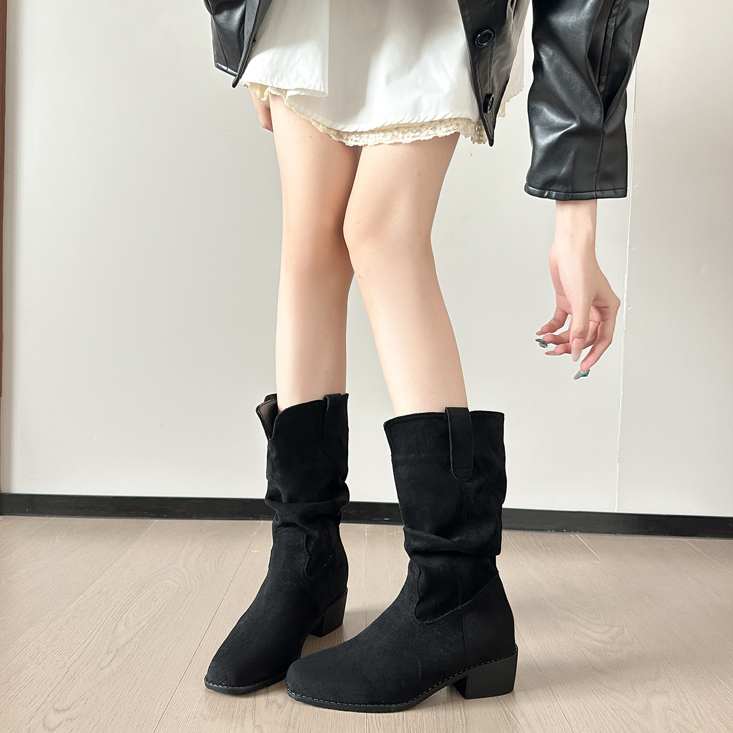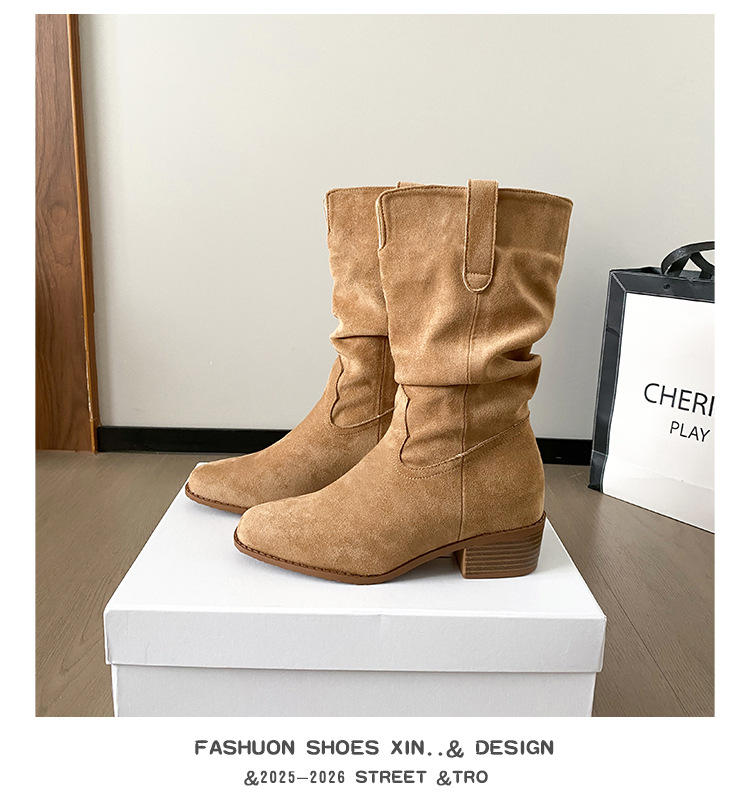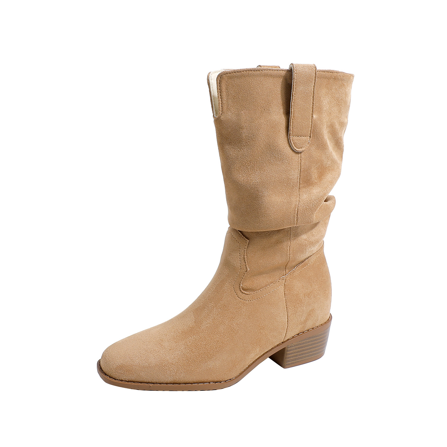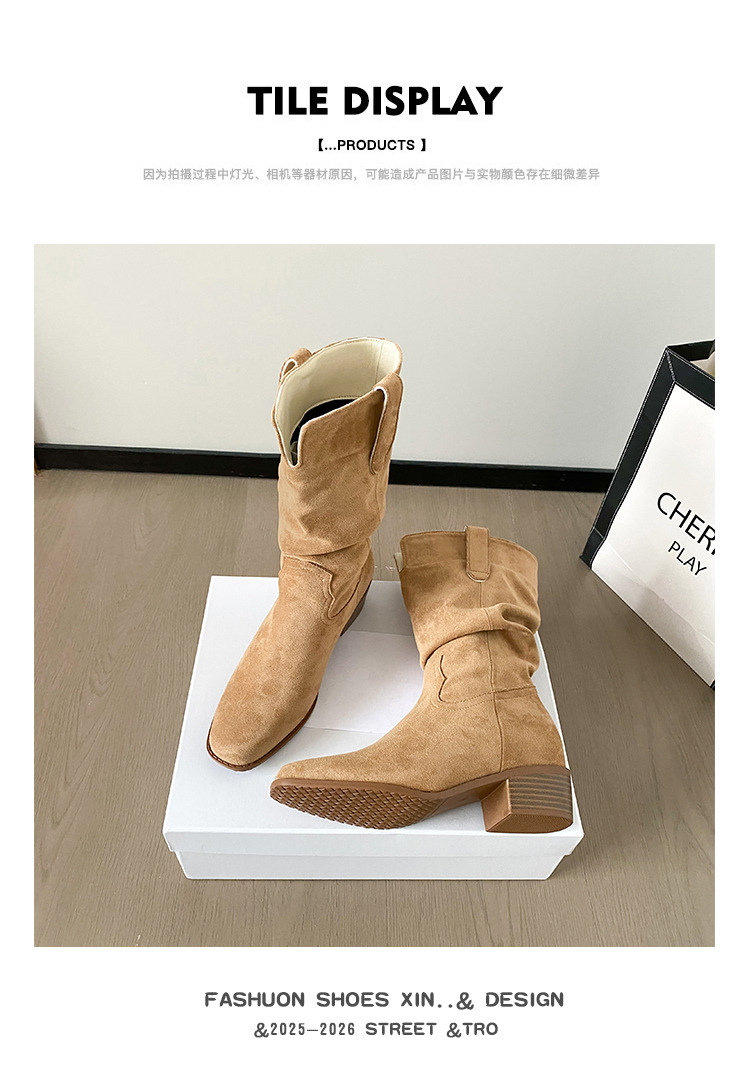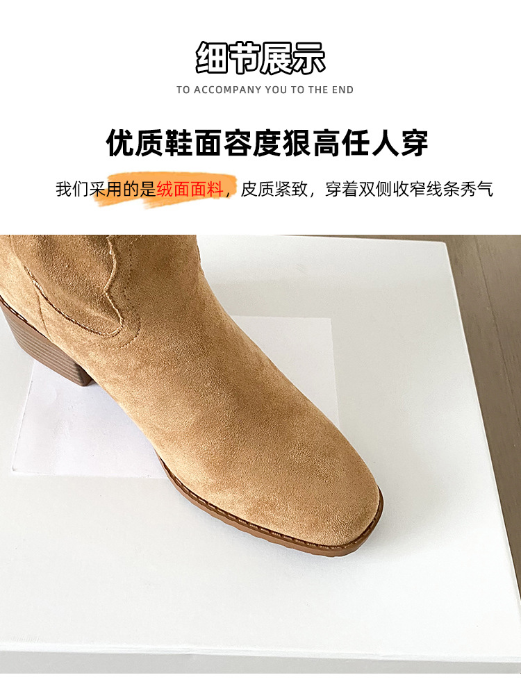237-12 새로운 스타일의 스웨이드 스퀘어 토 미드힐 숏부츠, 미드카프부츠, 하이힐 스택부츠, 여성용 웨스턴 카우보이부츠
