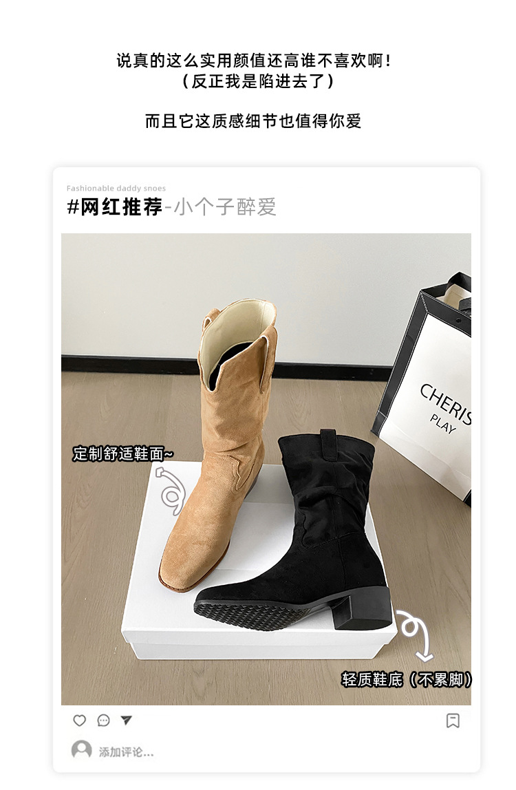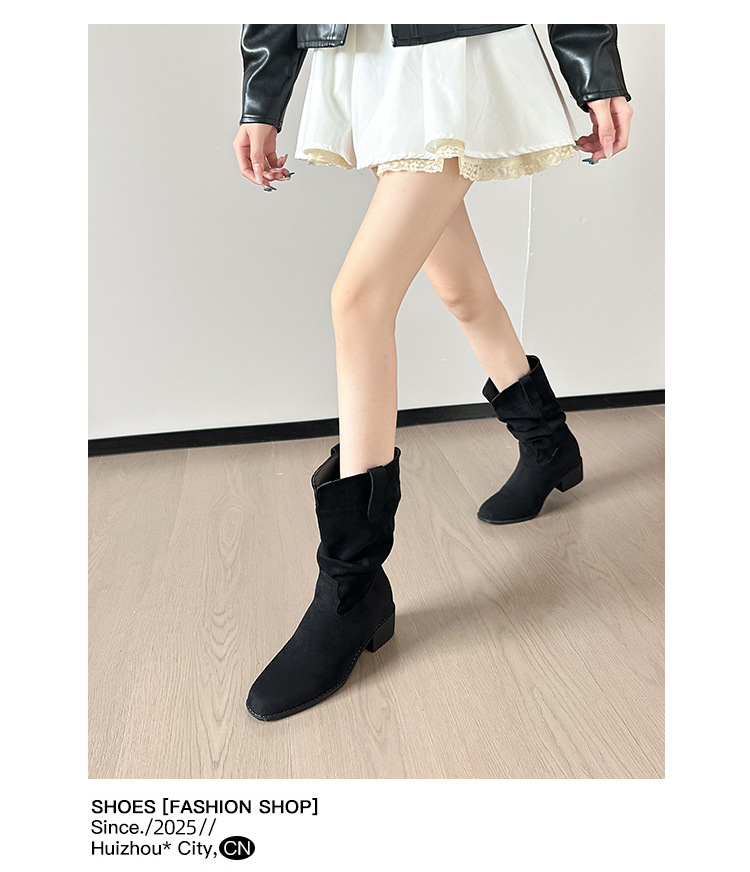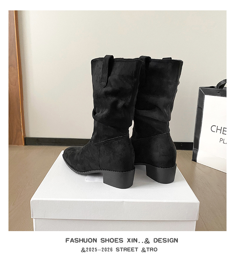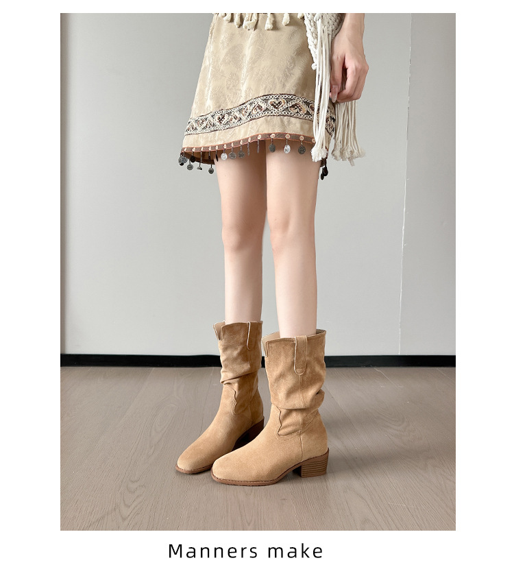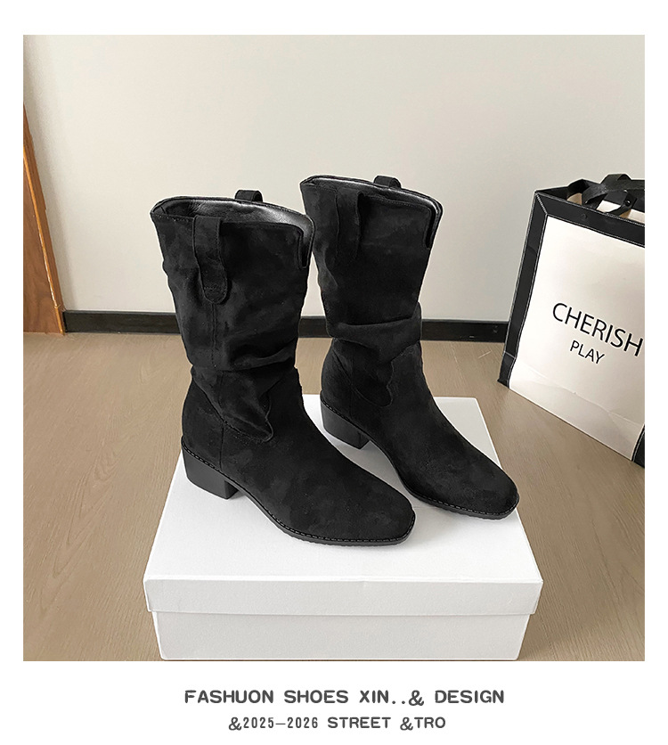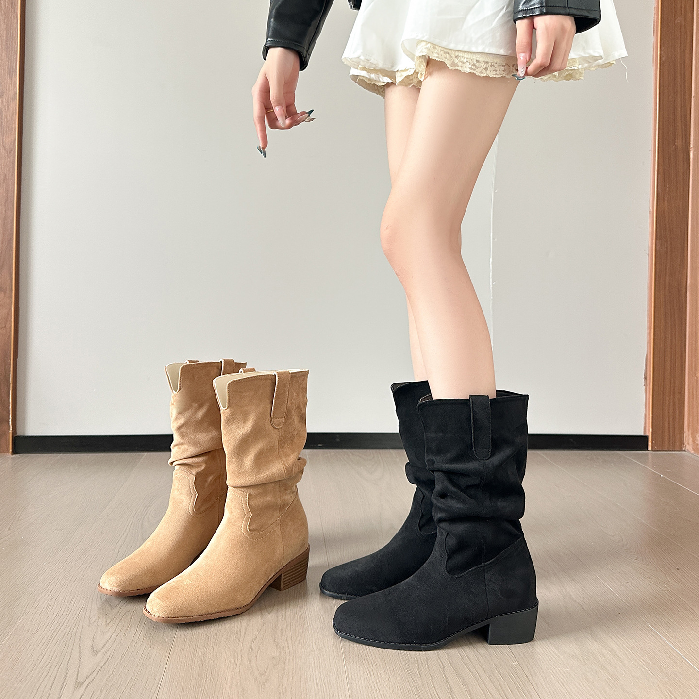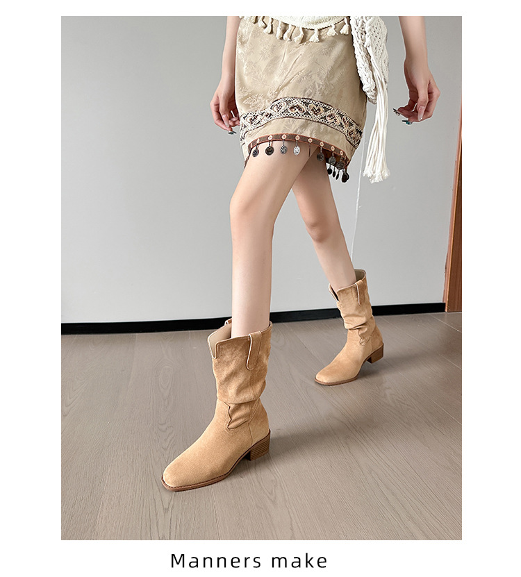 237-12 새로운 스타일의 스웨이드 스퀘어 토 미드힐 숏부츠, 미드카프부츠, 하이힐 스택부츠, 여성용 웨스턴 카우보이부츠