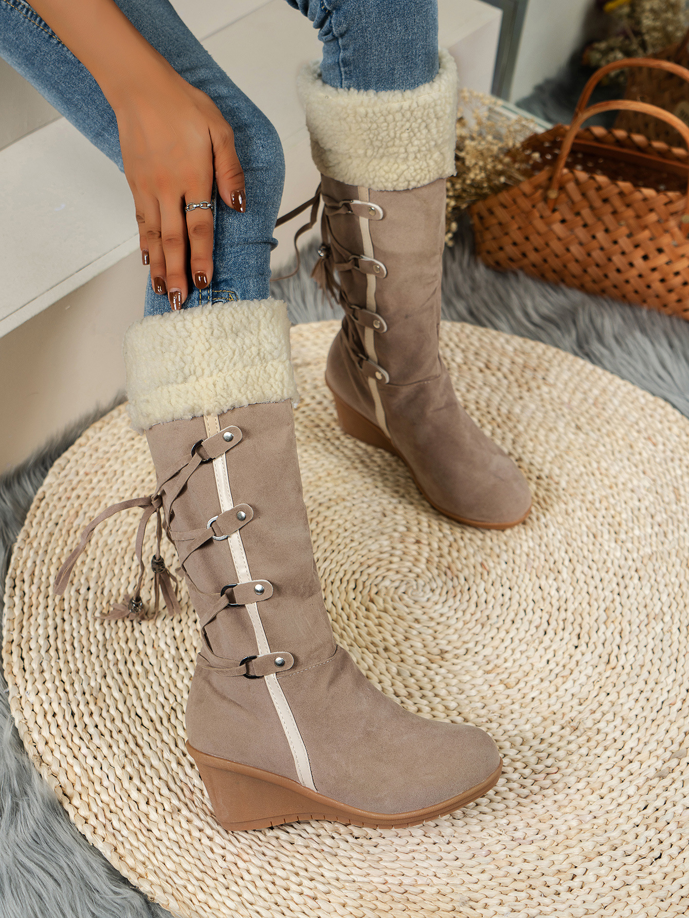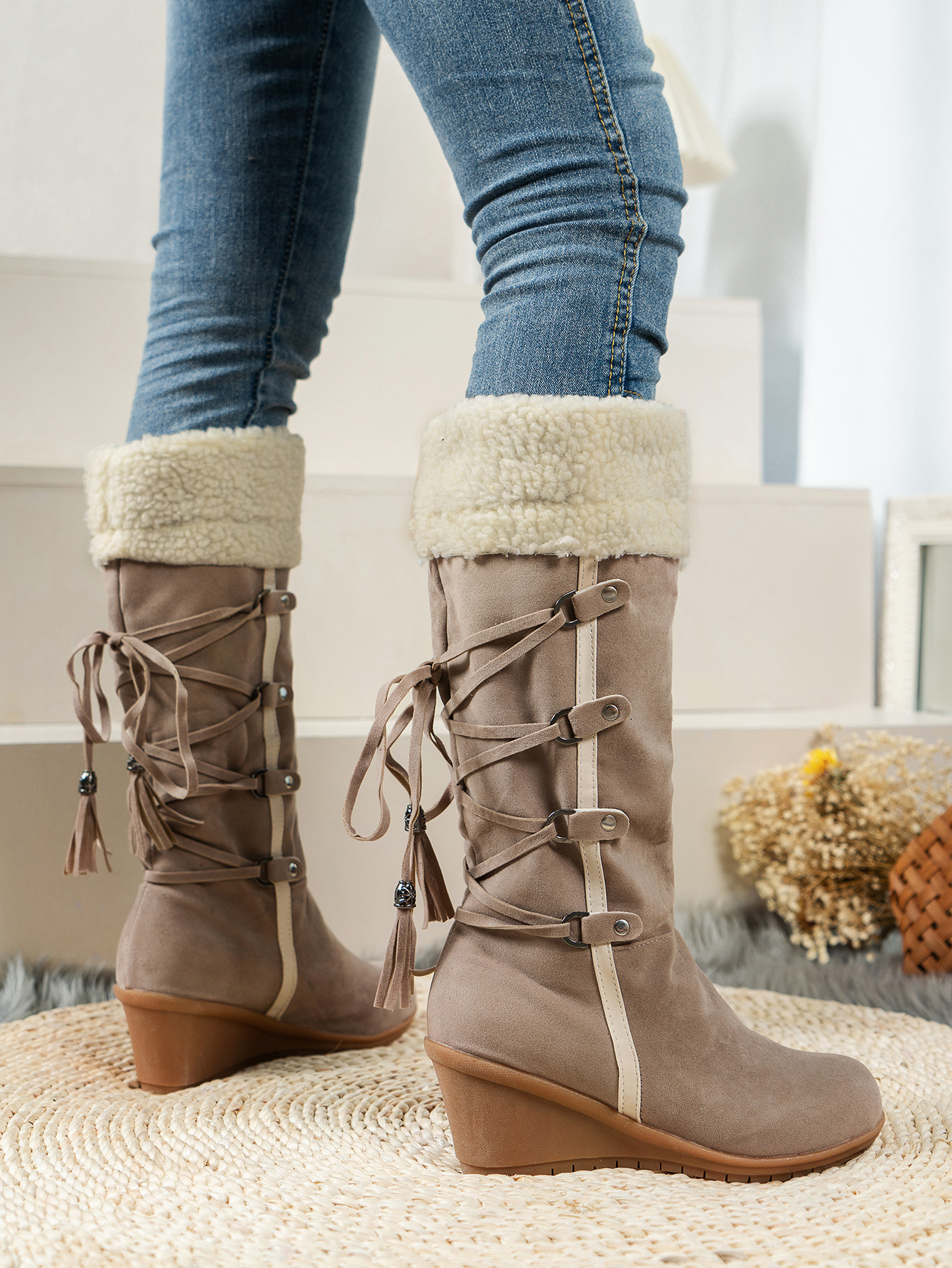 국경 간 유럽과 미국 대외 무역 대형 여성 면화 부츠 젖빛 뒷끈 태슬 하이 부츠 슬리브 웨지 스노우 부츠