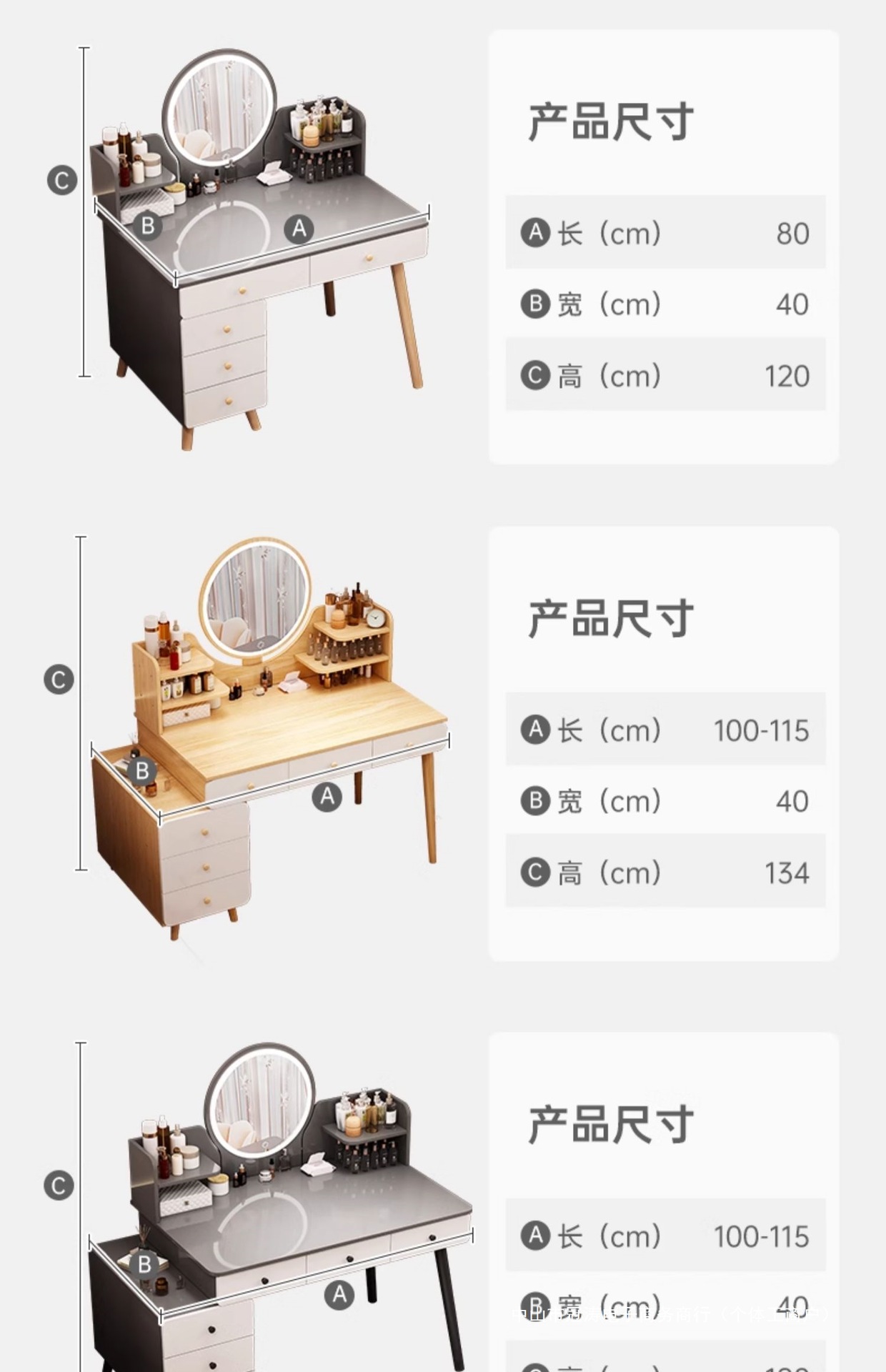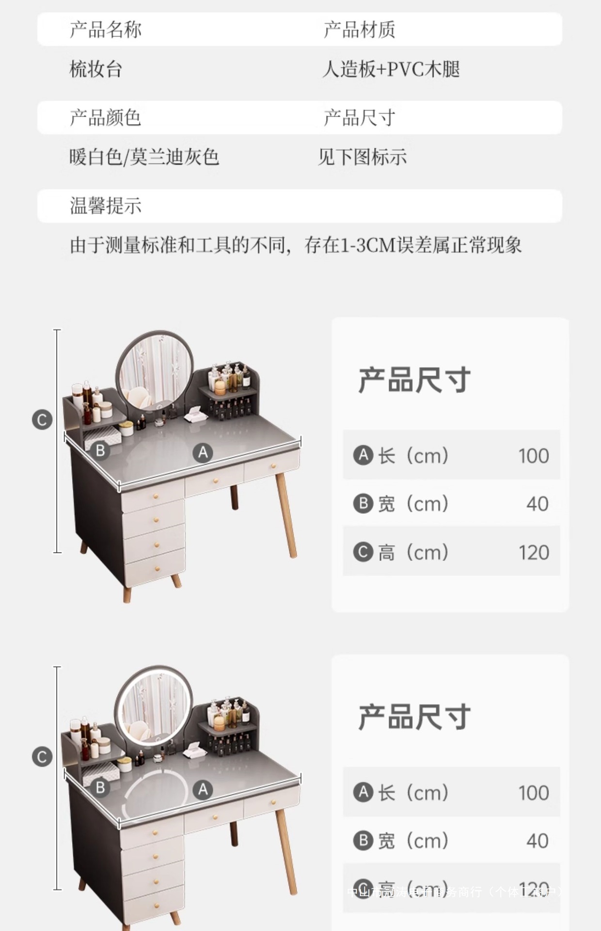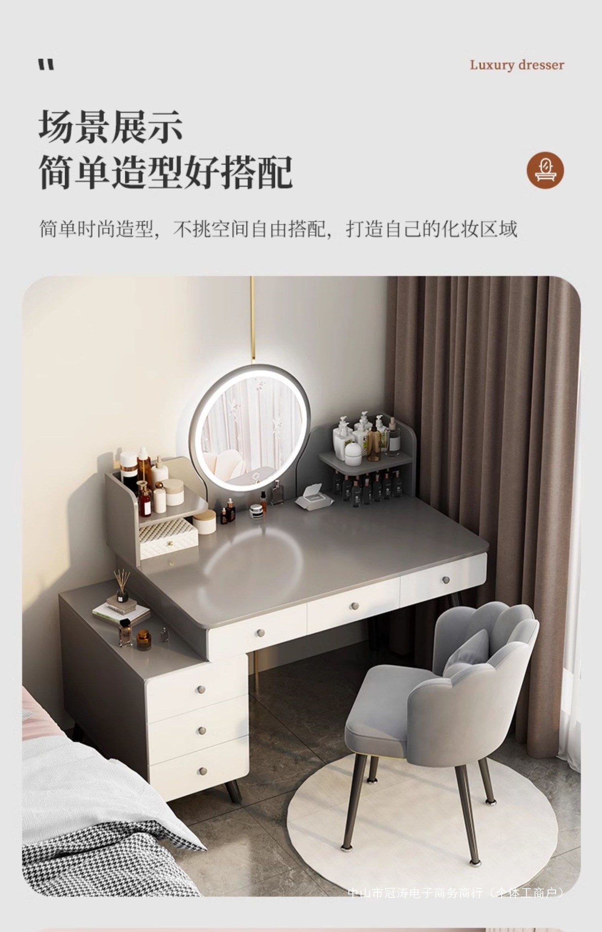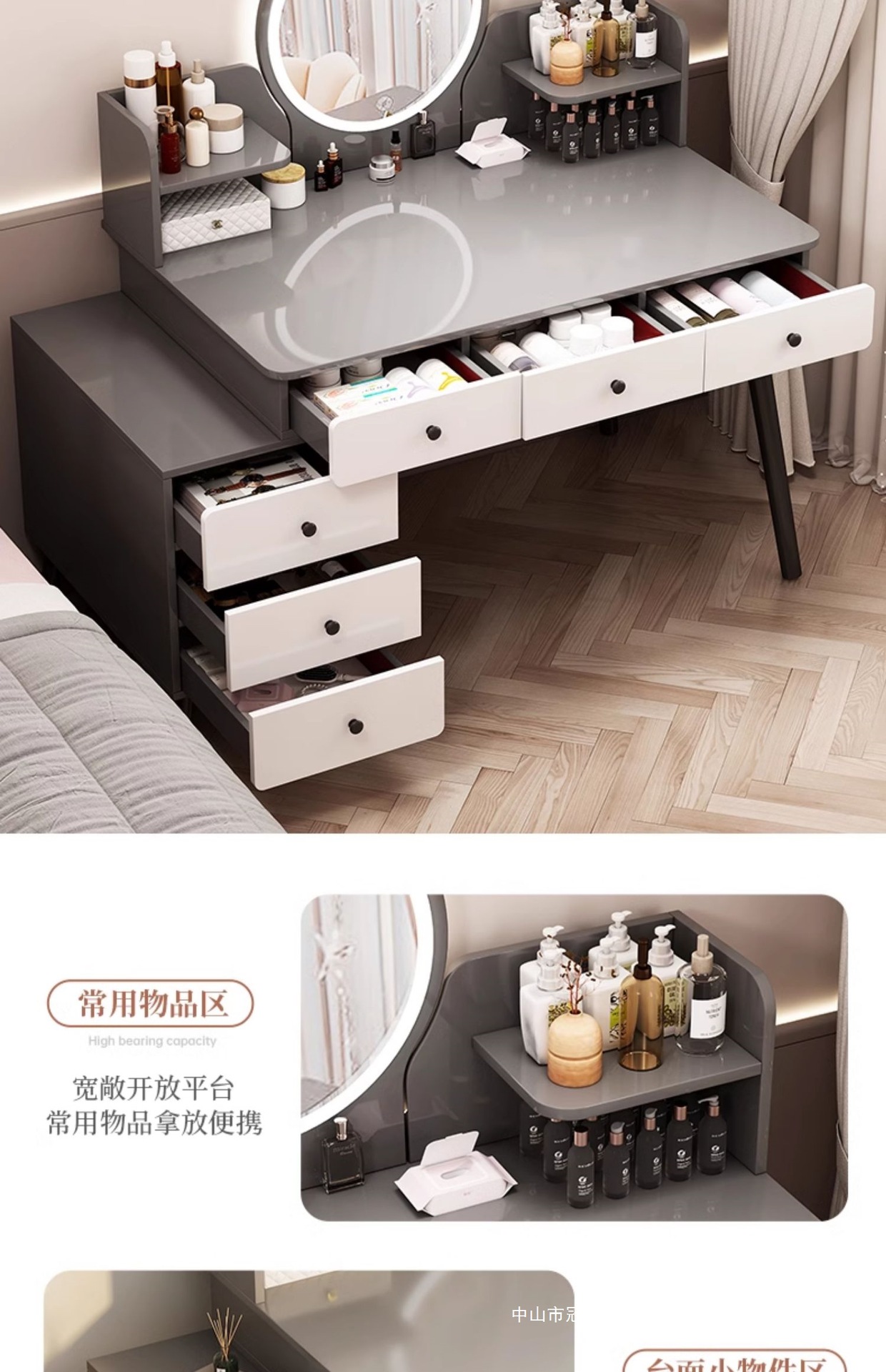 메인 사진 싱글 테이블 모델 [서랍 6개 + 사이드 캐비닛 + LED 스마트 거울] 100-120cm 모란디 그레이