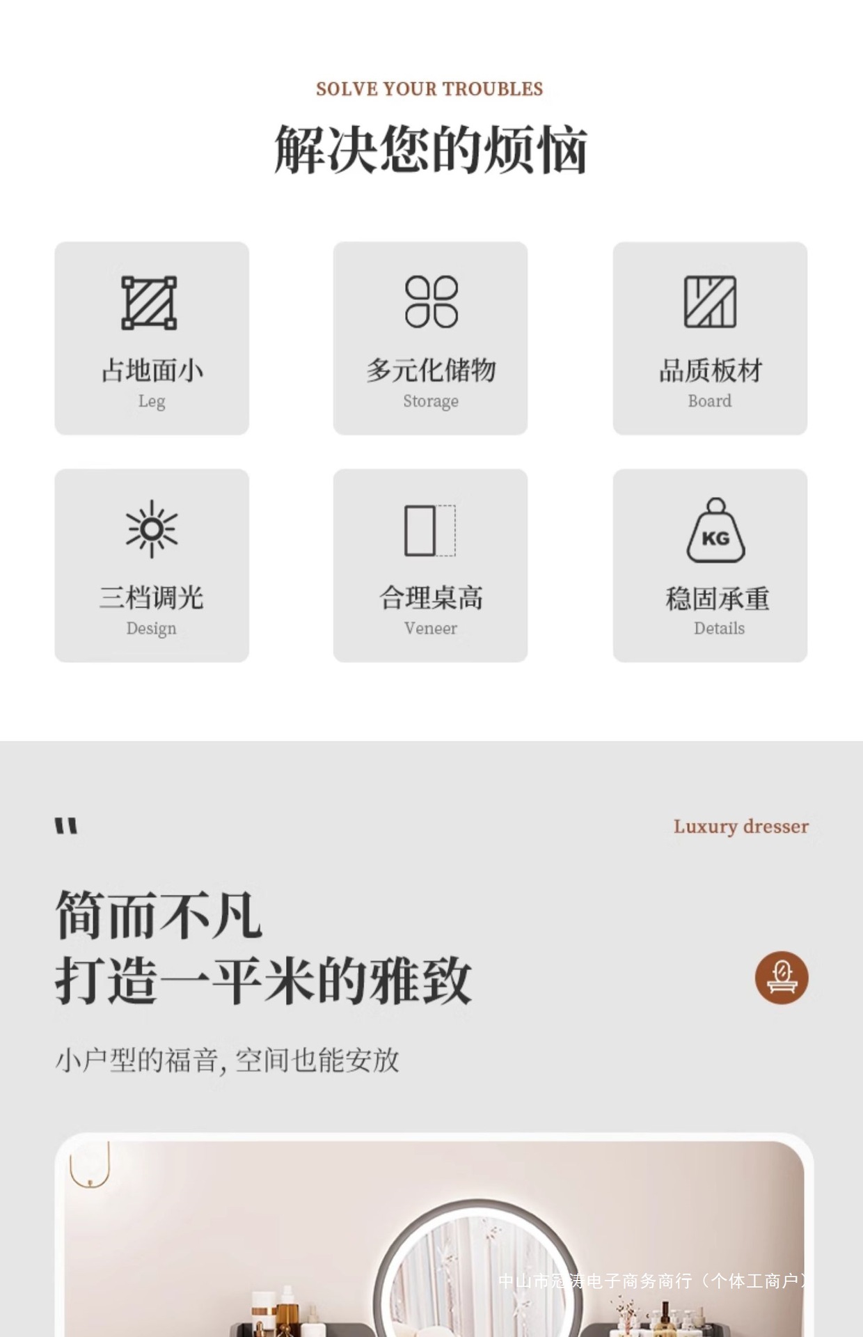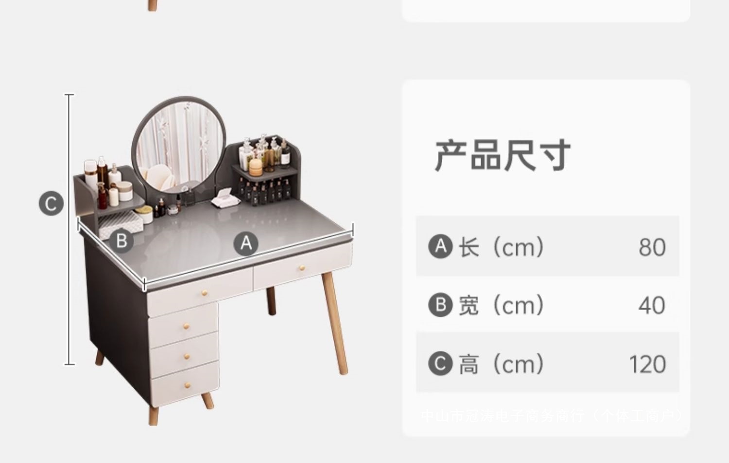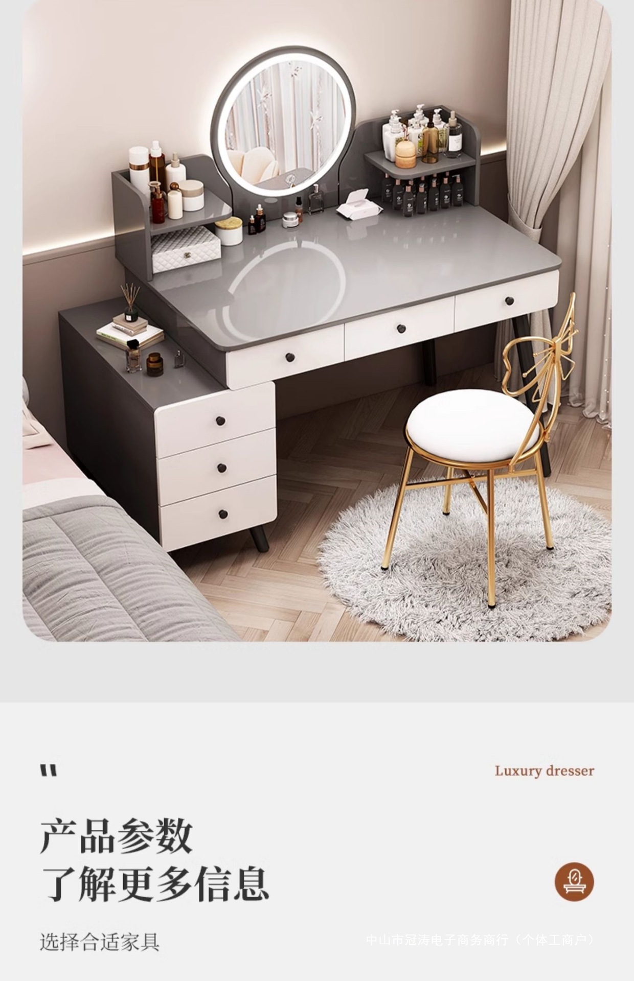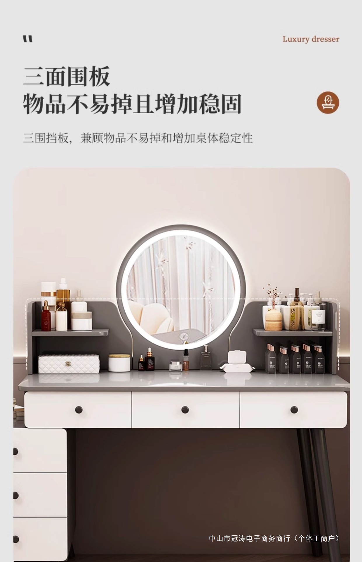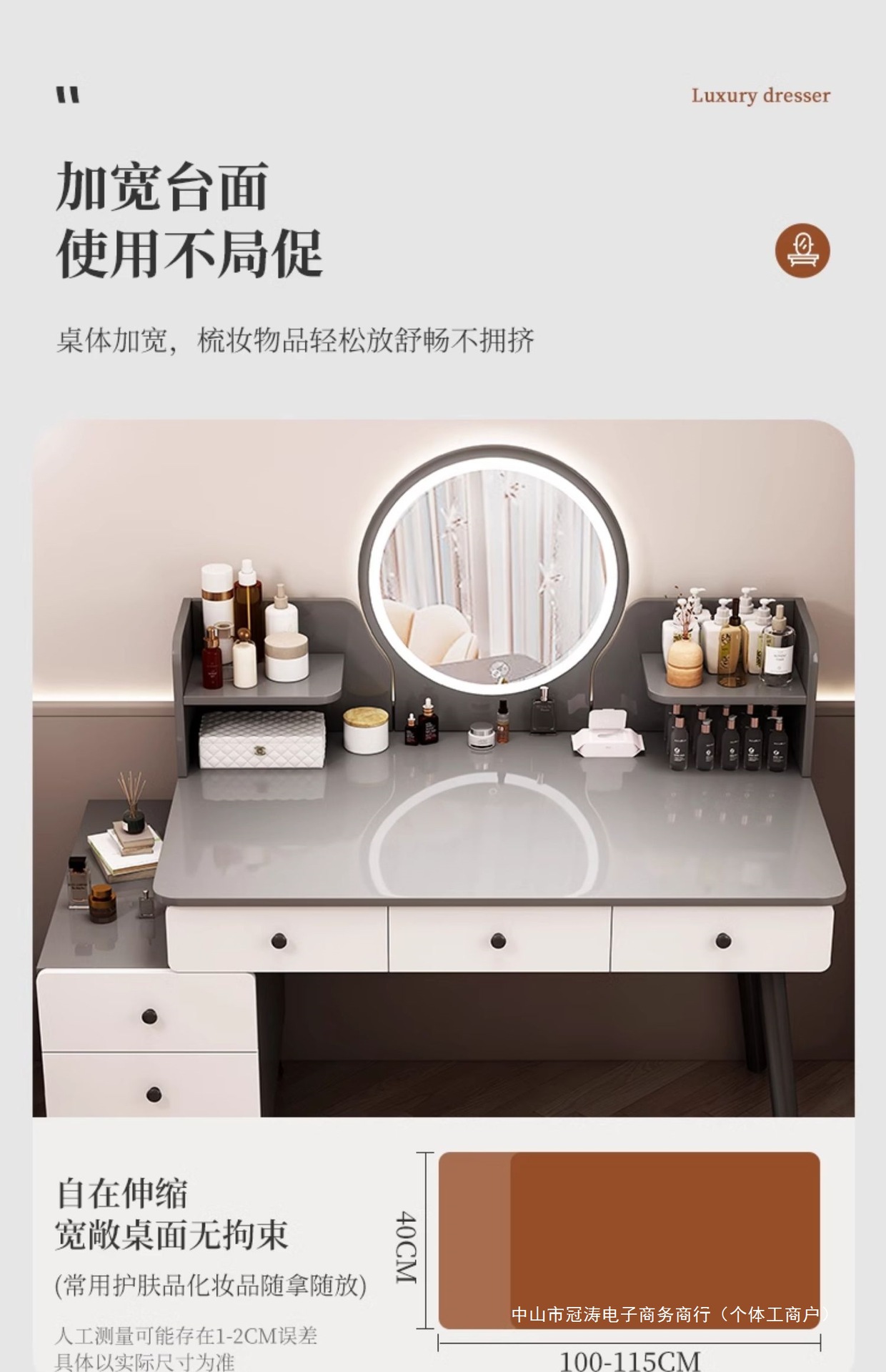 메인 사진 싱글 테이블 모델 [서랍 6개 + 사이드 캐비닛 + LED 스마트 거울] 100-120cm 모란디 그레이