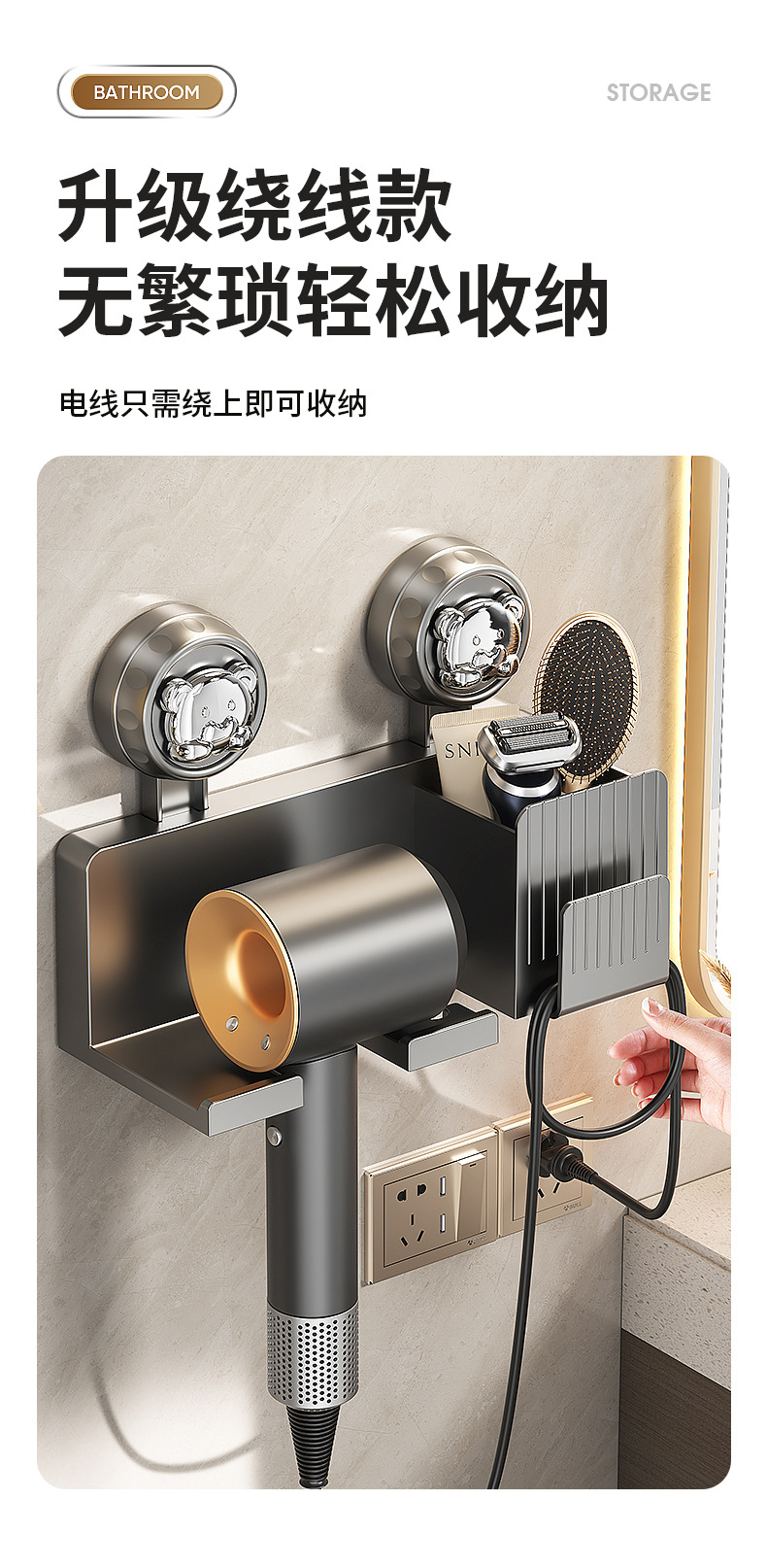 [건그레이-라지] 흡입컵 헤어드라이어 홀더(보관함 포함)
