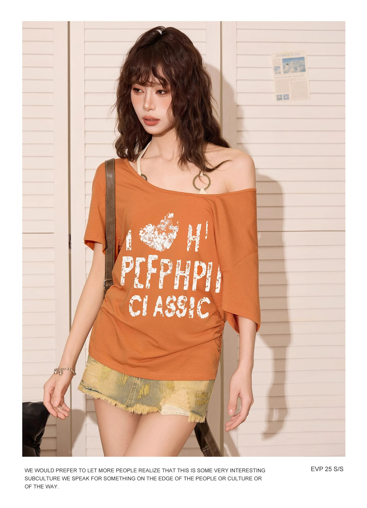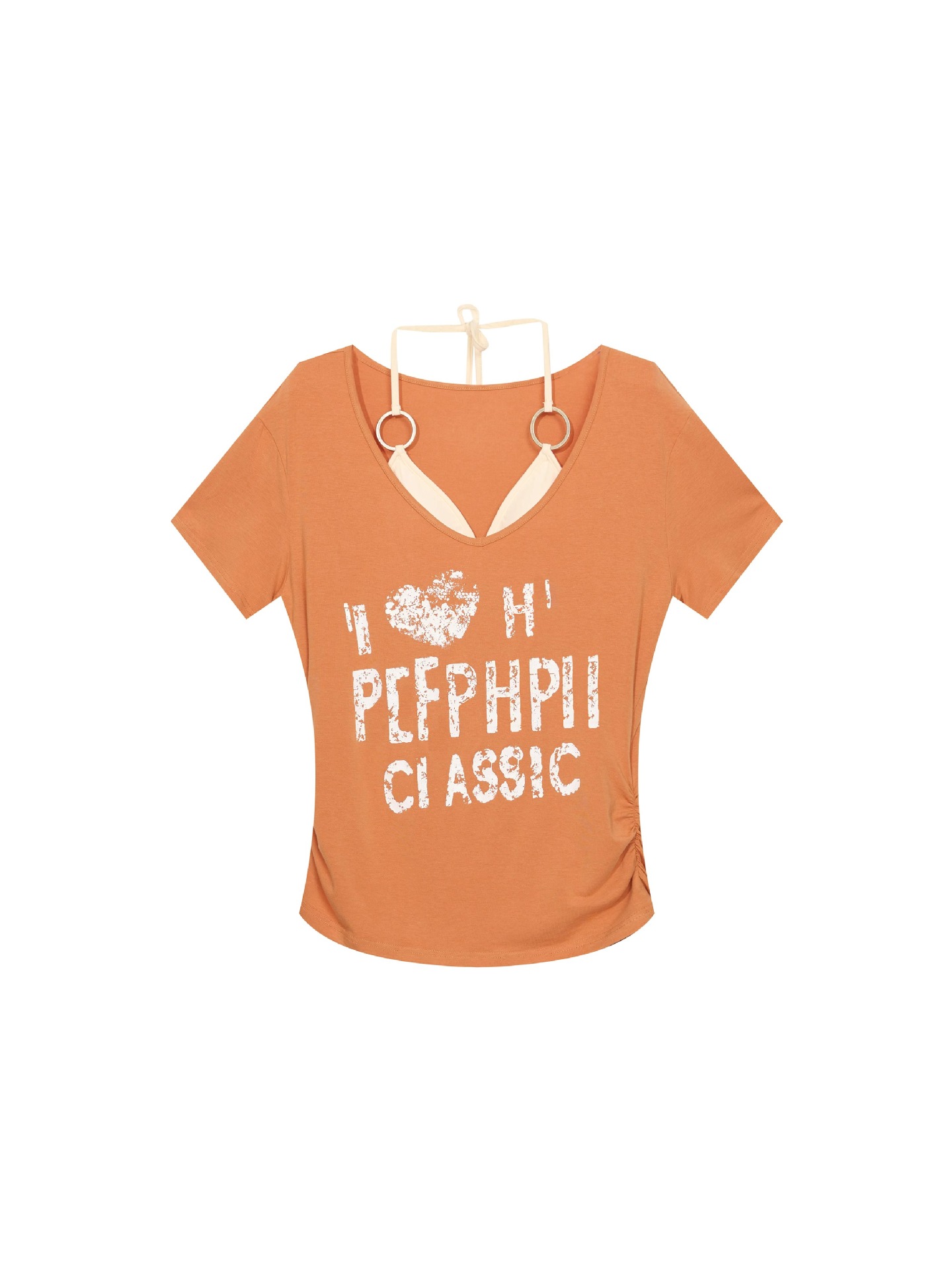 200g 레이온 도파민 아메리칸 오렌지 홀터넥 슬링 반팔 티셔츠 여름 루즈한 오프숄더 핫걸 탑