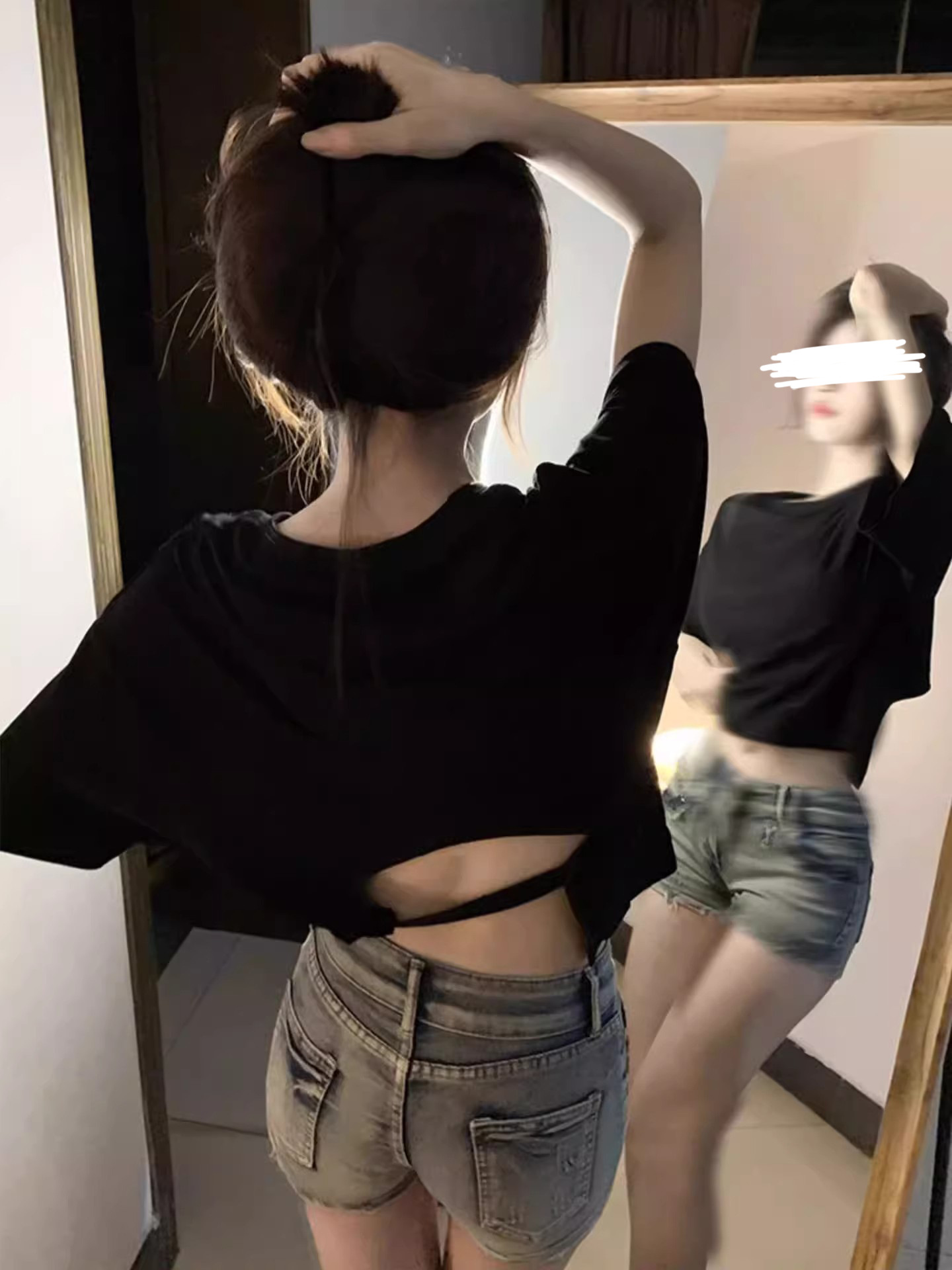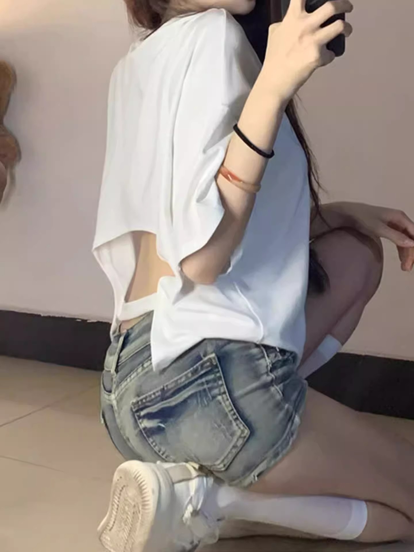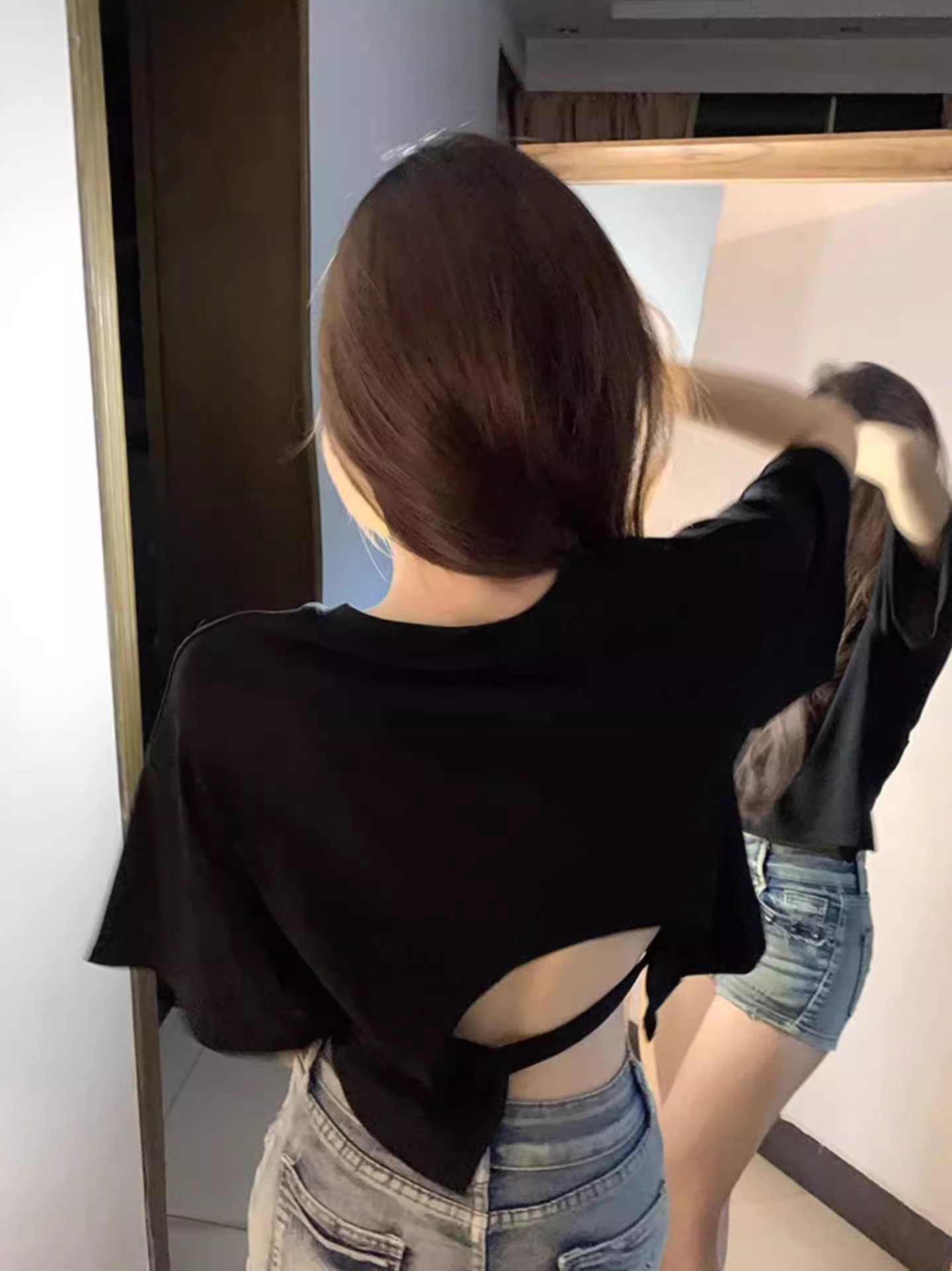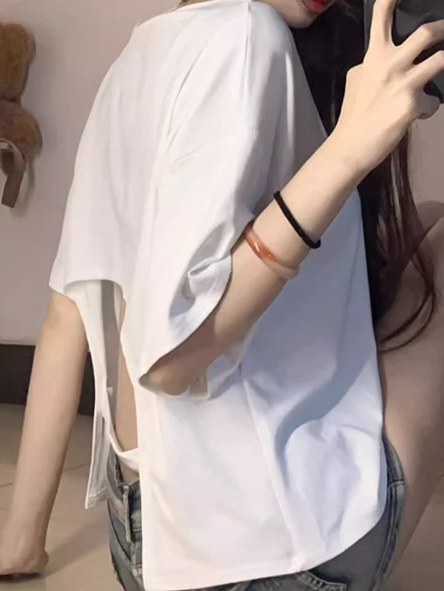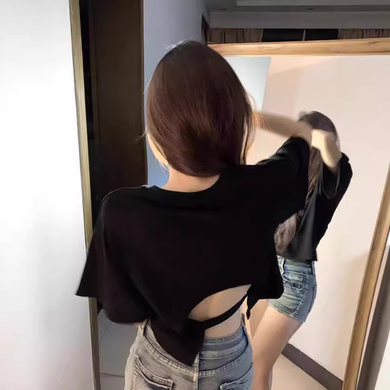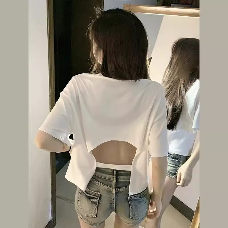 Xinyu 백리스 쇼트 티셔츠, 뒷면이 빈 밑단 셔츠, 한국식 여름 신작 라운드 넥 루즈 반팔 탑 트렌디