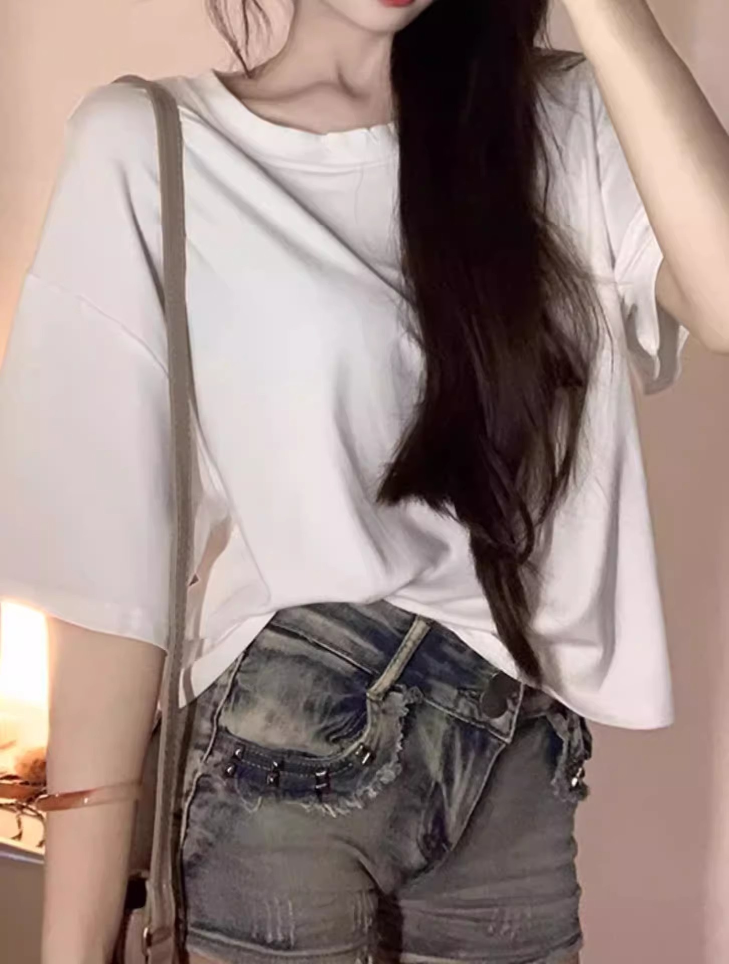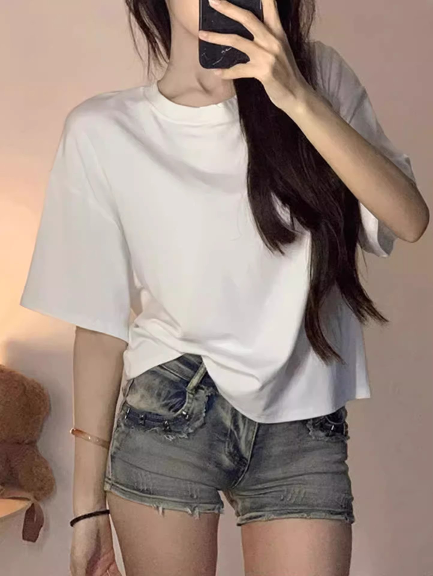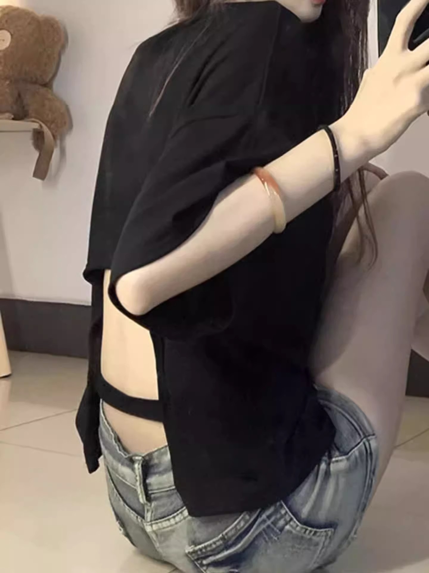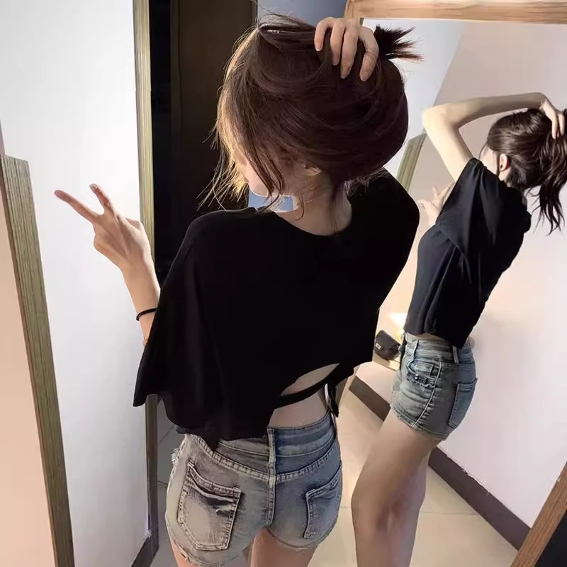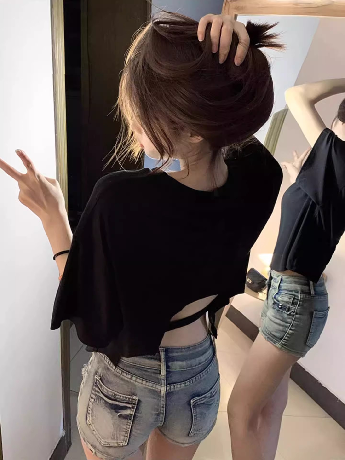 Xinyu 백리스 쇼트 티셔츠, 뒷면이 빈 밑단 셔츠, 한국식 여름 신작 라운드 넥 루즈 반팔 탑 트렌디