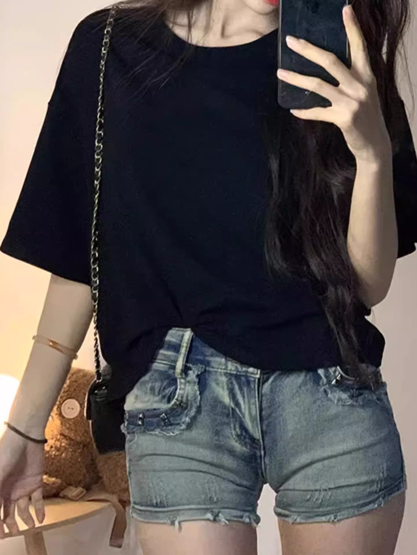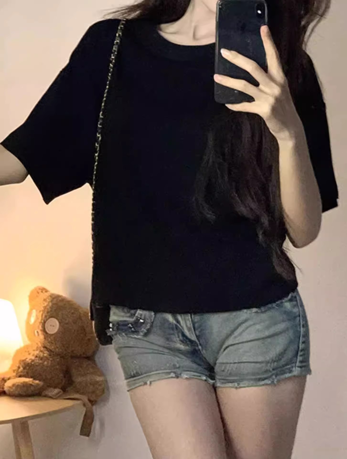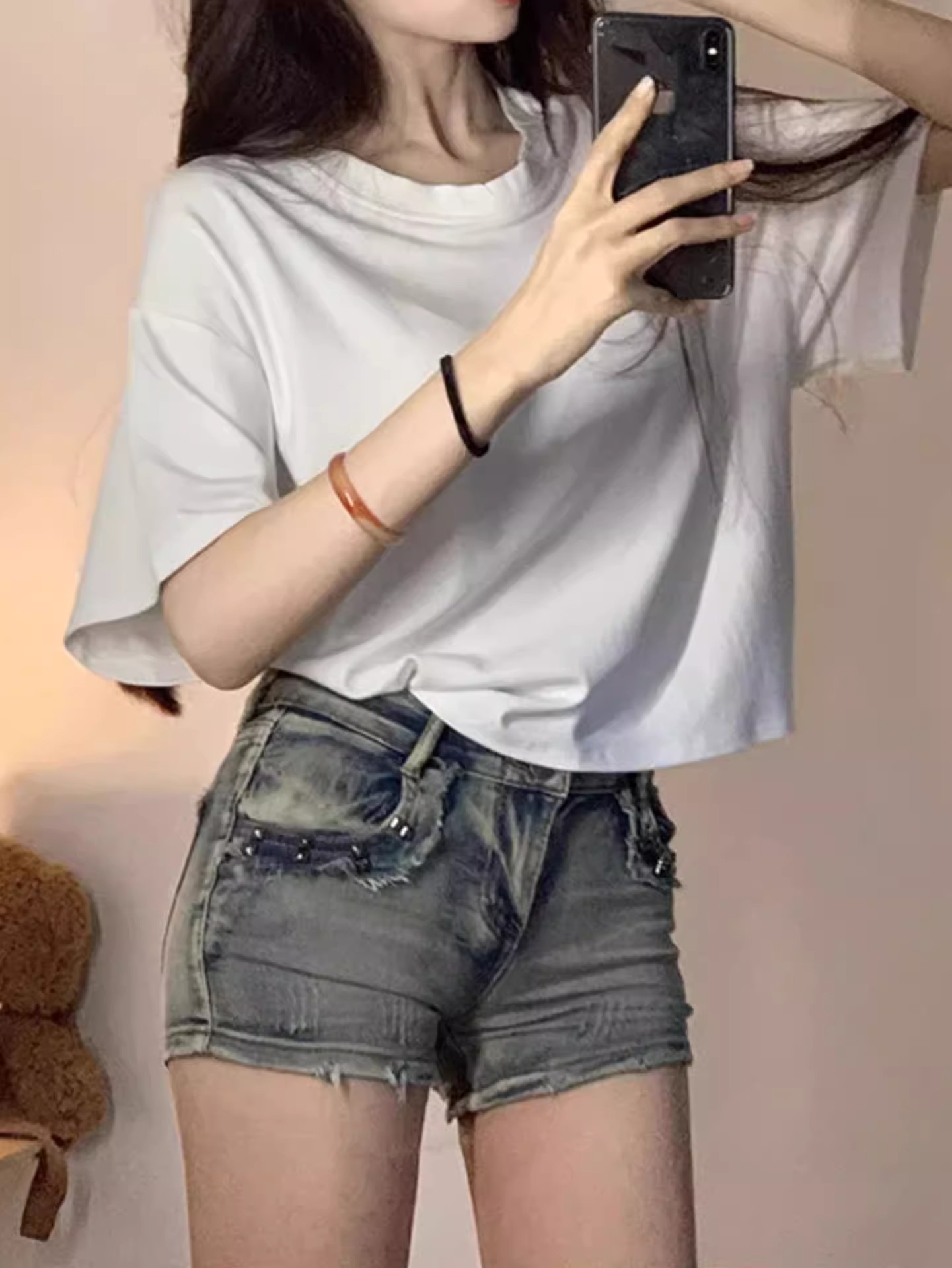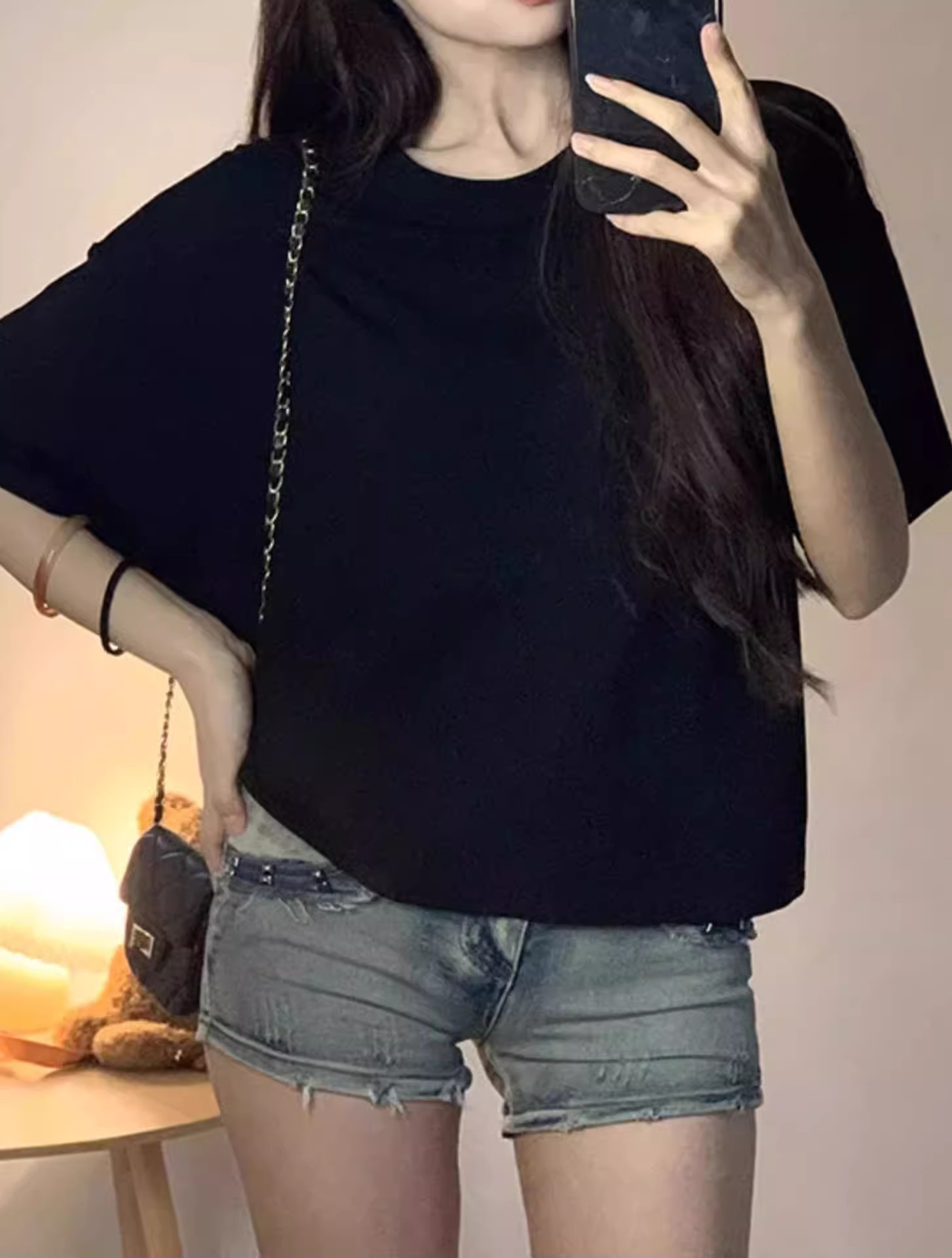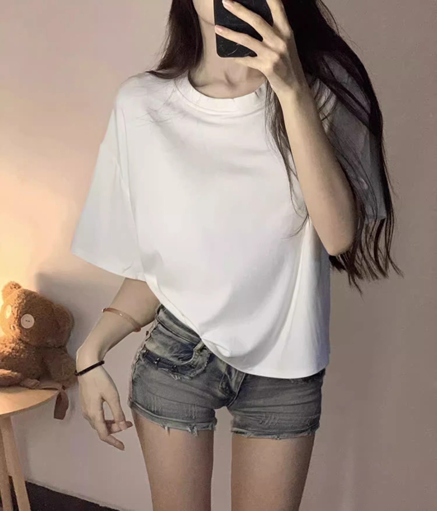 Xinyu 백리스 쇼트 티셔츠, 뒷면이 빈 밑단 셔츠, 한국식 여름 신작 라운드 넥 루즈 반팔 탑 트렌디