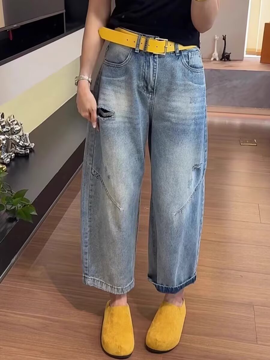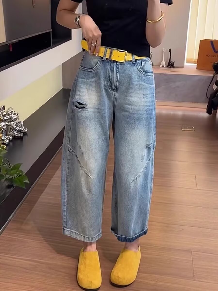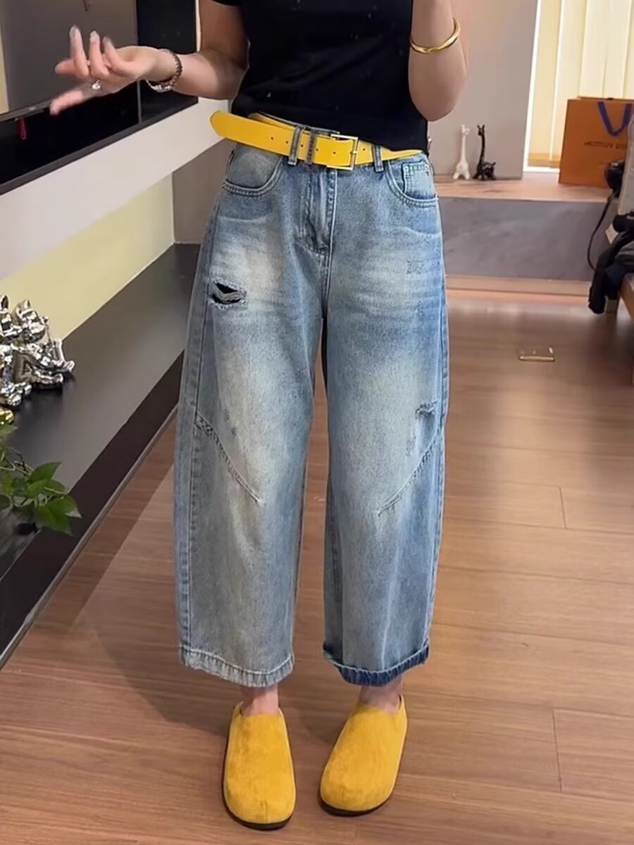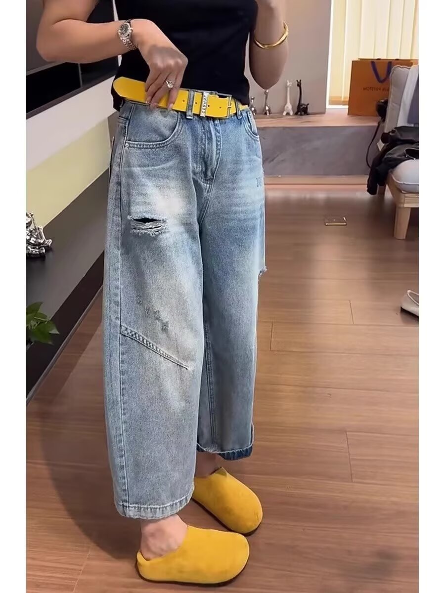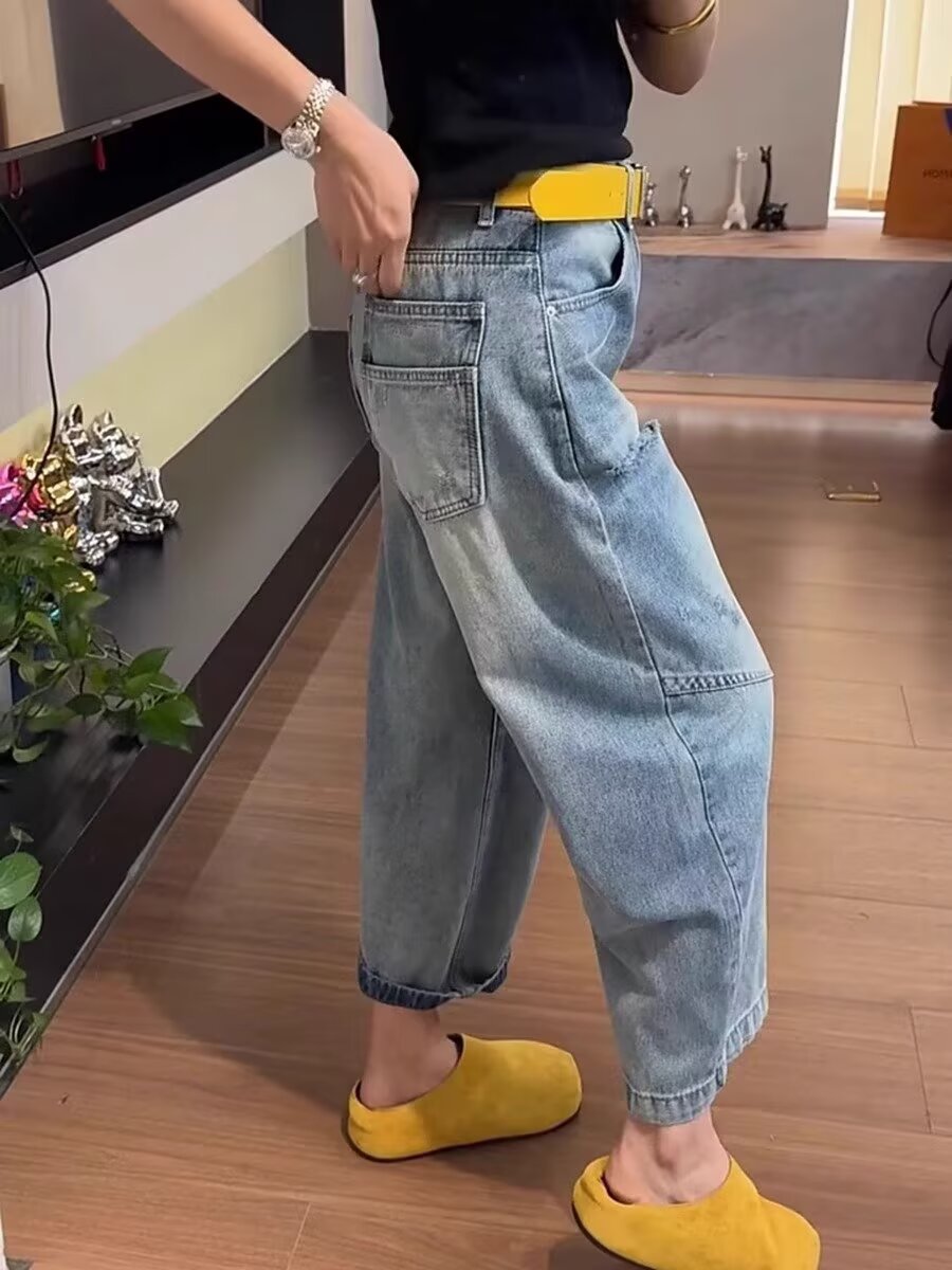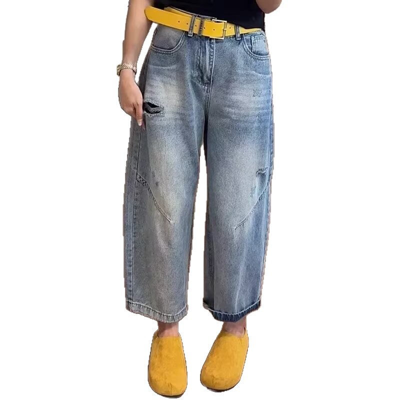 여름 신상품 여성용 빅사이즈 찢어진 9부 하렘 청바지, 뚱뚱한 mm, 루즈한 당근팬츠, 와이드팬츠