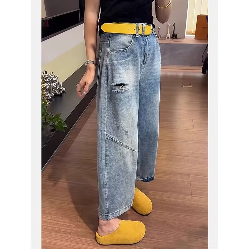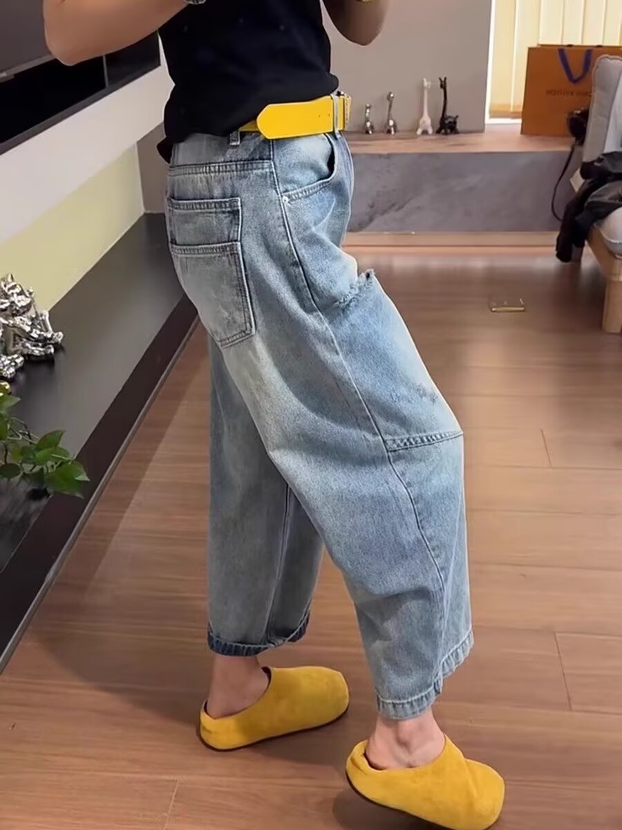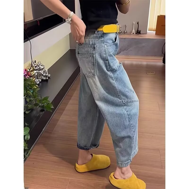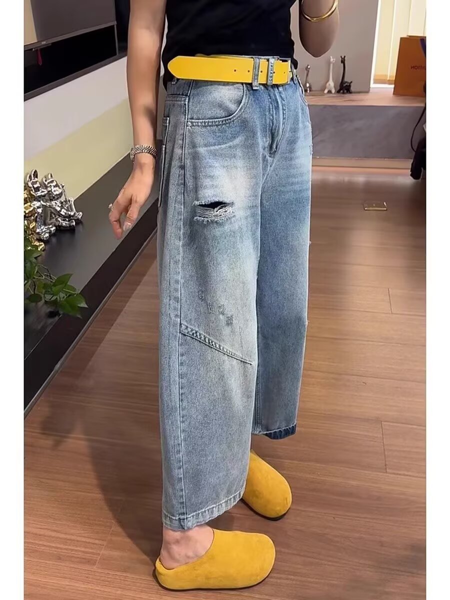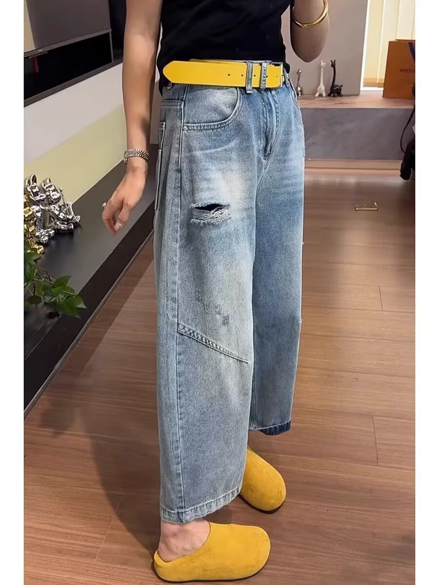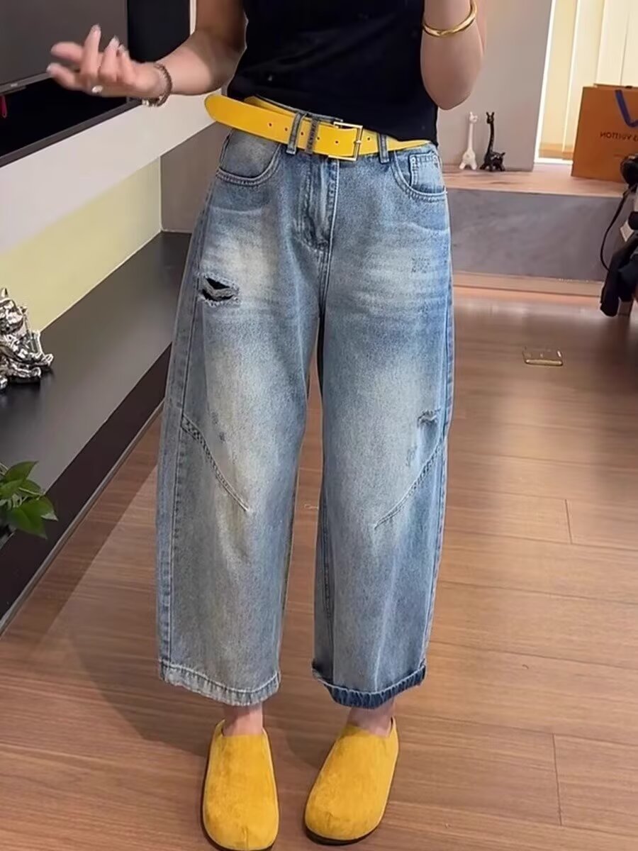 여름 신상품 여성용 빅사이즈 찢어진 9부 하렘 청바지, 뚱뚱한 mm, 루즈한 당근팬츠, 와이드팬츠