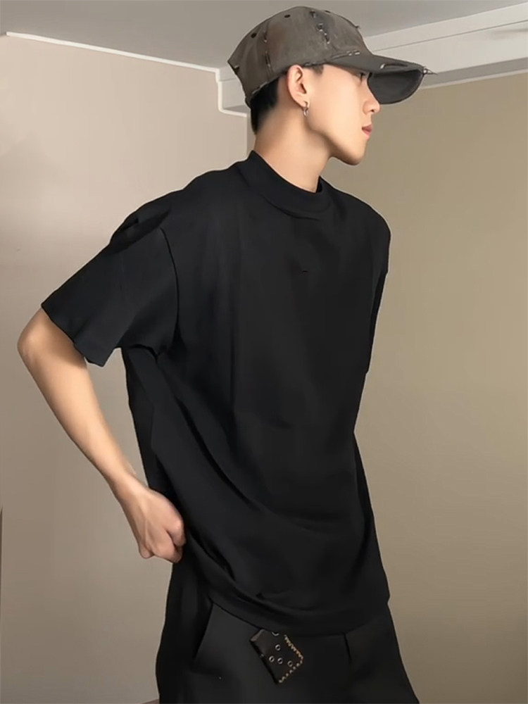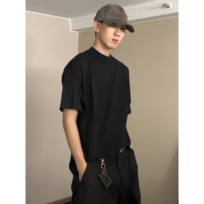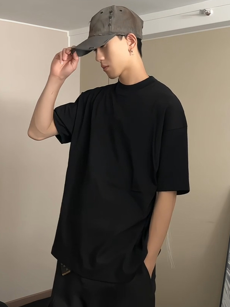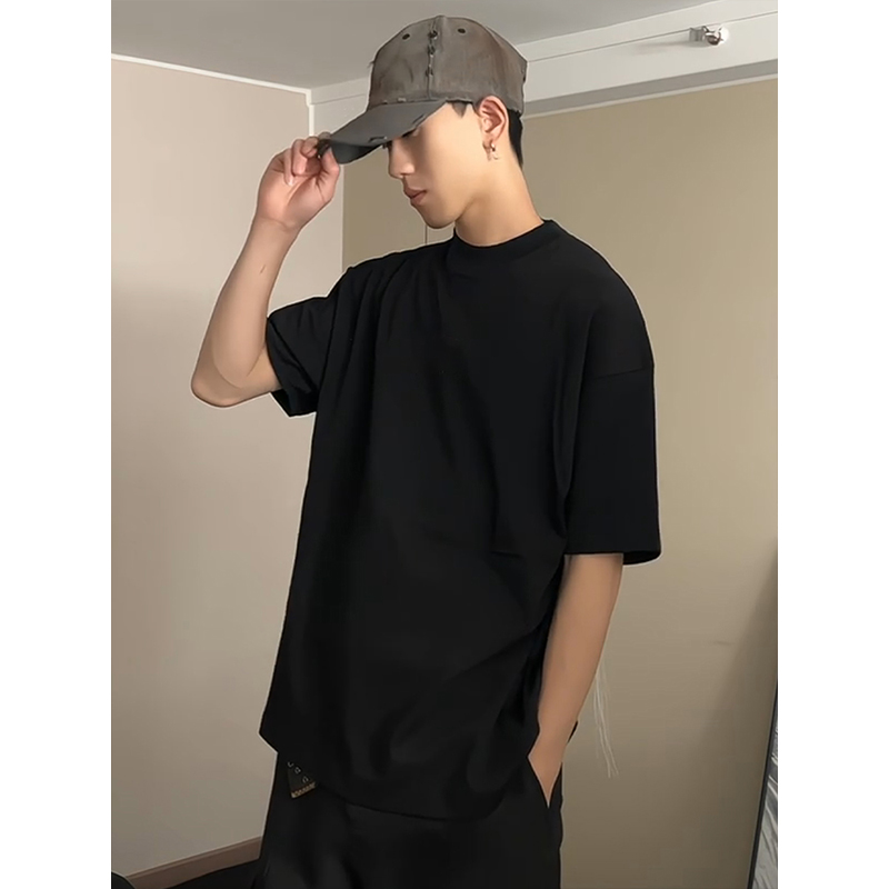Cleanfit 블랙 퓨어 코튼 반팔 티셔츠 남성 여름 미국 하이 엔드 스몰 넥라인 오른쪽 어깨 반소매