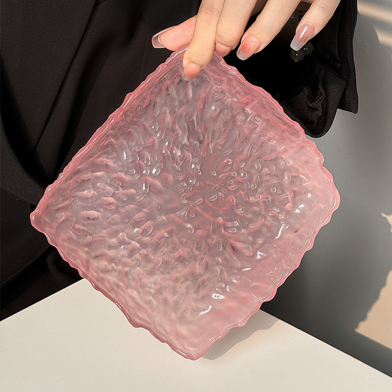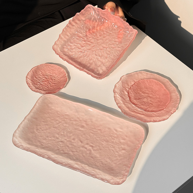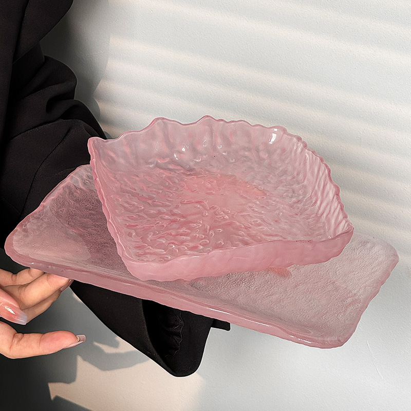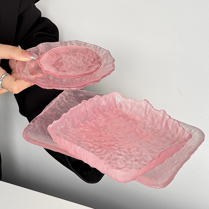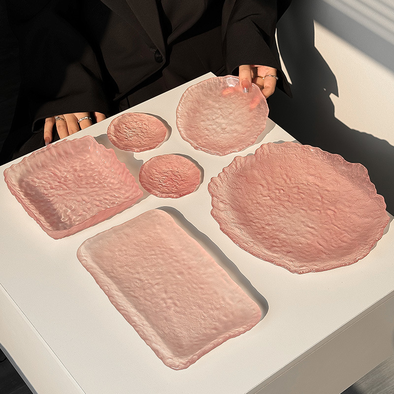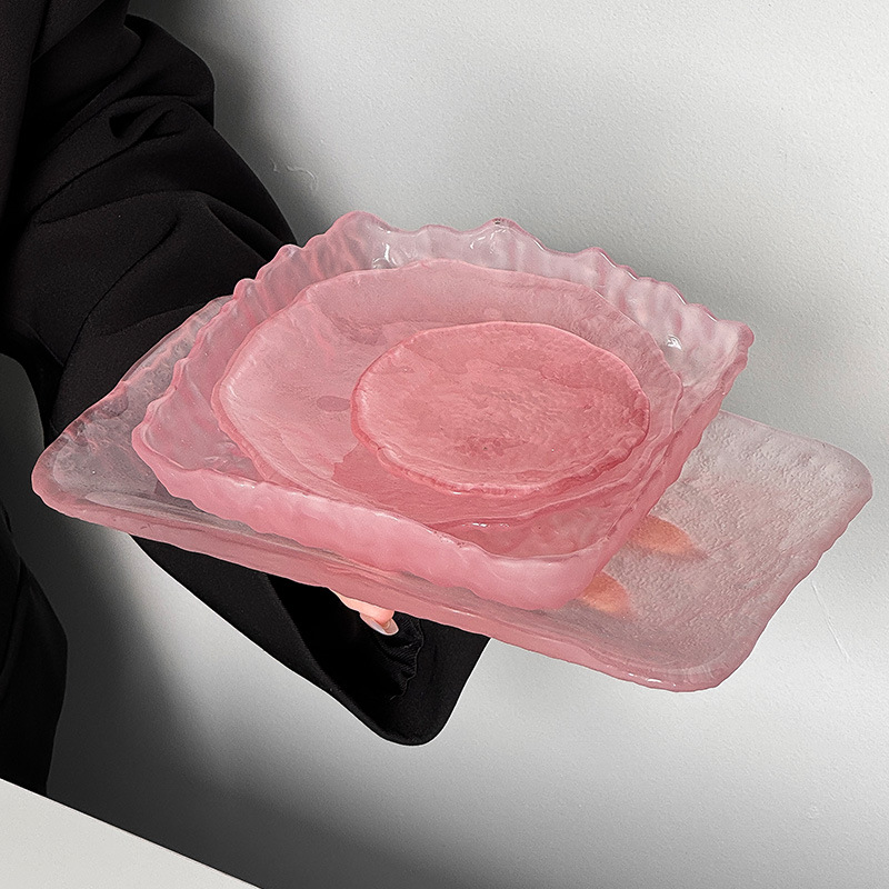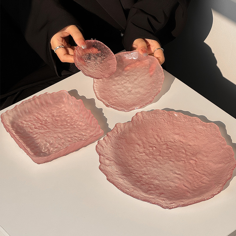 하이 엔드 핑크 불규칙한 얼음 이슬 유리 접시 가정용 스낵 접시 과일 접시 라운드 디저트 트레이 식기