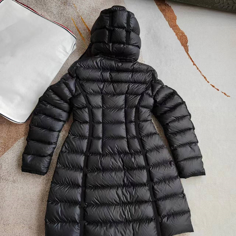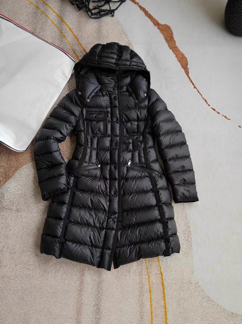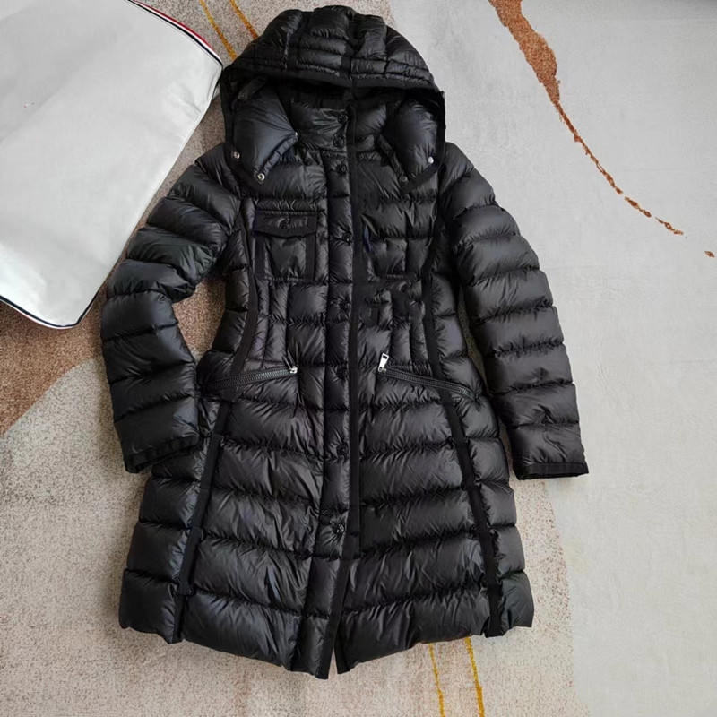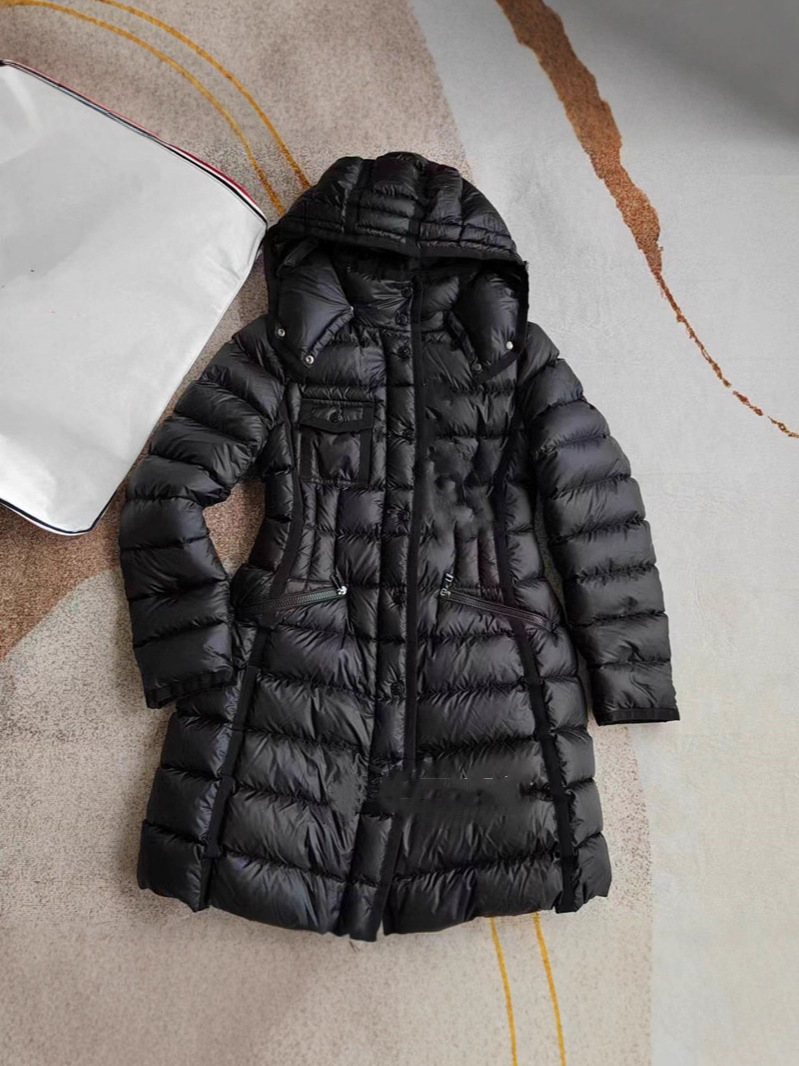클래식 MM 여성용 스탠드 칼라 탈착식 후드 중간 길이 드로스트링 슬림핏 체크 무늬 웨빙 엣지 다운 재킷 여성용