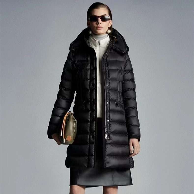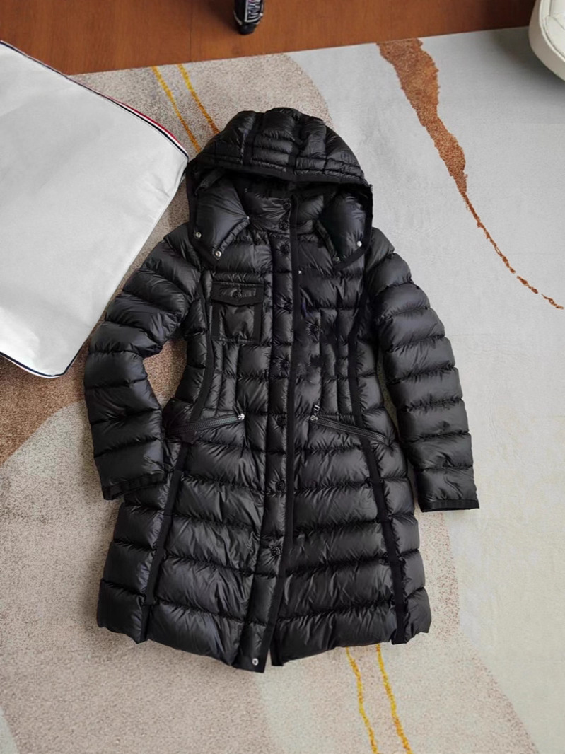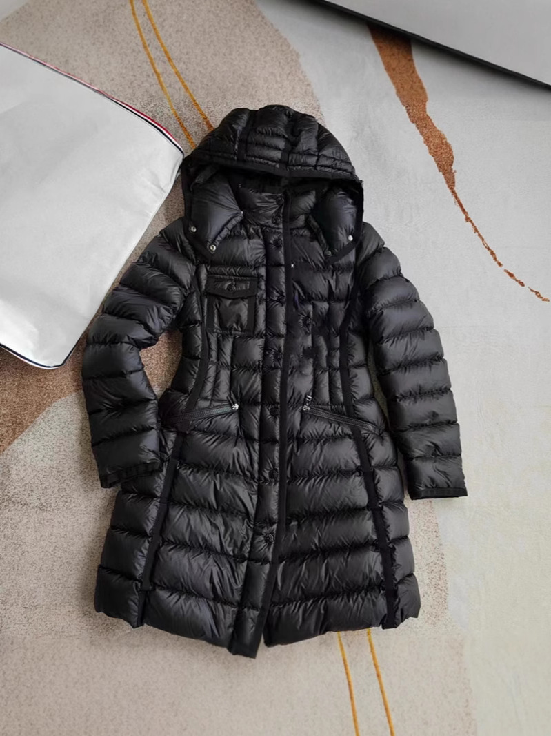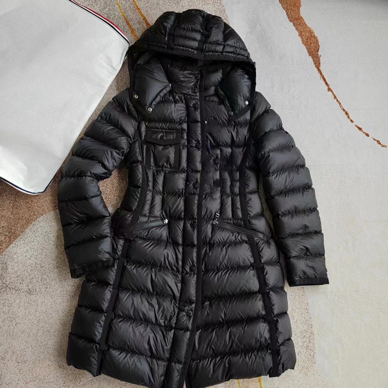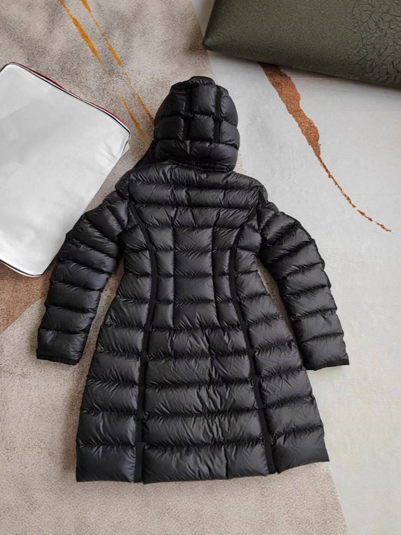 클래식 MM 여성용 스탠드 칼라 탈착식 후드 중간 길이 드로스트링 슬림핏 체크 무늬 웨빙 엣지 다운 재킷 여성용