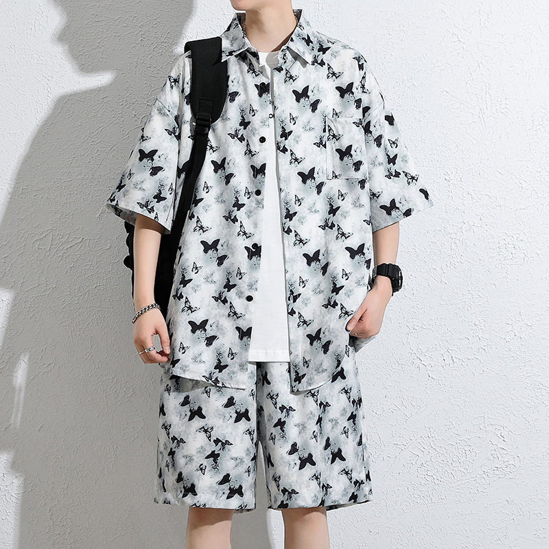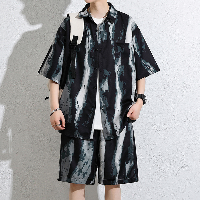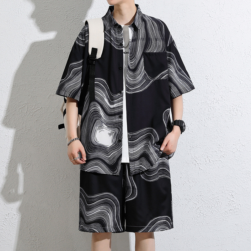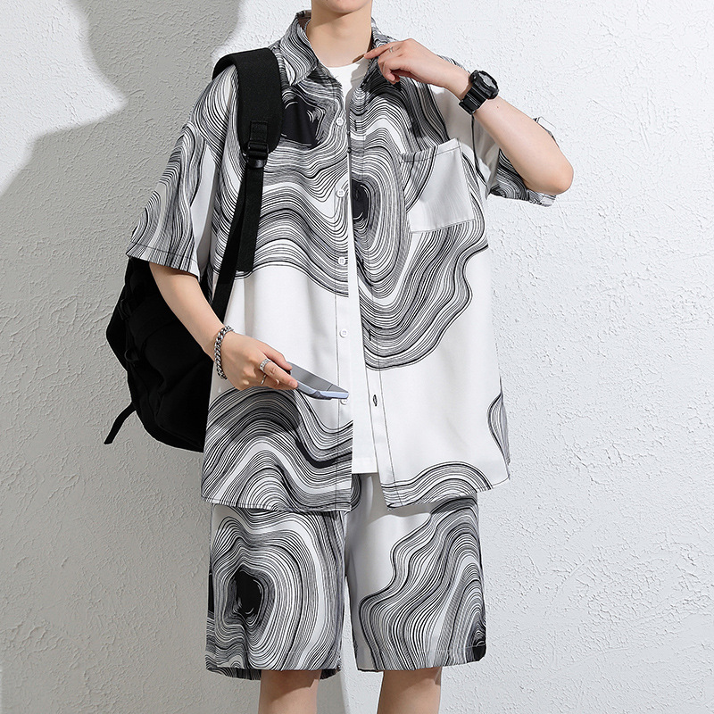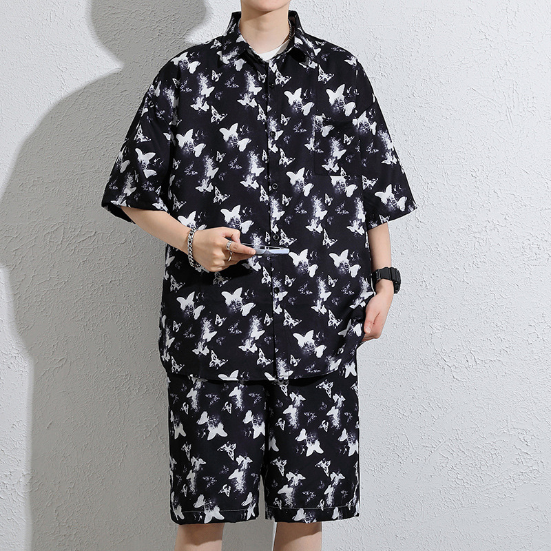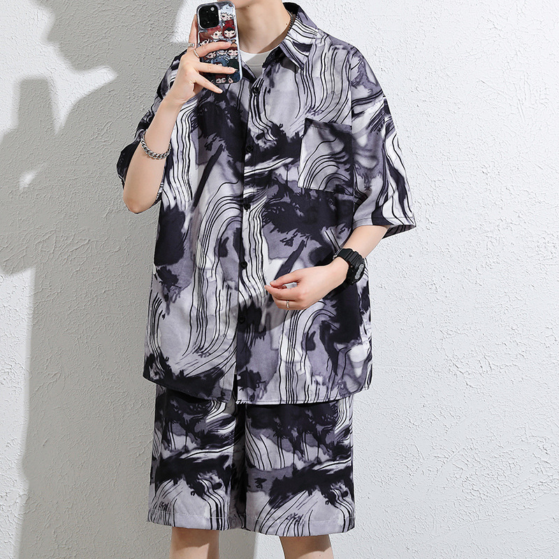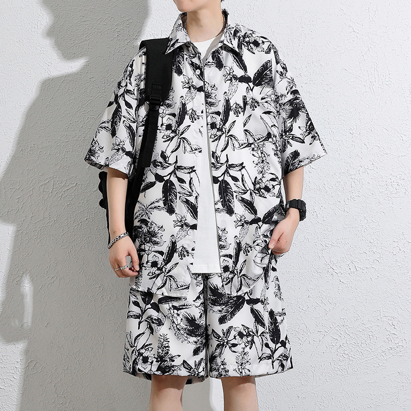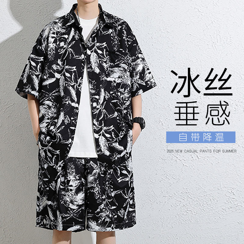 아이스 실크 비치 셔츠 정장 남성 여름 유행 느슨한 대형 남성 반바지 꽃 셔츠 소년 해변 착용