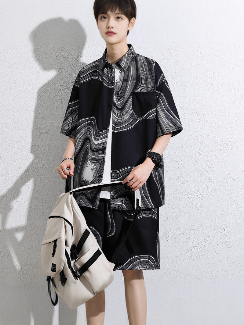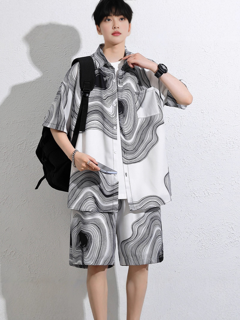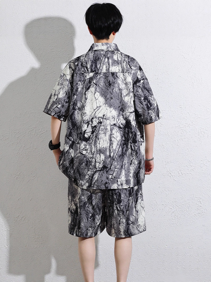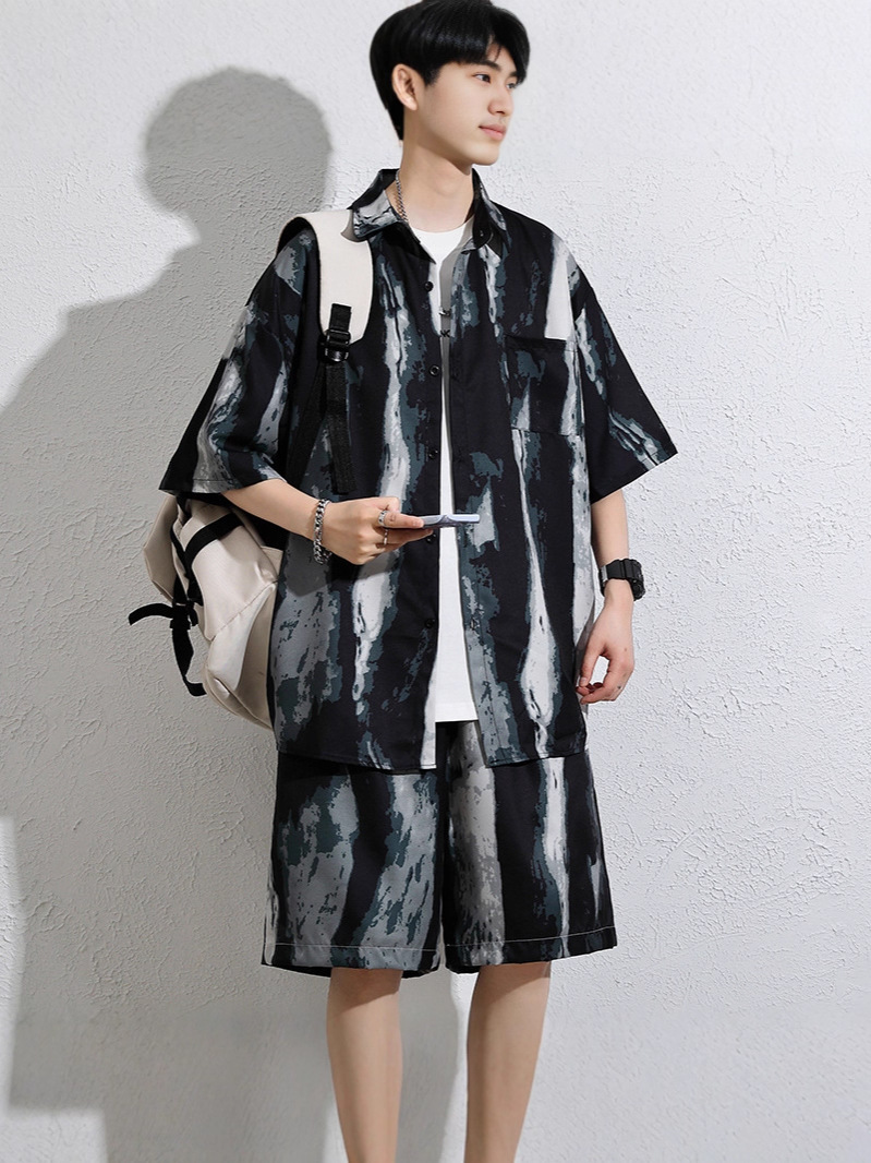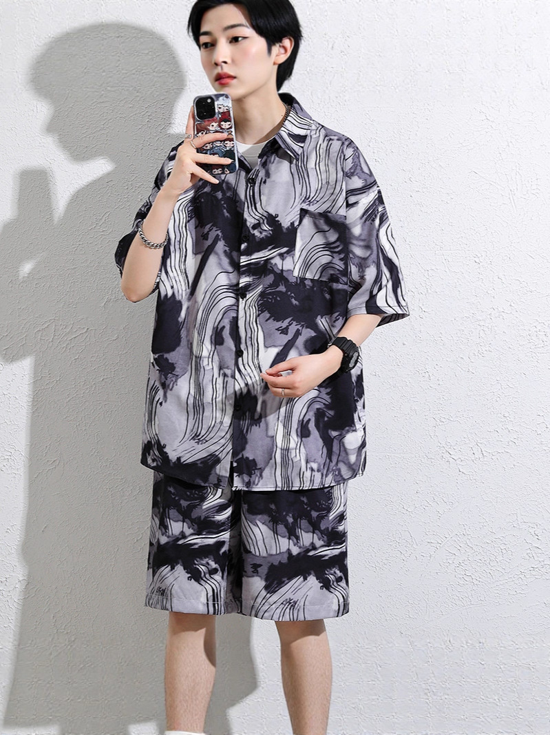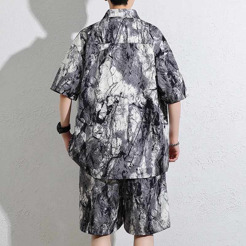 아이스 실크 비치 셔츠 정장 남성 여름 유행 느슨한 대형 남성 반바지 꽃 셔츠 소년 해변 착용