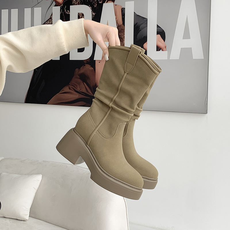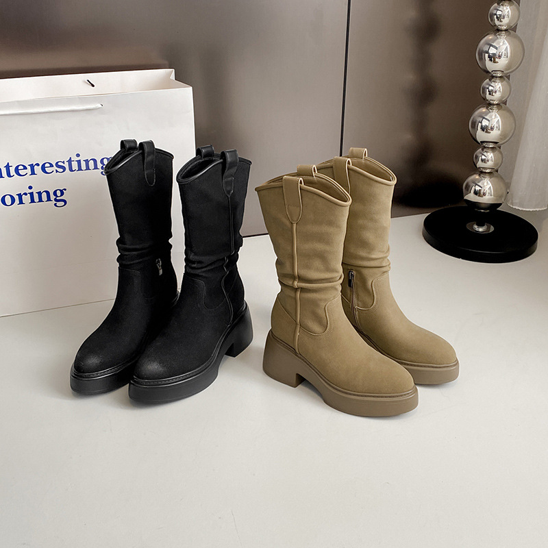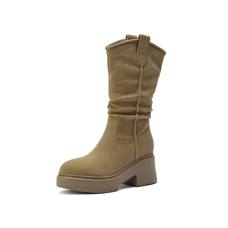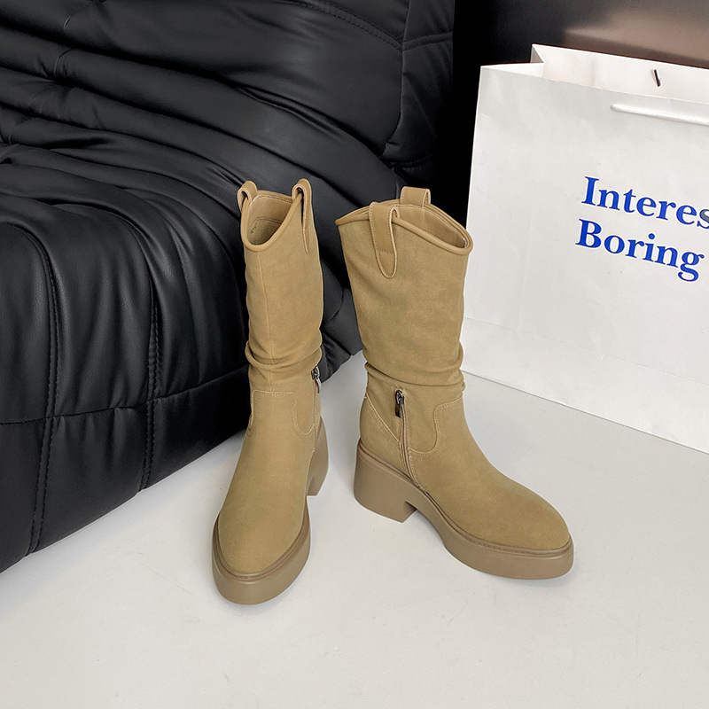 주름 장식 롱부츠 여성용 2025 가을 신상 웨스턴 카우보이 부츠 여성용 뾰족코 키높이 힐 라이더 부츠