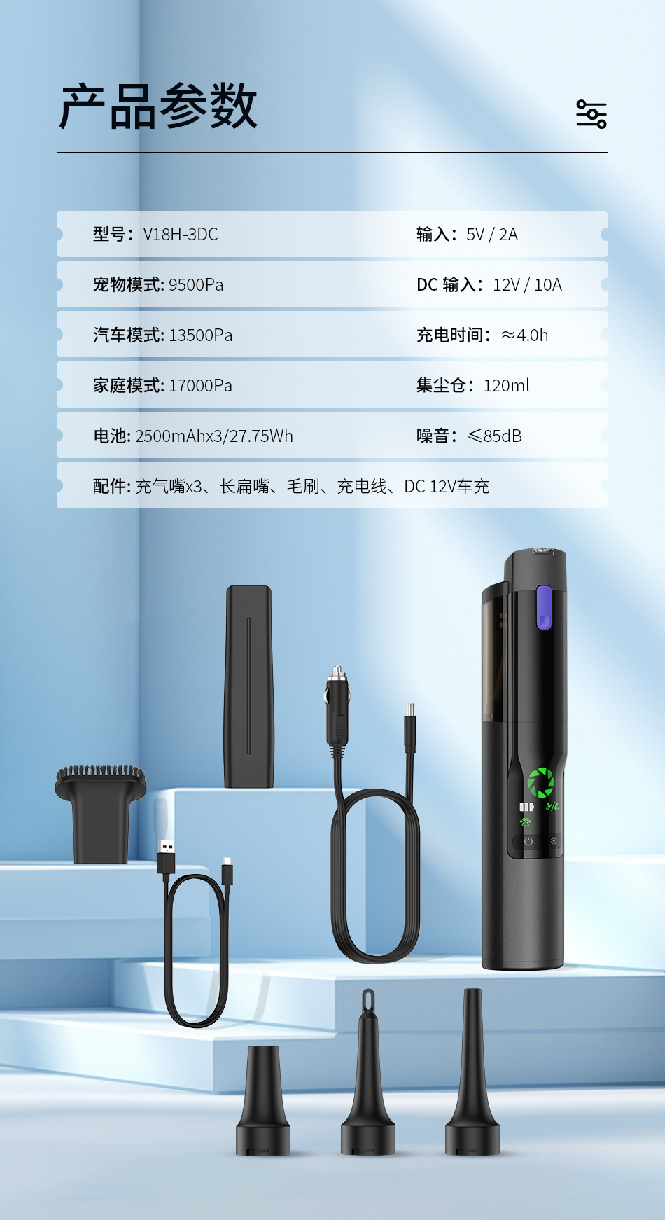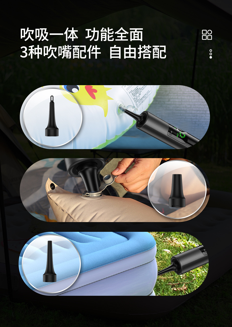 配件:充气嘴×3、长扁嘴、毛刷、充电线、DC12V车充
