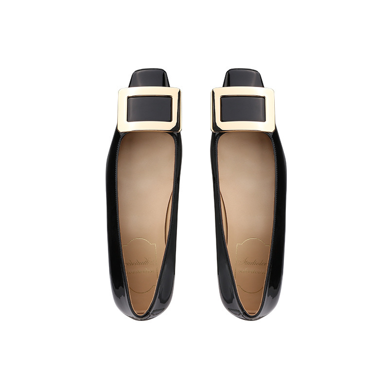 2025 봄 신상 스퀘어 버튼 페이턴트 가죽 슈즈, 여성스러운 밀크티 컬러 스퀘어 토 두꺼운 굽 페이턴트 가죽 엘리펀트 그레이 플랫 슈즈
