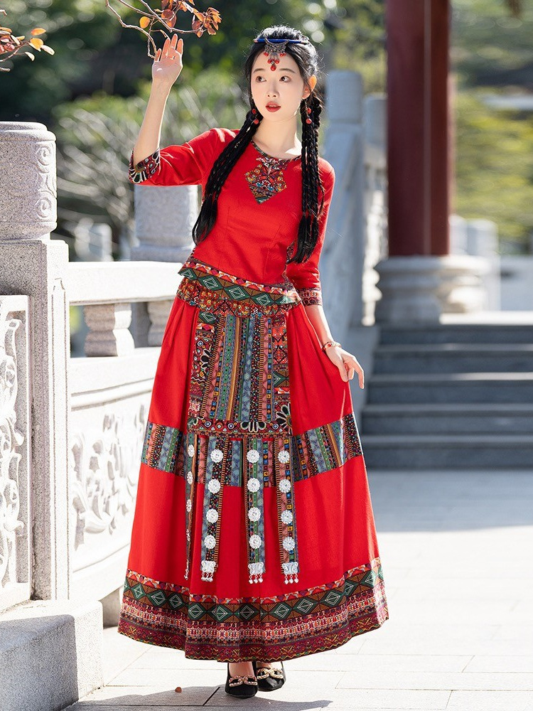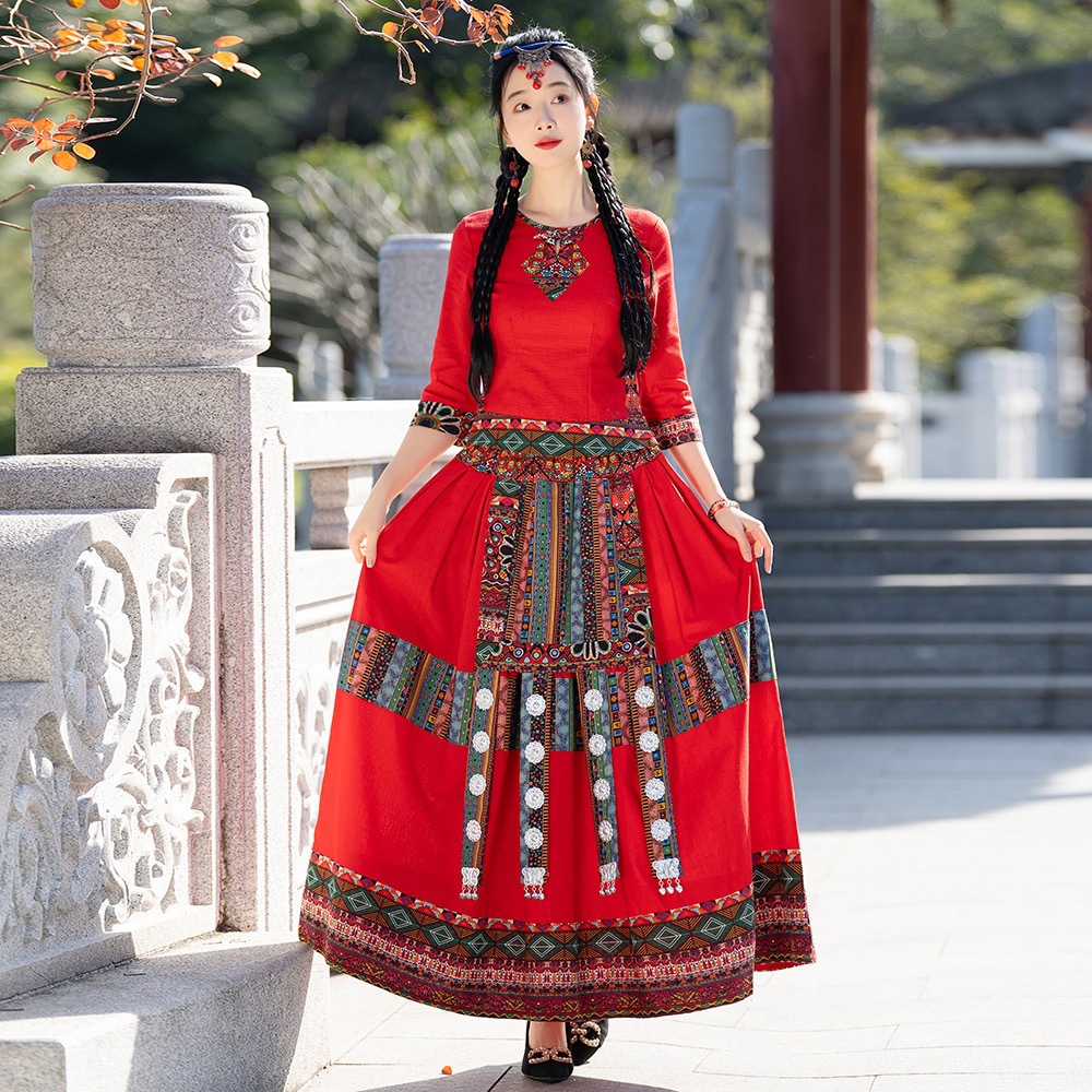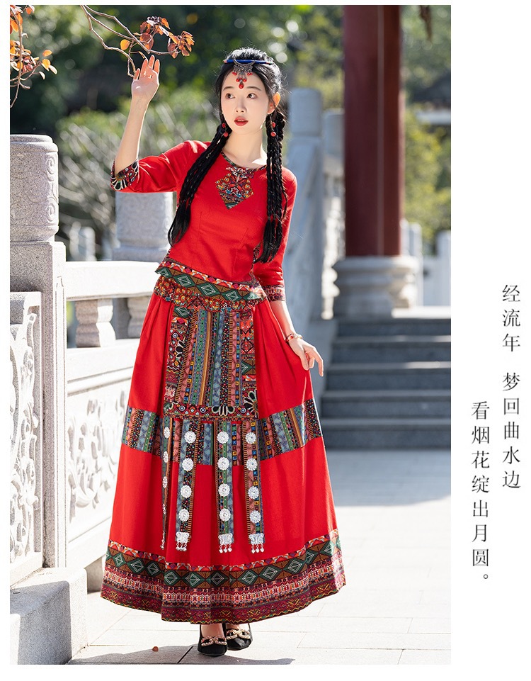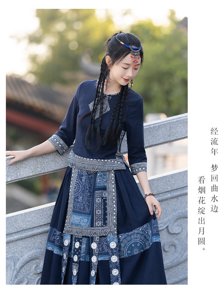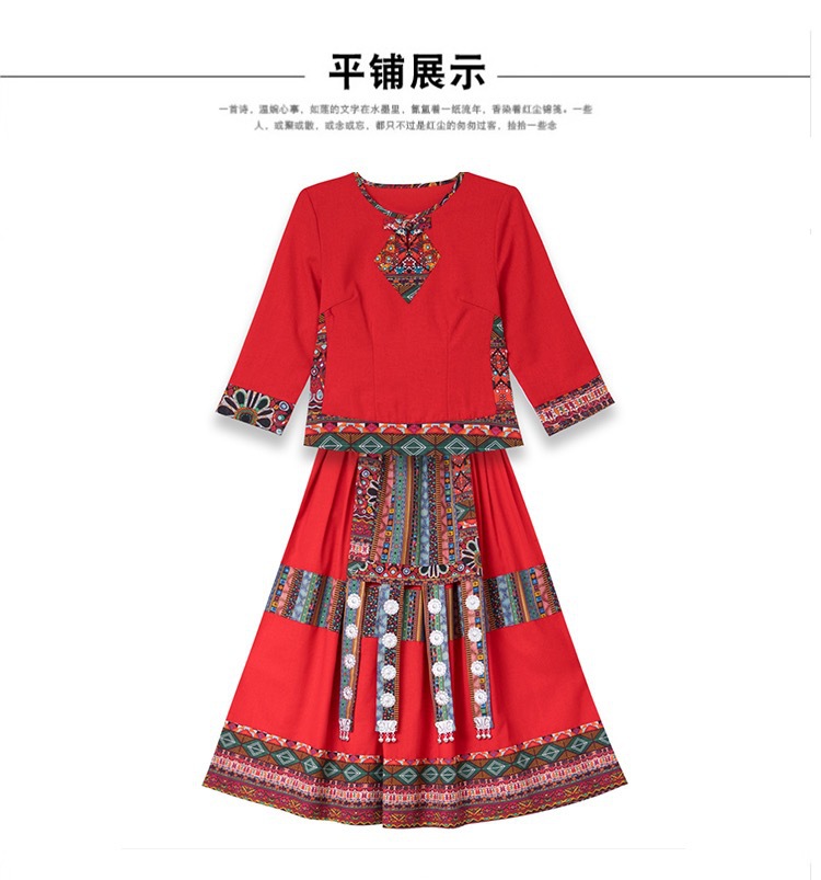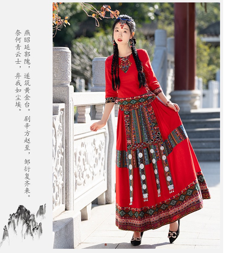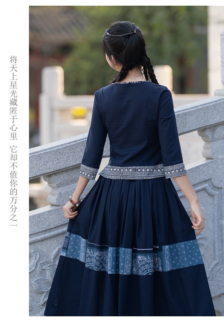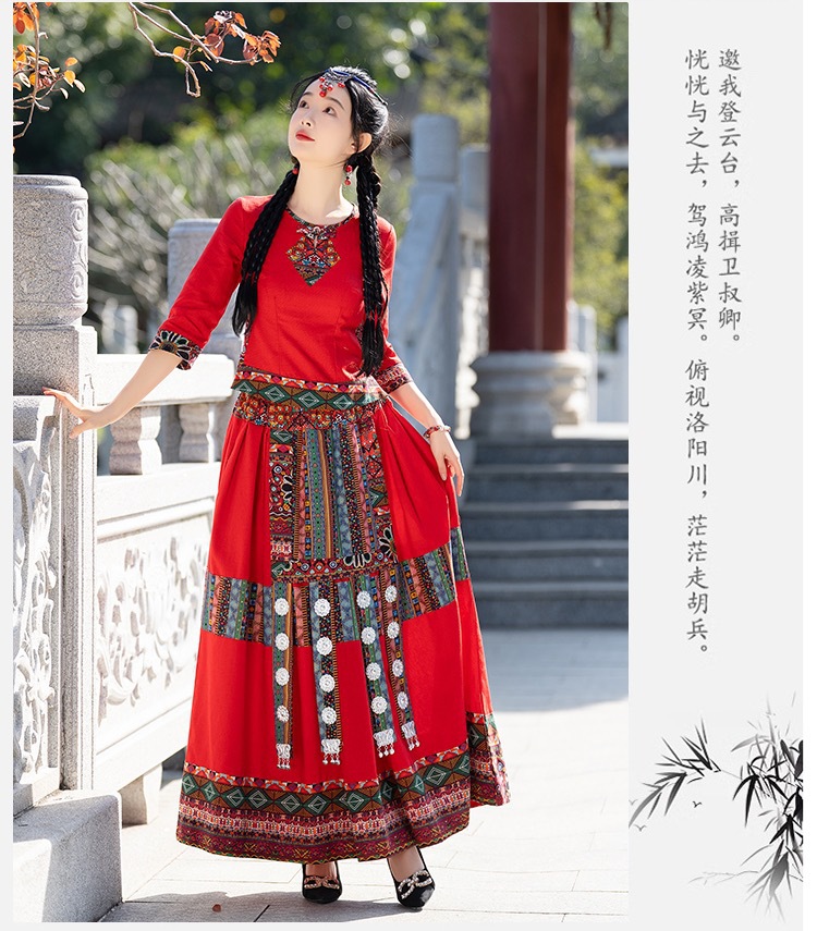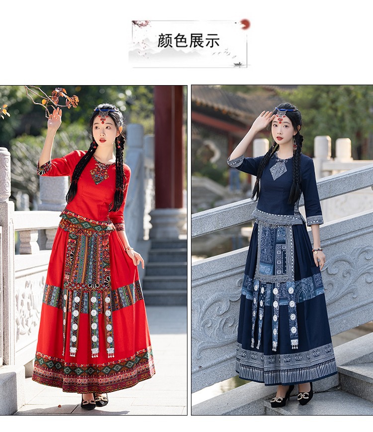 여성을 위한 중국 스타일 슈트, 민족 스타일 자수 탑과 스커트 투피스 세트, 봄 여름 공연 의상, 면 및 린넨 댄스 의상