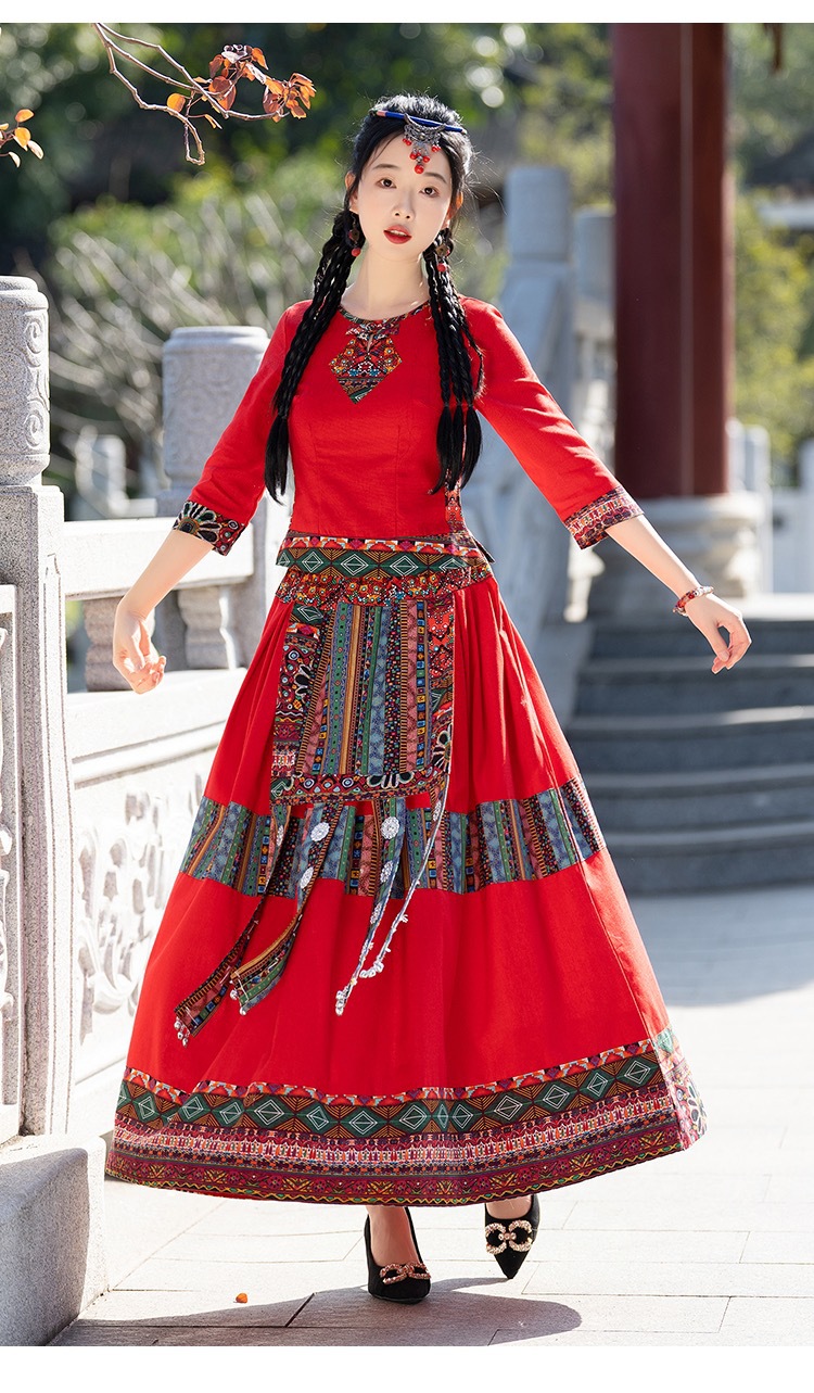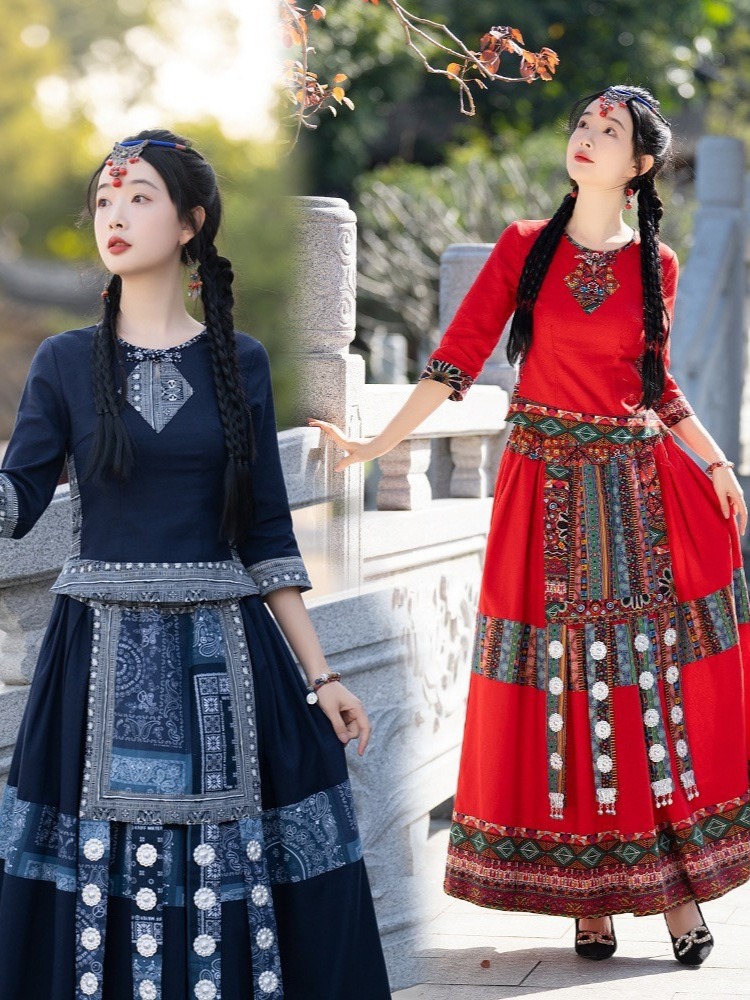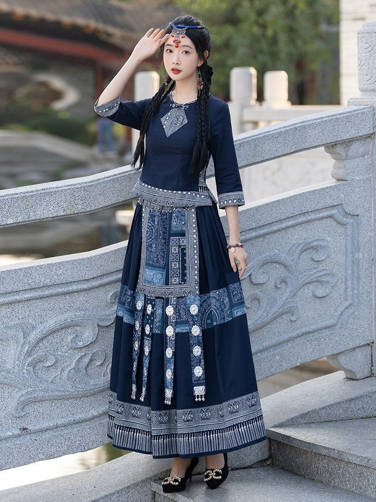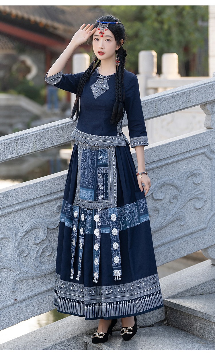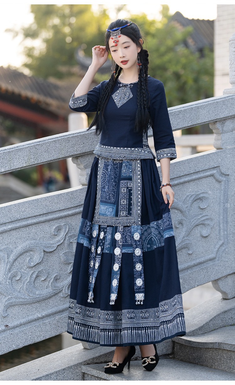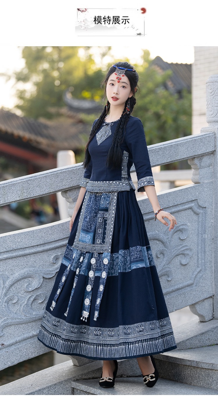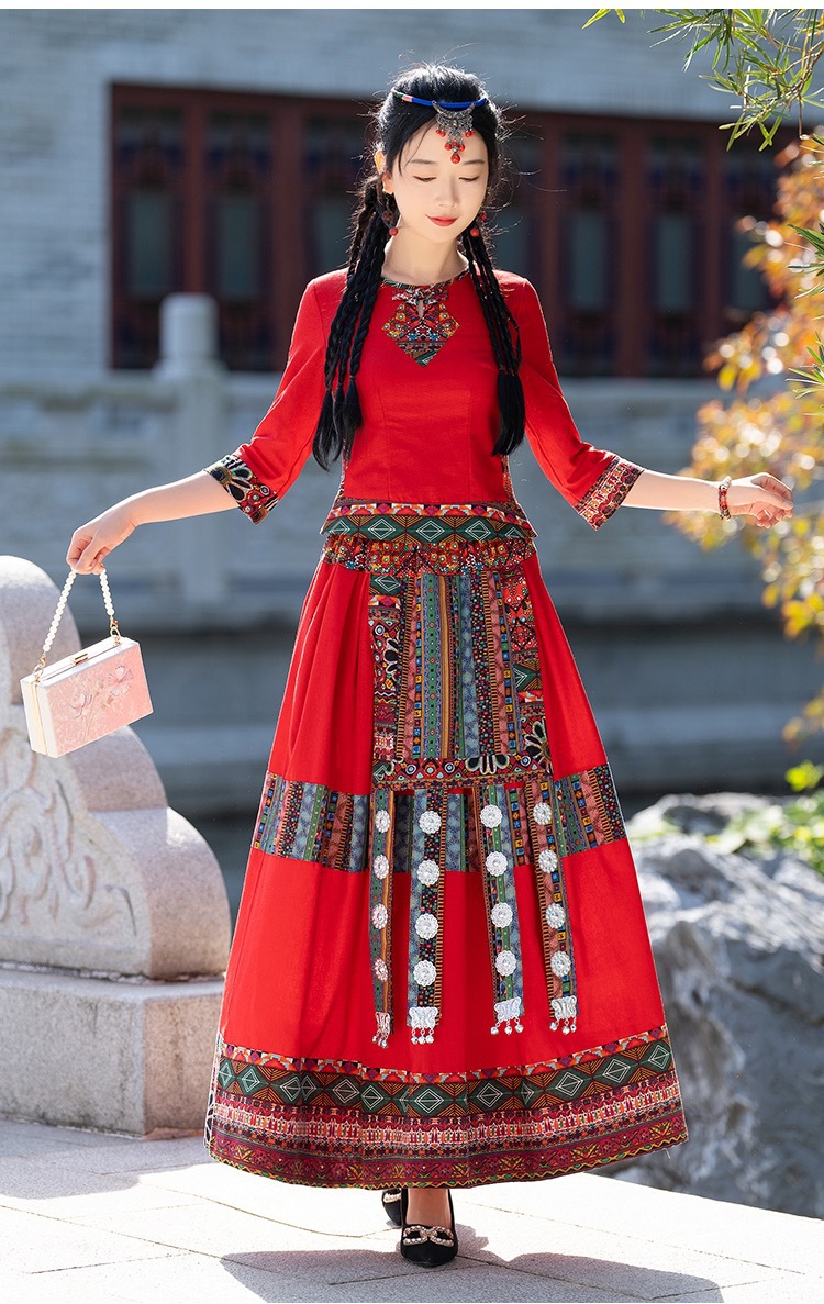 여성을 위한 중국 스타일 슈트, 민족 스타일 자수 탑과 스커트 투피스 세트, 봄 여름 공연 의상, 면 및 린넨 댄스 의상
