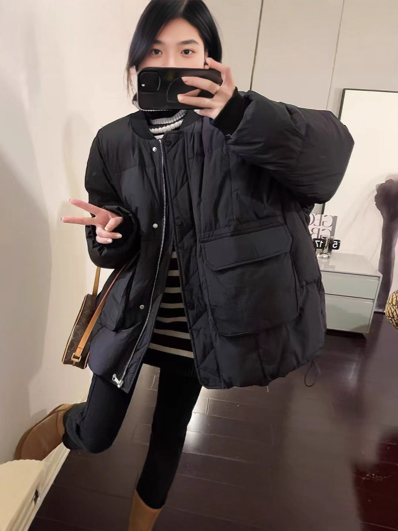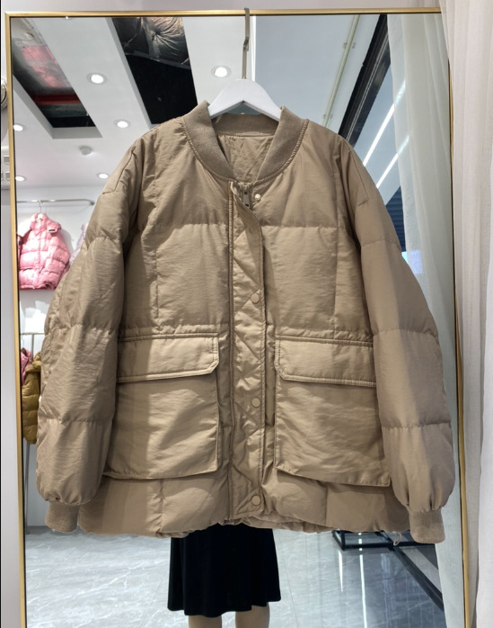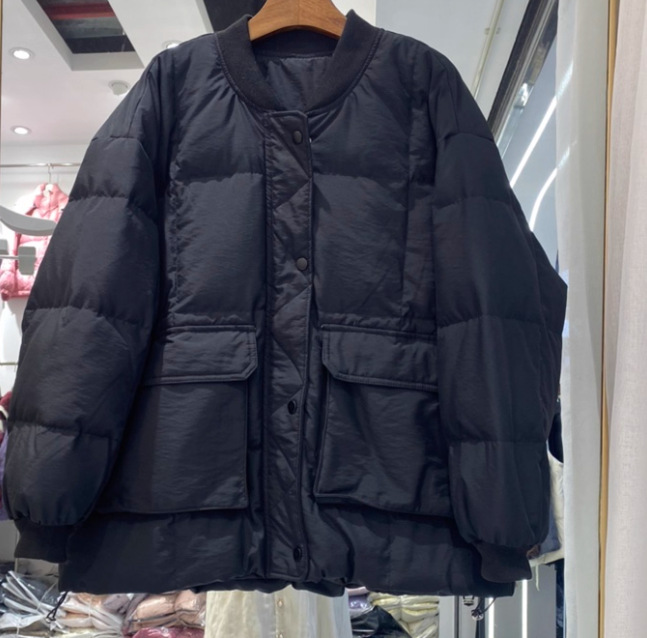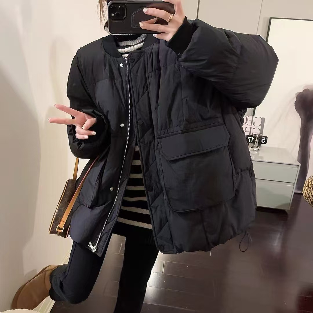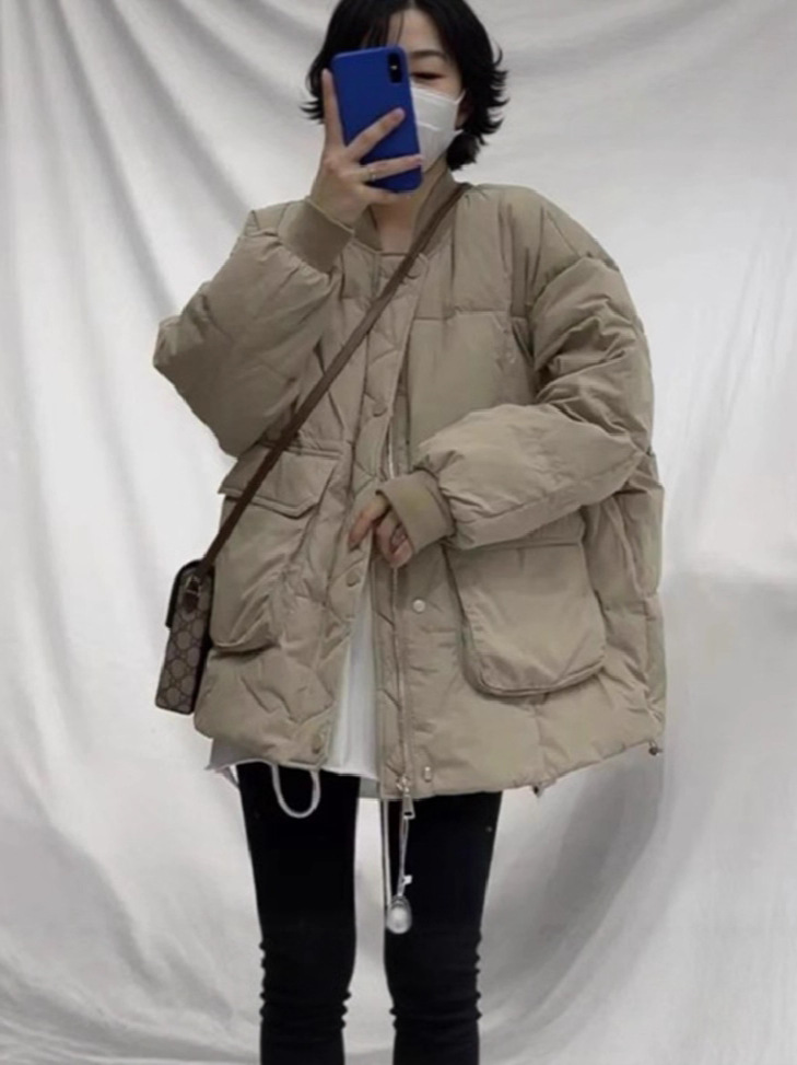 유럽 대형 대형 포켓 다운 재킷 여성 신작 한국 스타일 루즈 스탠드 칼라 다운 재킷 야구 재킷 빵 재킷