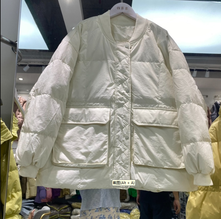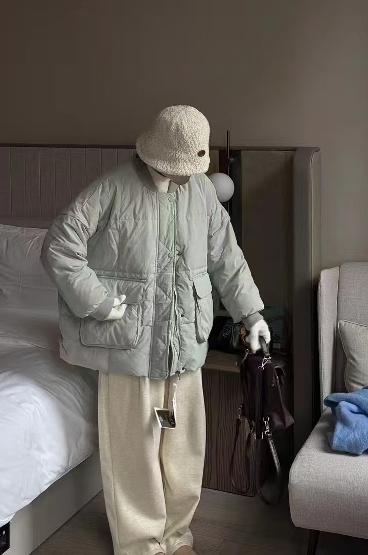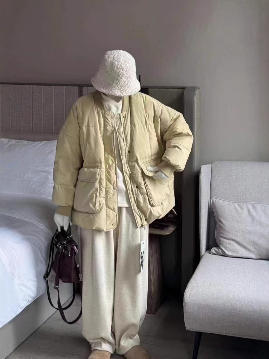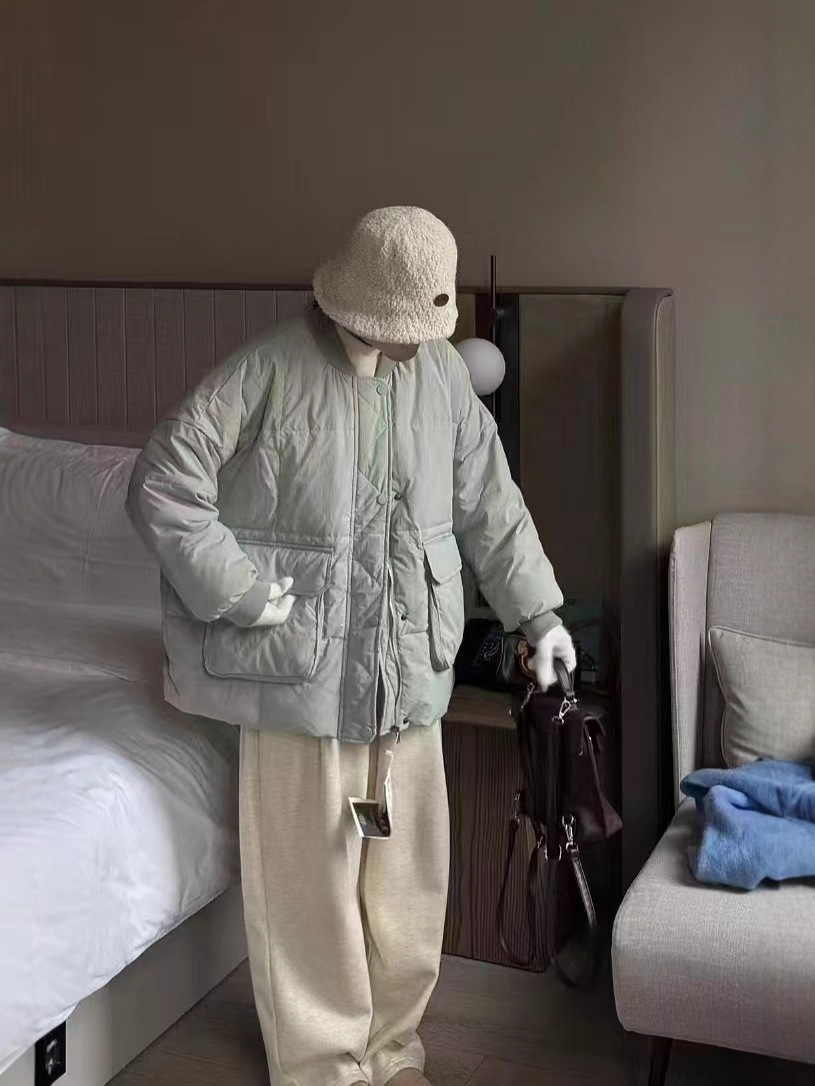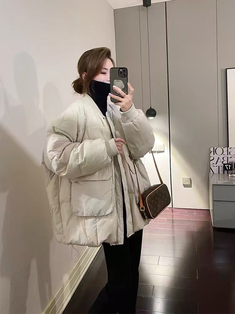 유럽 대형 대형 포켓 다운 재킷 여성 신작 한국 스타일 루즈 스탠드 칼라 다운 재킷 야구 재킷 빵 재킷