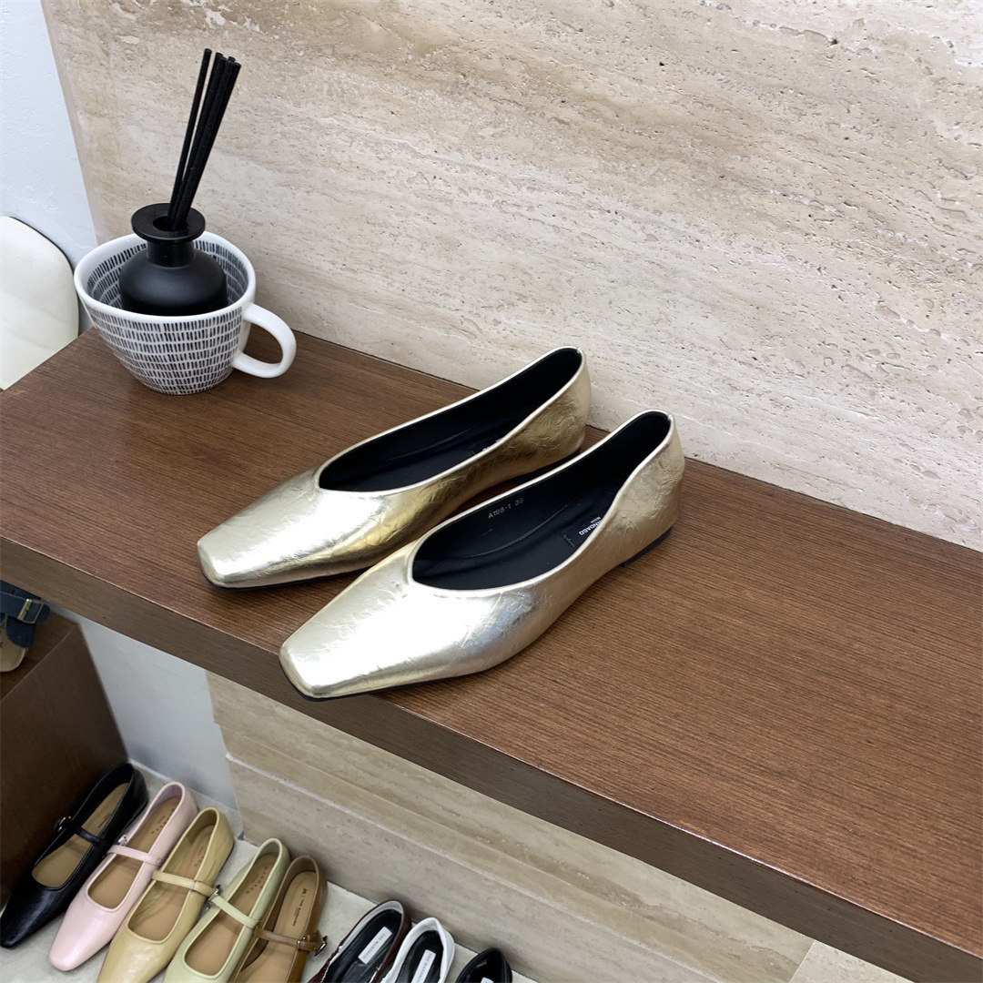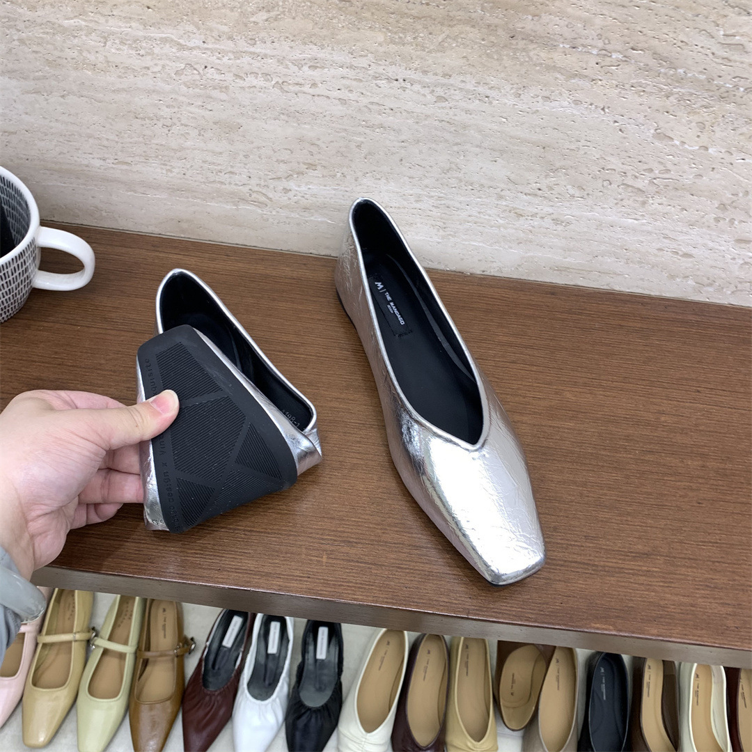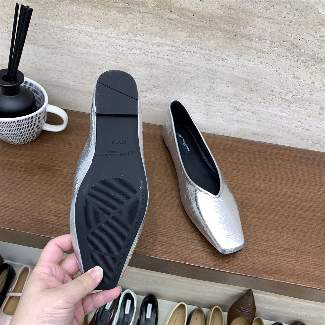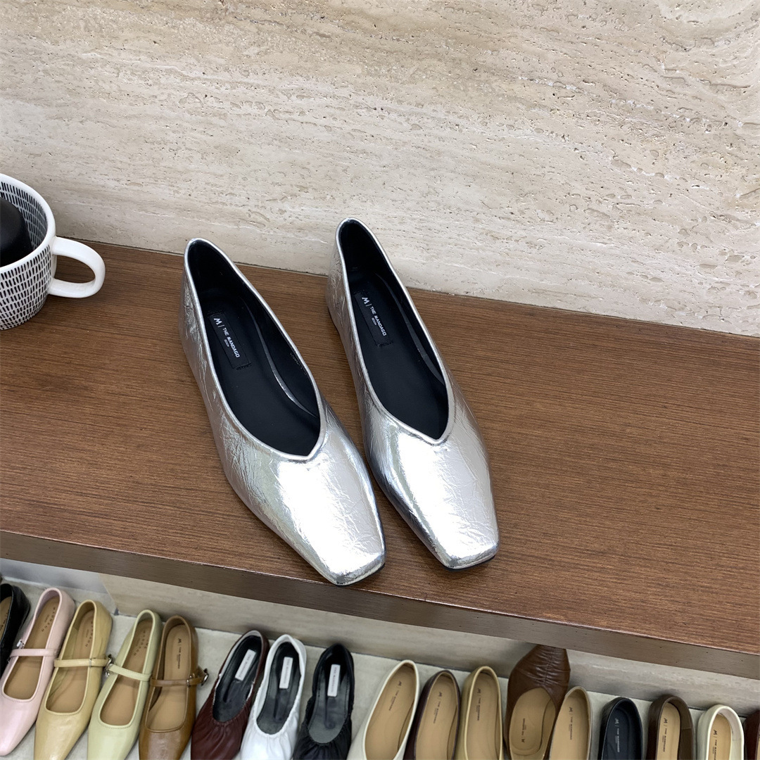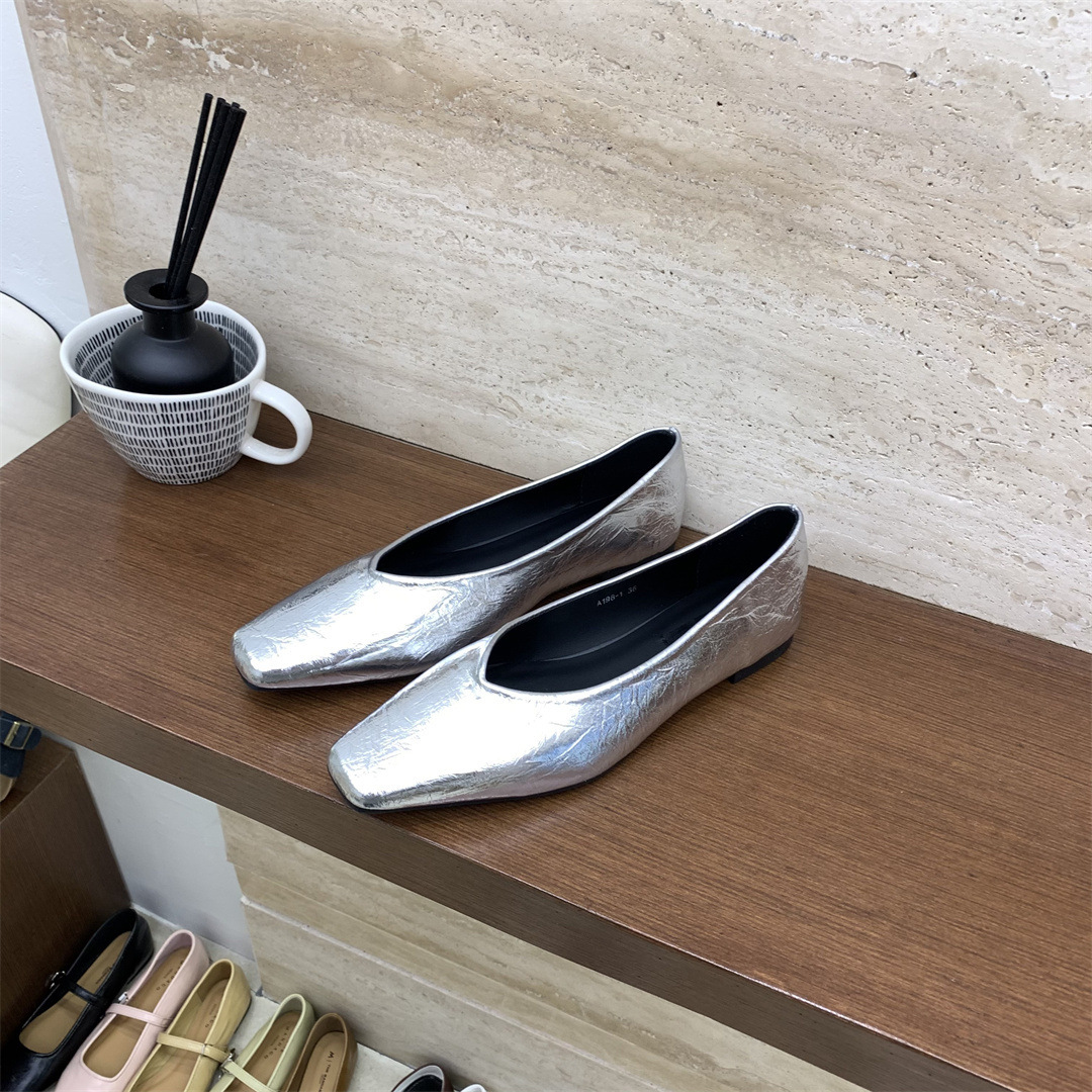 봄, 가을 여성용 얕은 구멍 실버 슈즈 한국식 프렌치 스타일 저녁 통근용 로우힐 플랫 가죽 슈즈
