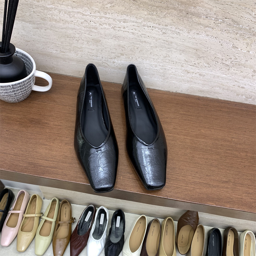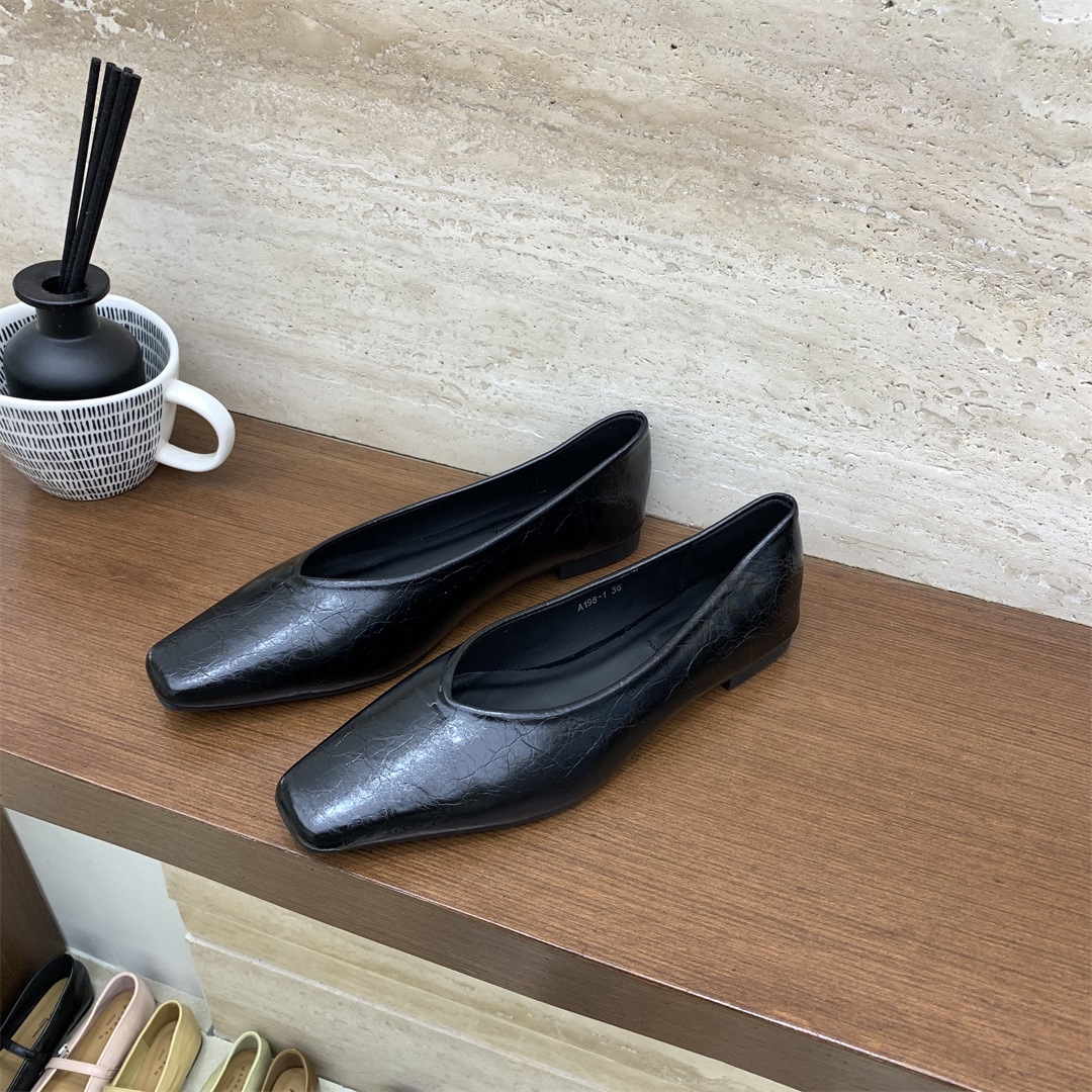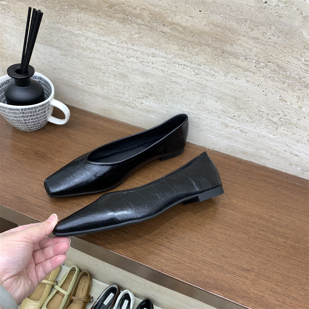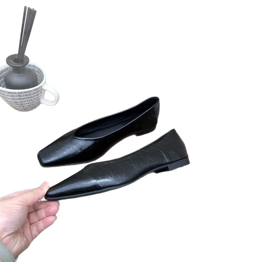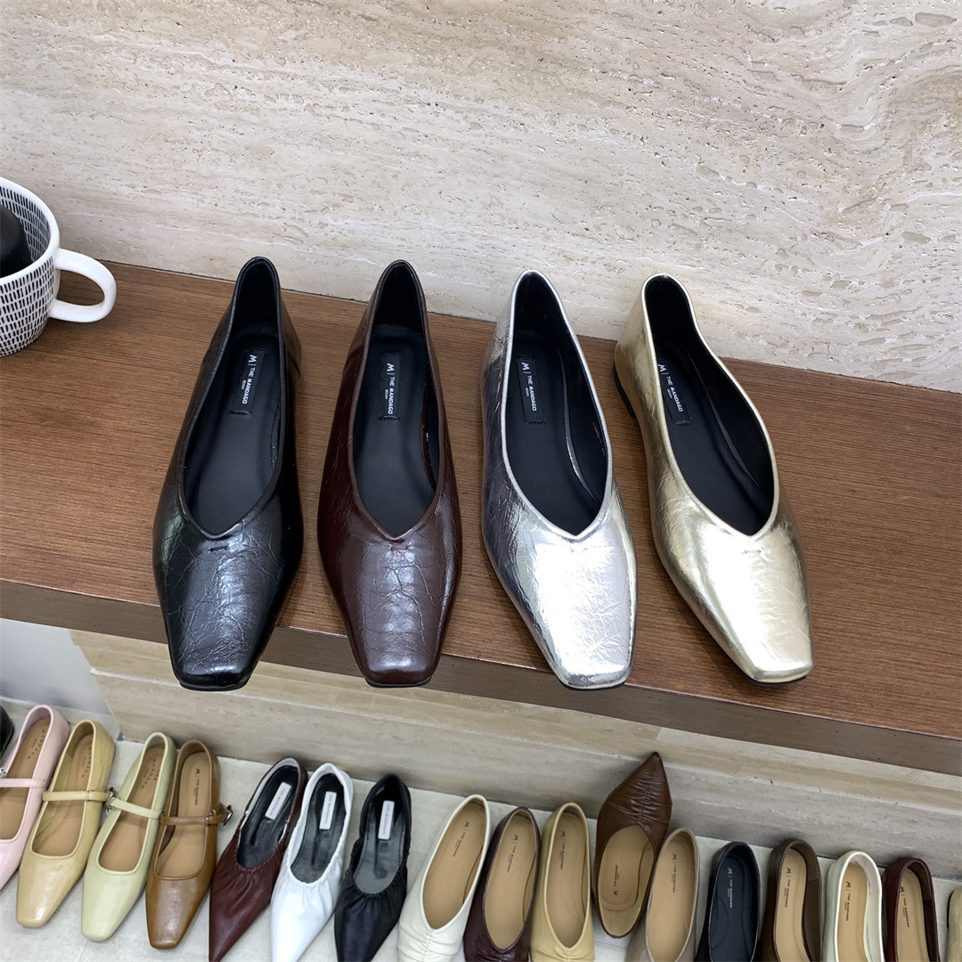봄, 가을 여성용 얕은 구멍 실버 슈즈 한국식 프렌치 스타일 저녁 통근용 로우힐 플랫 가죽 슈즈