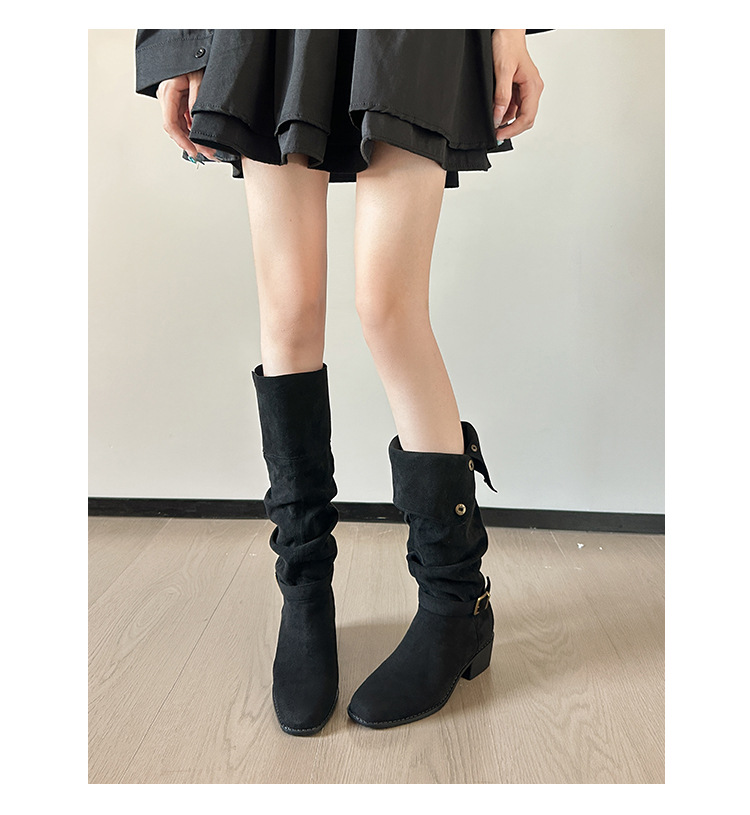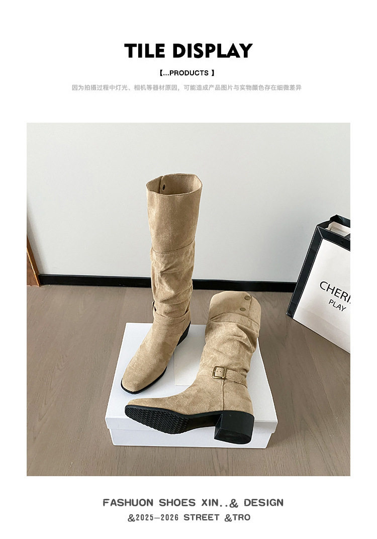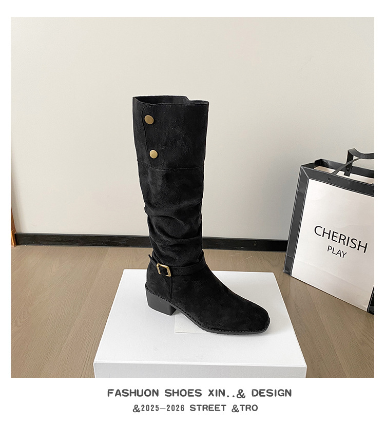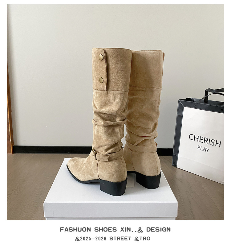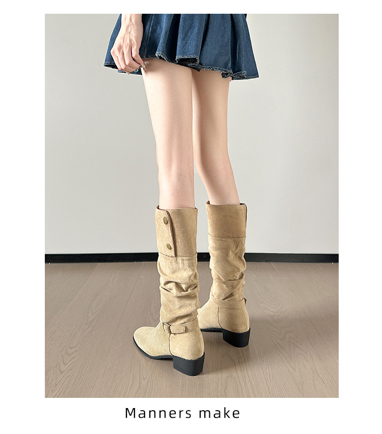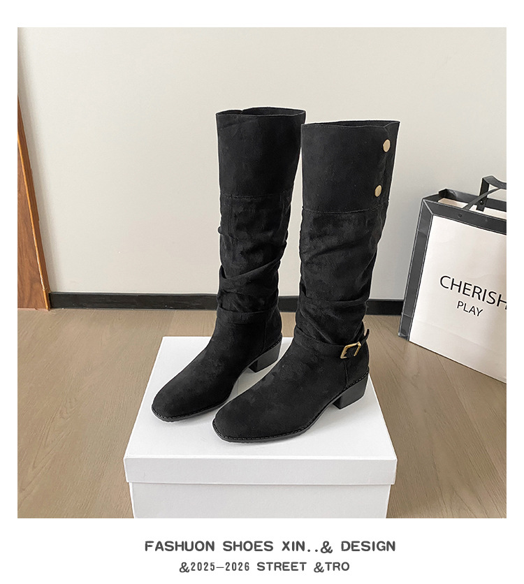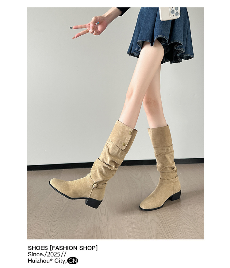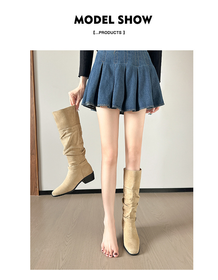237-9G 스웨이드 프렌치 부츠 무릎 부츠 2025 가을 겨울 신작 복고풍 여성 부츠 주름 부츠