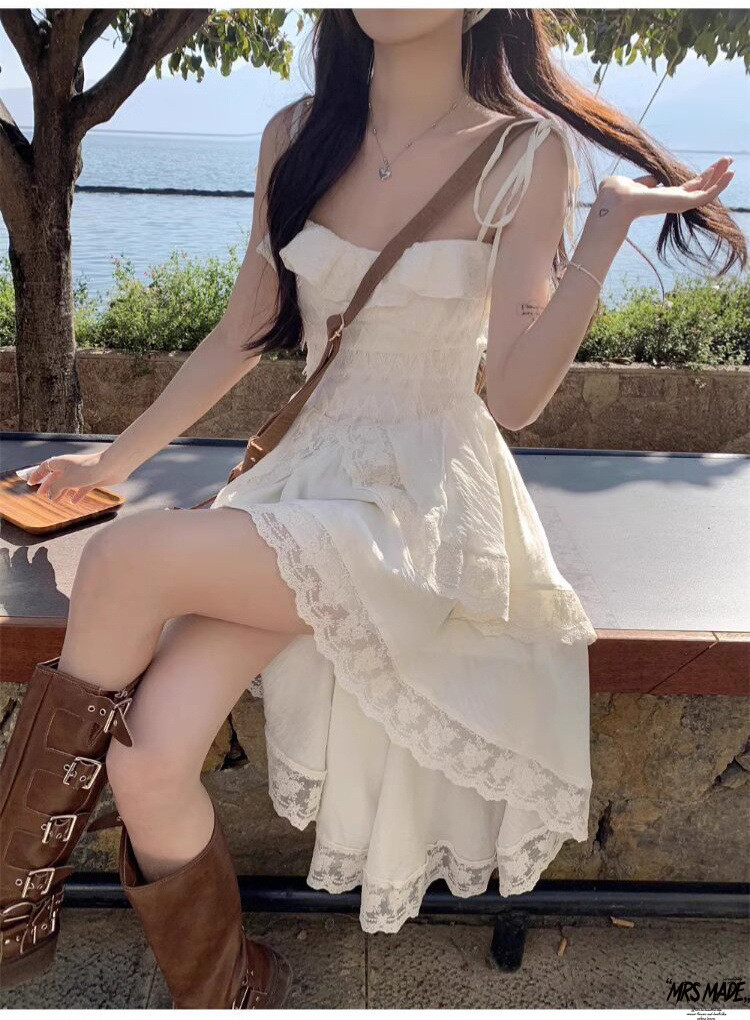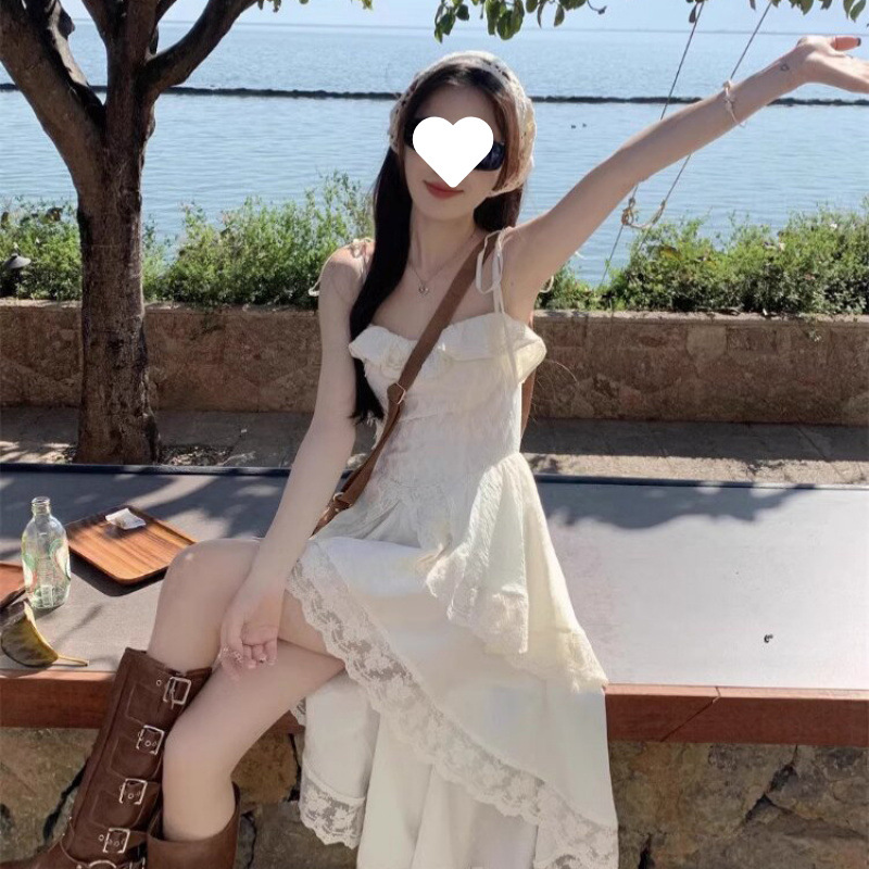프렌치 화이트 서스펜더 드레스 요정 여름 분위기 해변 휴가 해변 불규칙한 공주 드레스