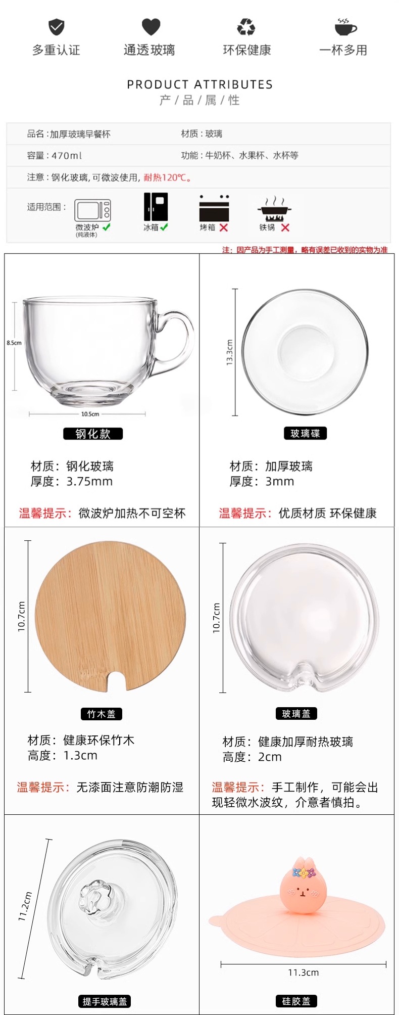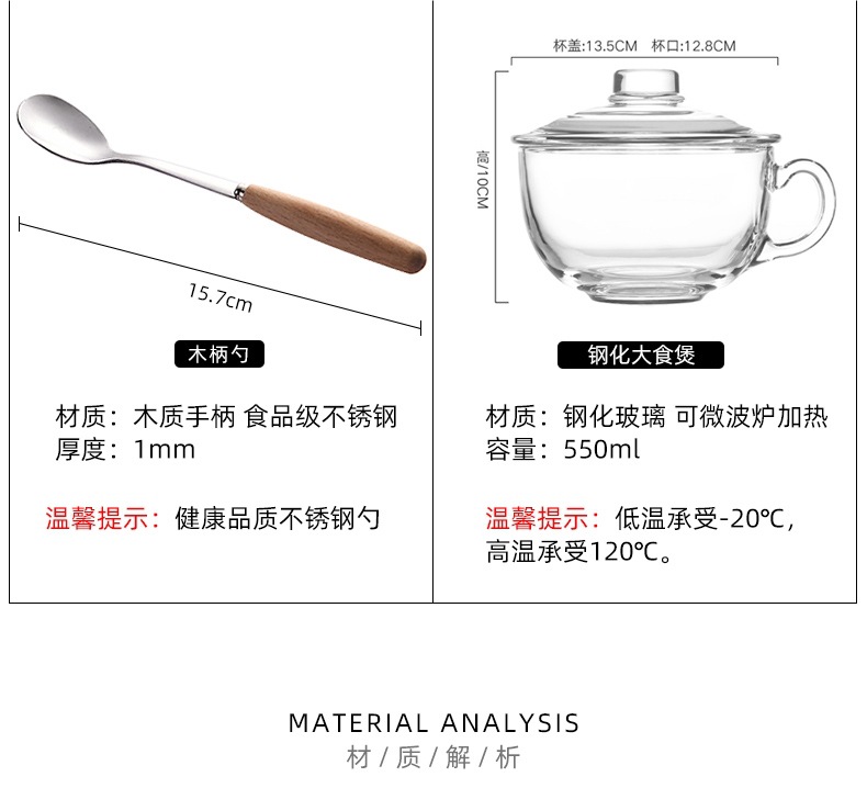 무연 내열컵 + 유리뚜껑 + 나무손잡이 스푼 + 접시 전자레인지 내열 및 내구성 업그레이드