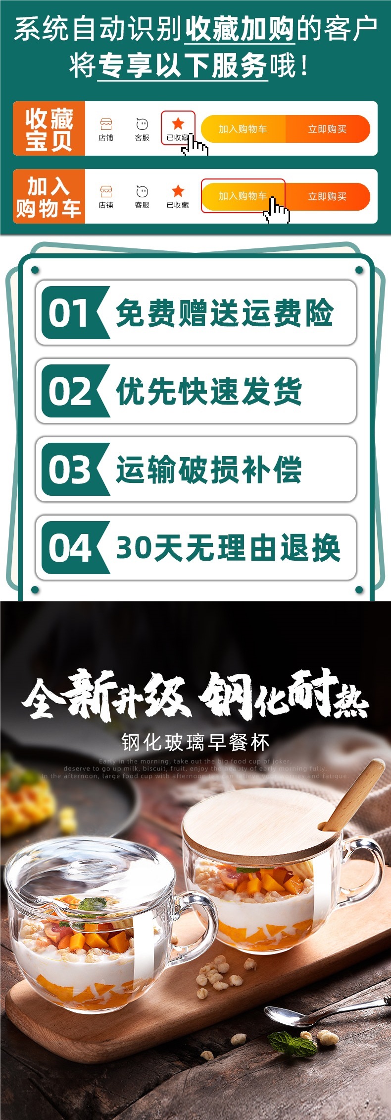 강화낙하방지컵 + [리프트버튼] 유리뚜껑 + 나무손잡이 스푼, 전자레인지 내열 및 내구성 업그레이드