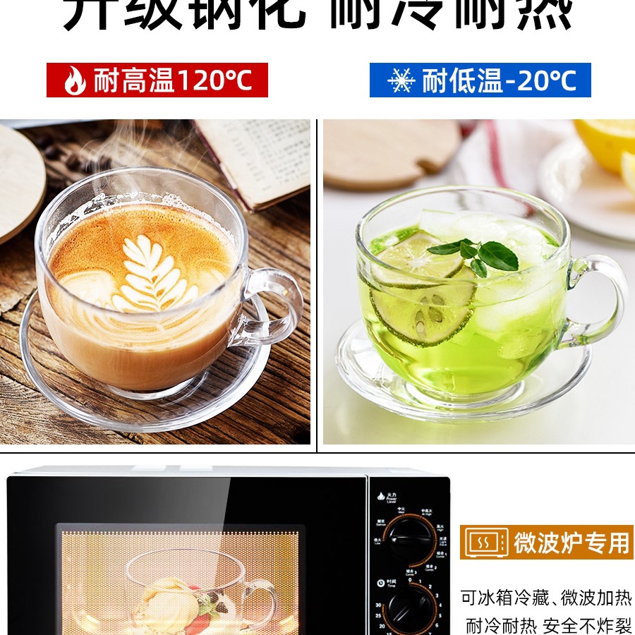 강화 낙하 방지 컵 + 유리 뚜껑 + 나무 손잡이 스푼 + 접시, 내열성 및 내구성이 업그레이드된 전자레인지
