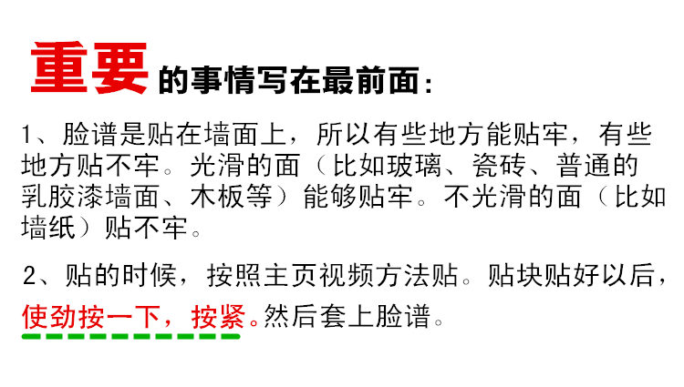 1、只能贴平整光滑墙面,墙纸不可以贴。2、必须按照正确方法贴!!!顶出贴块,撕开贴纸,把贴块贴好,压紧2秒钟,然后把脸谱套上。