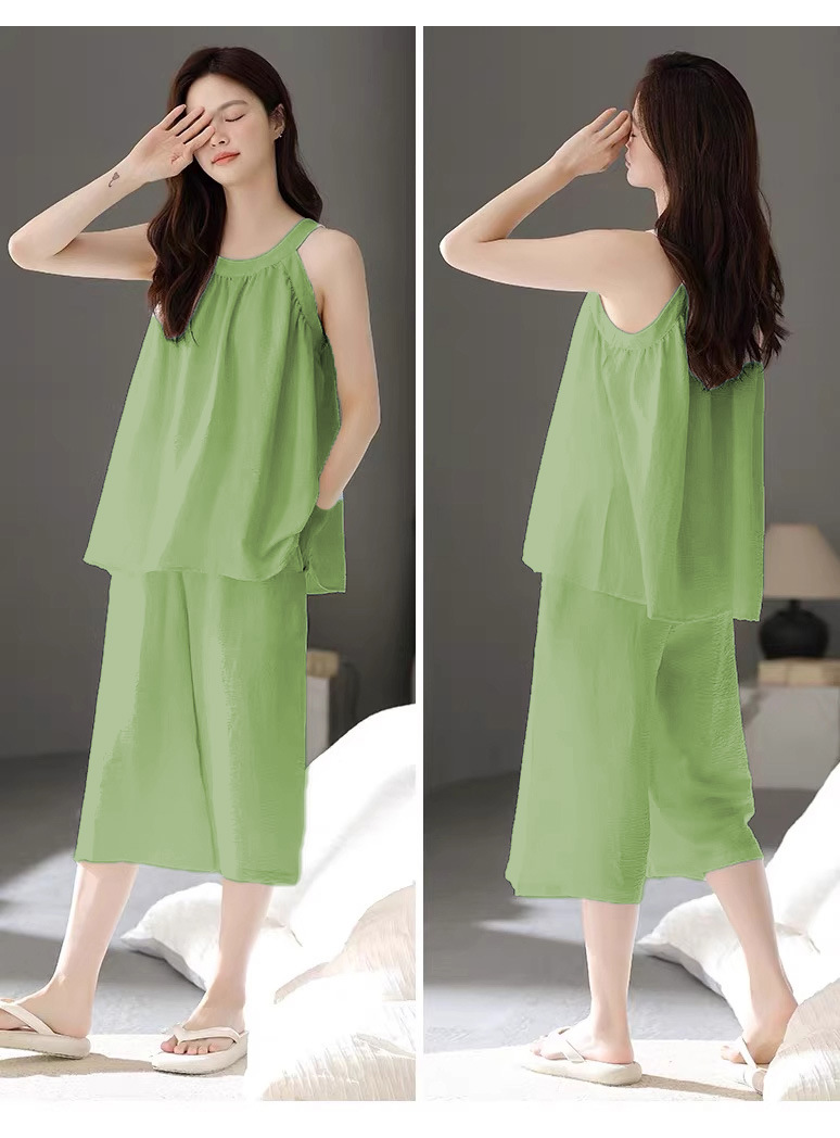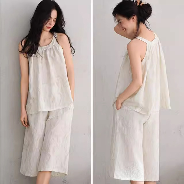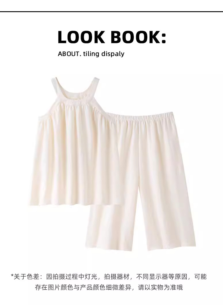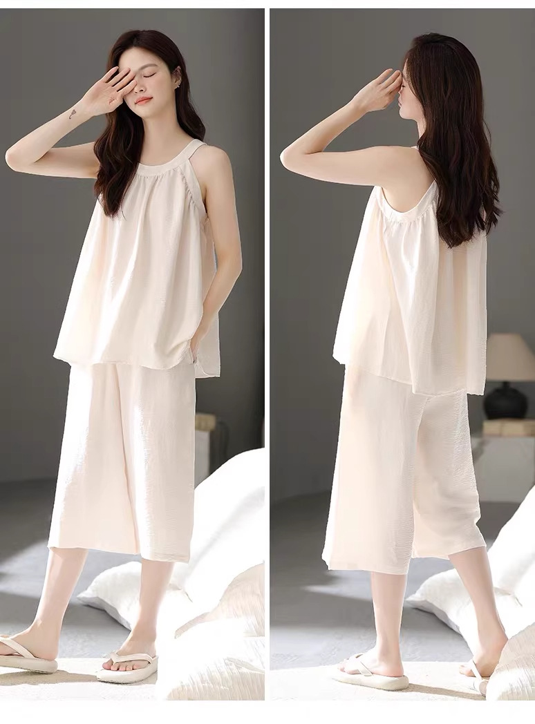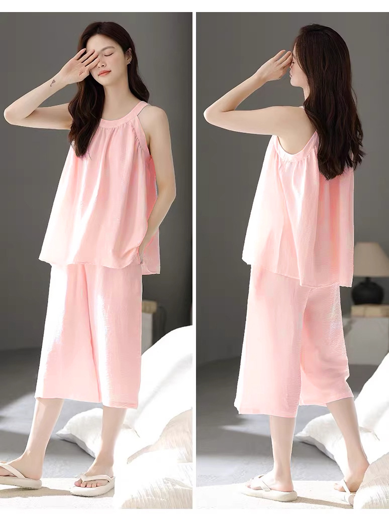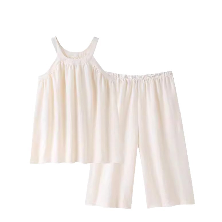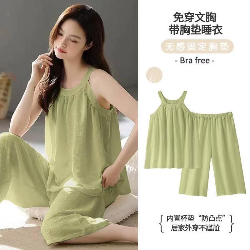 2025년 여성을 위한 가슴 패드가 있는 새로운 스타일의 잠옷, 여름 멜빵 크롭 팬츠, 한국 스타일, 야외에서 착용 가능한 홈웨어 세트