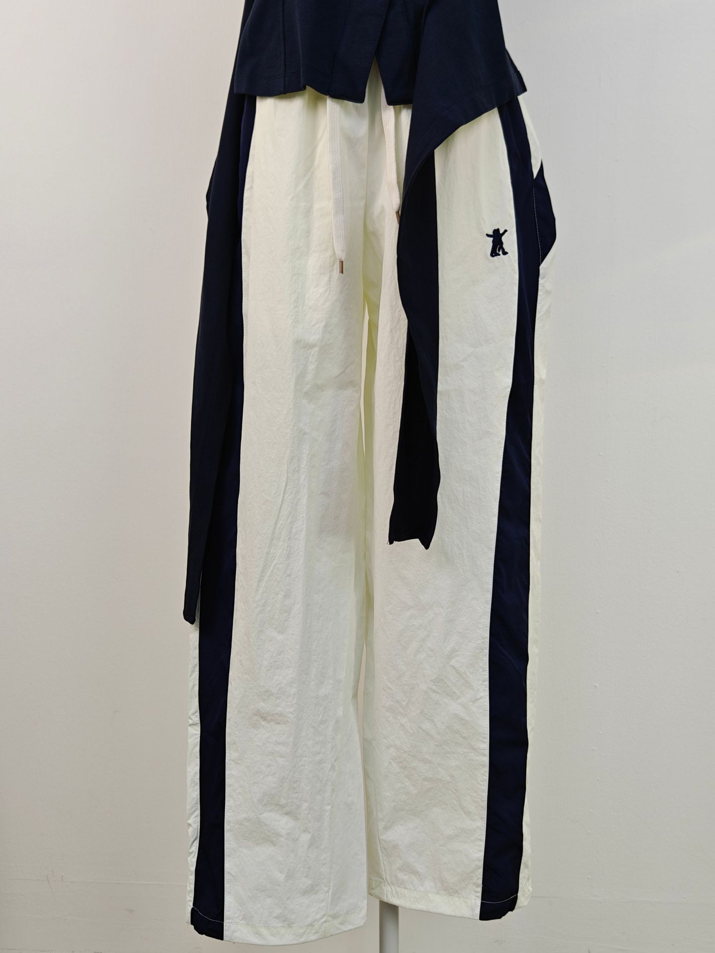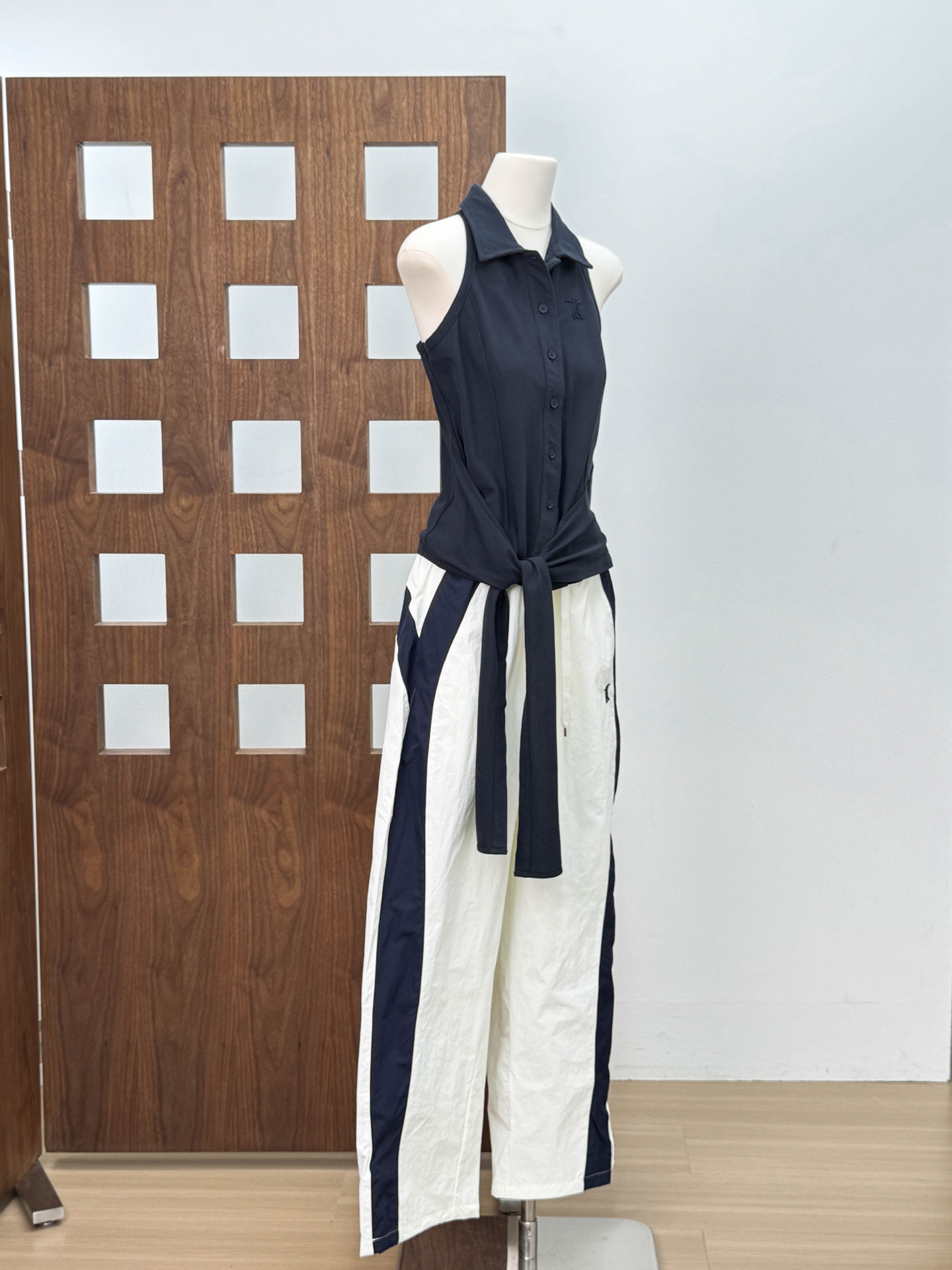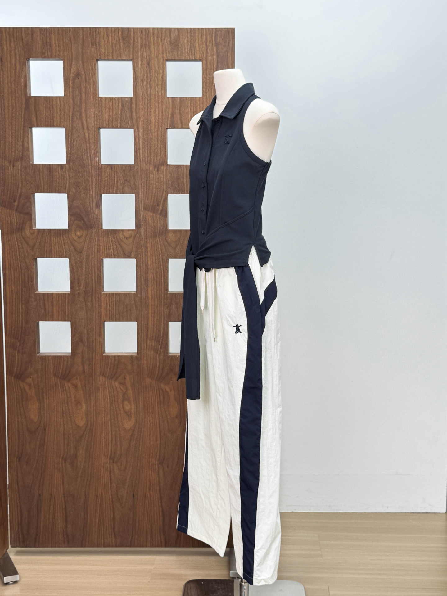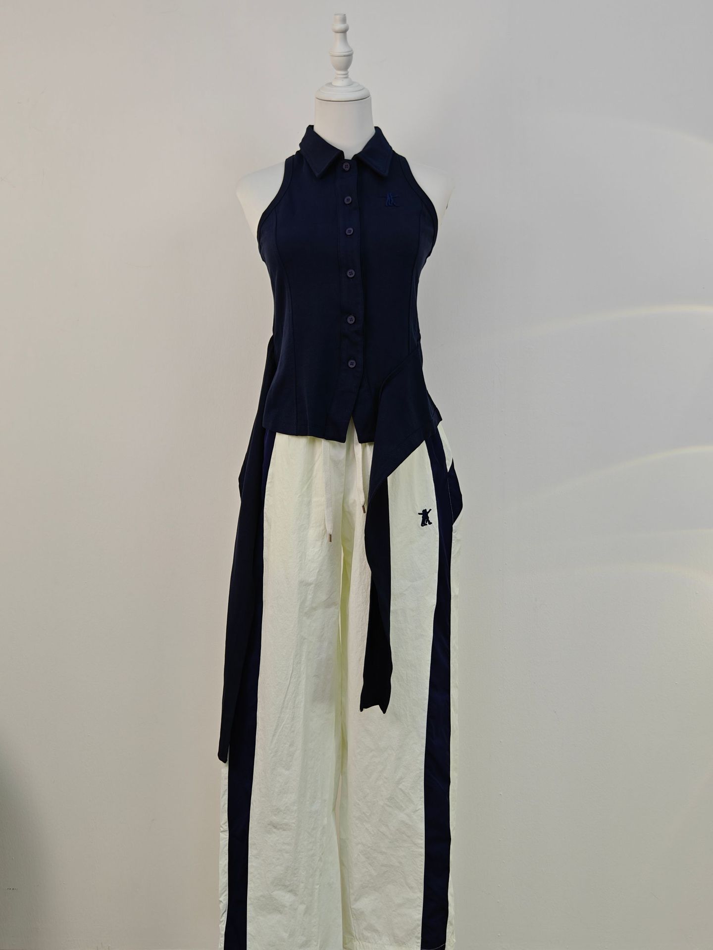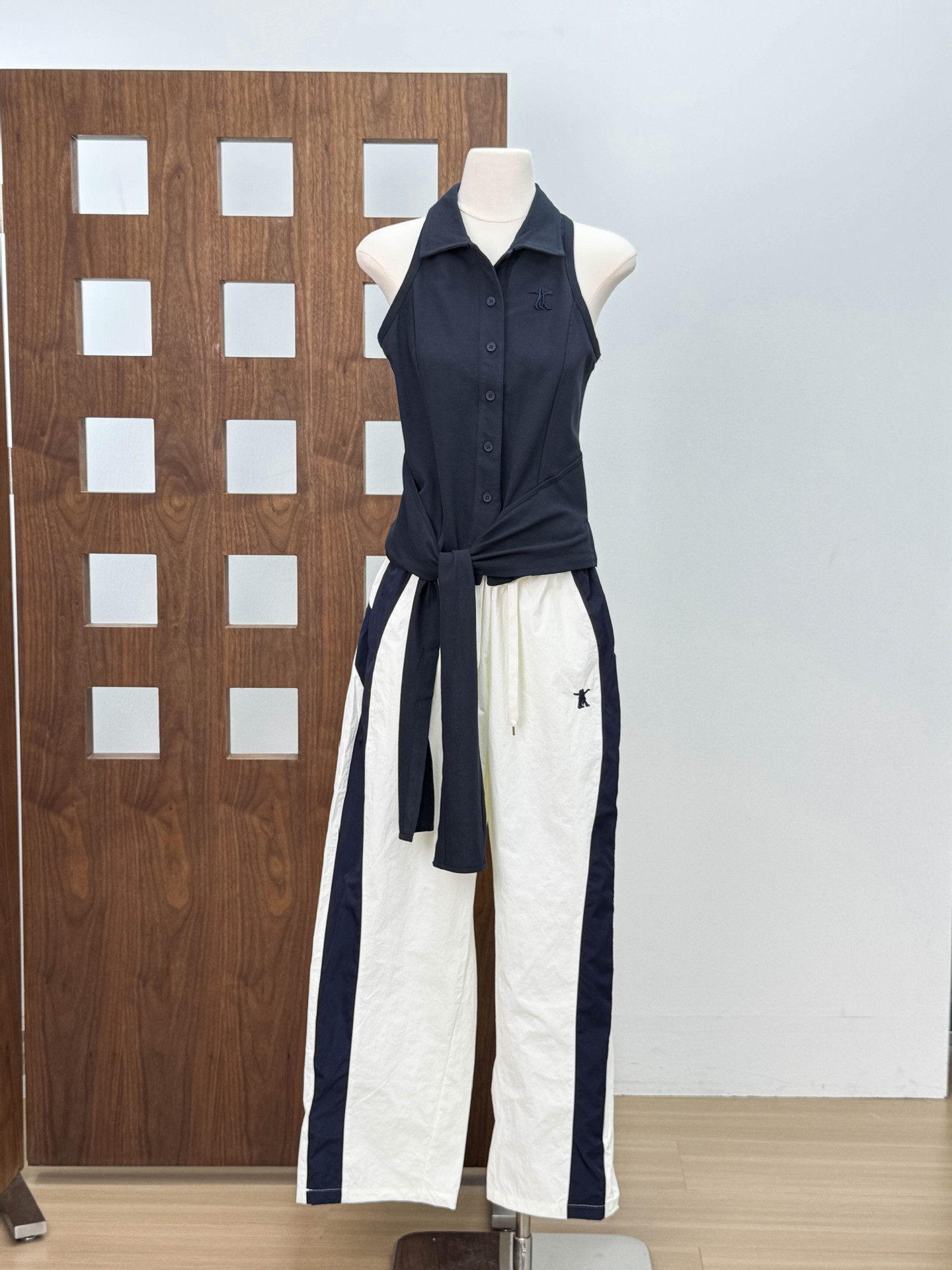 니치 디자인 리본 밑단 민소매 POLO 칼라 여성용 탑 + 신축성 있는 스포츠 속건 긴바지 자수 버전 세트