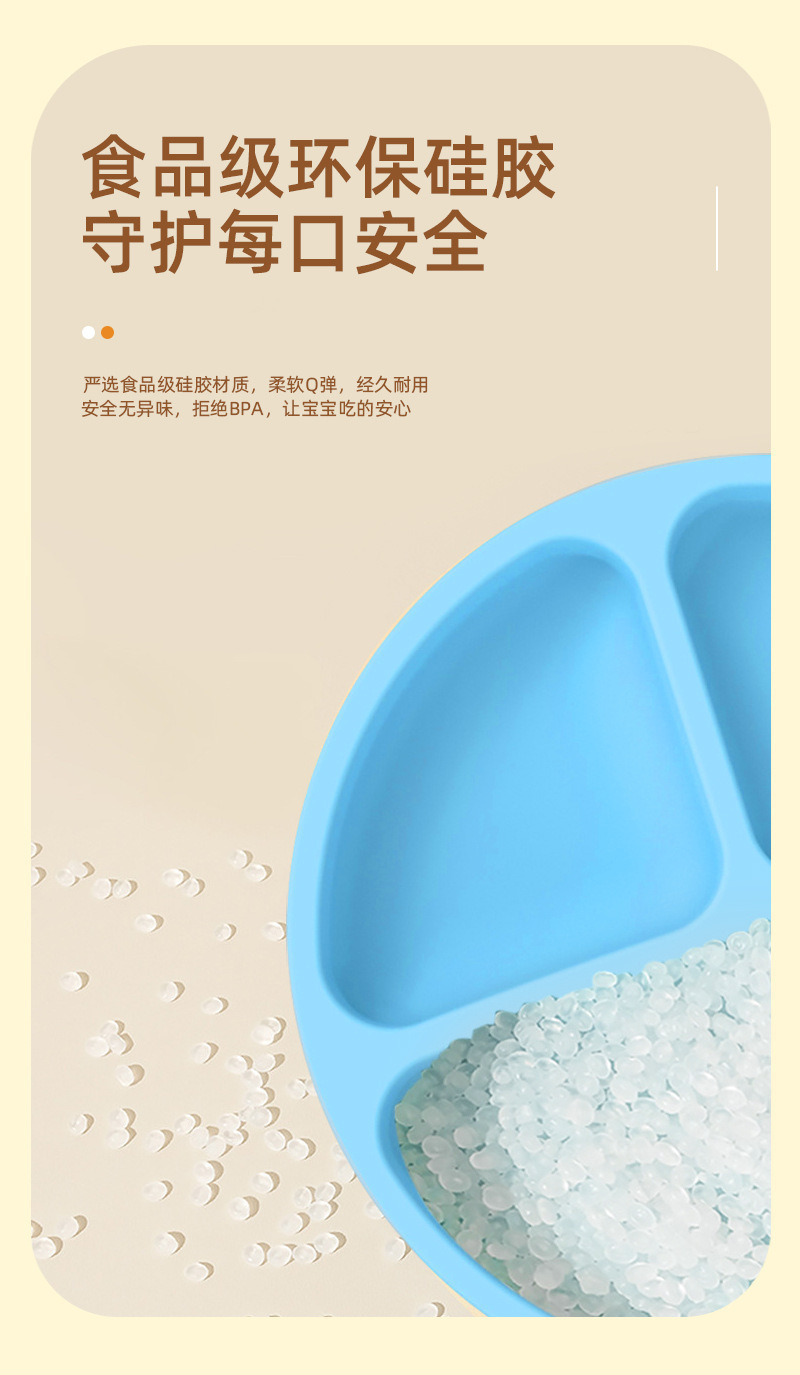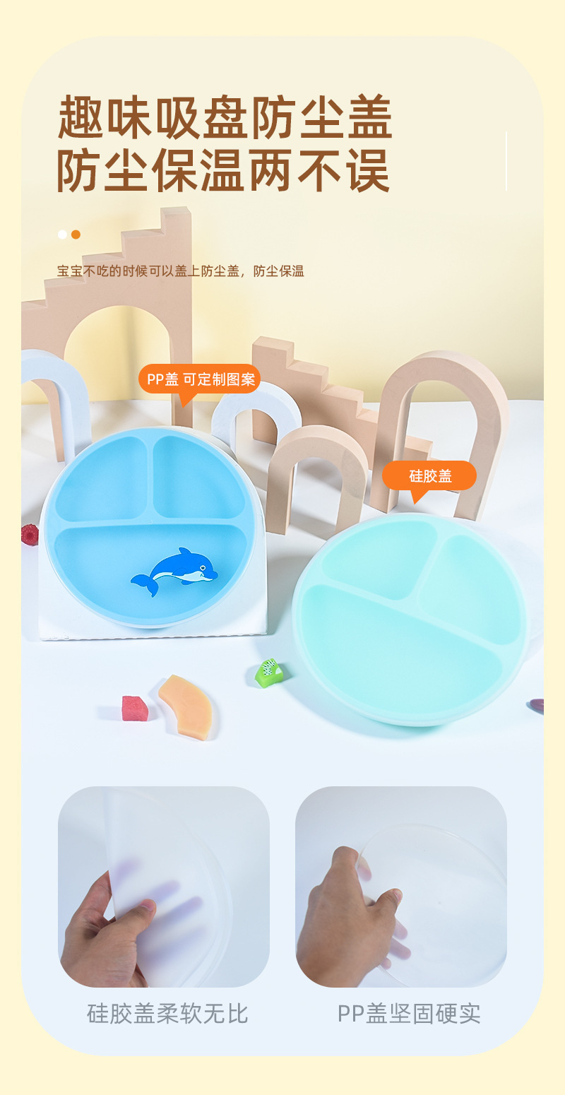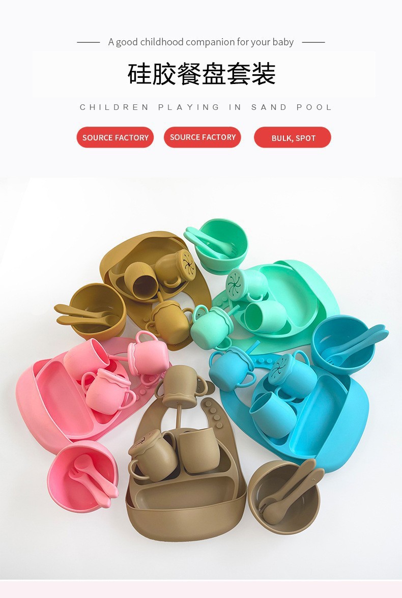 국경 간 인기 판매 어린이 식기 아기 빨판 유형 낙하 방지 접시 식품 등급 실리콘 아기 턱받이 포크와 스푼 접시