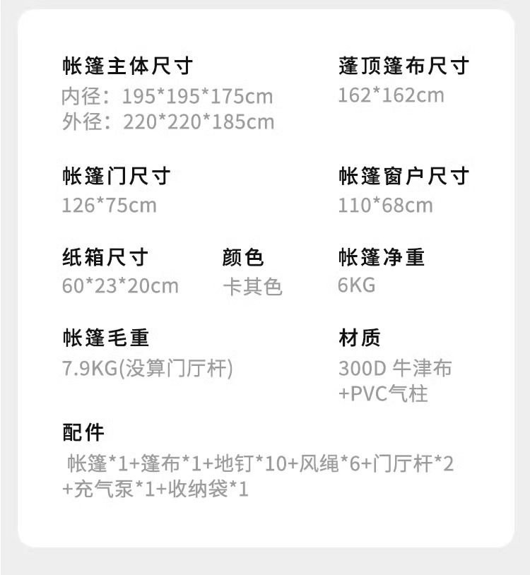 【2.0】사각 텐트 + 더블 침대 + 핸드 펌프 + 휴대용 가방