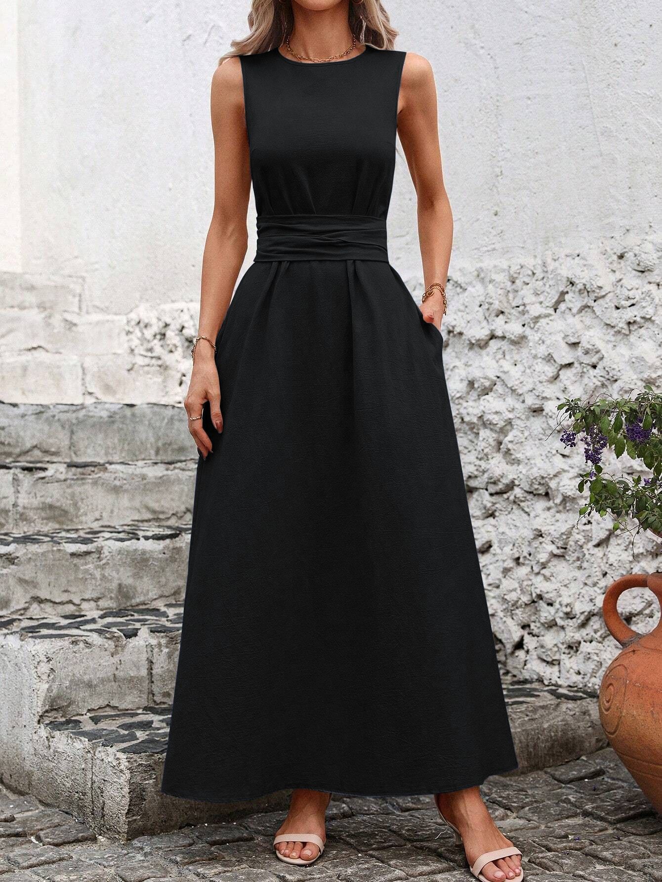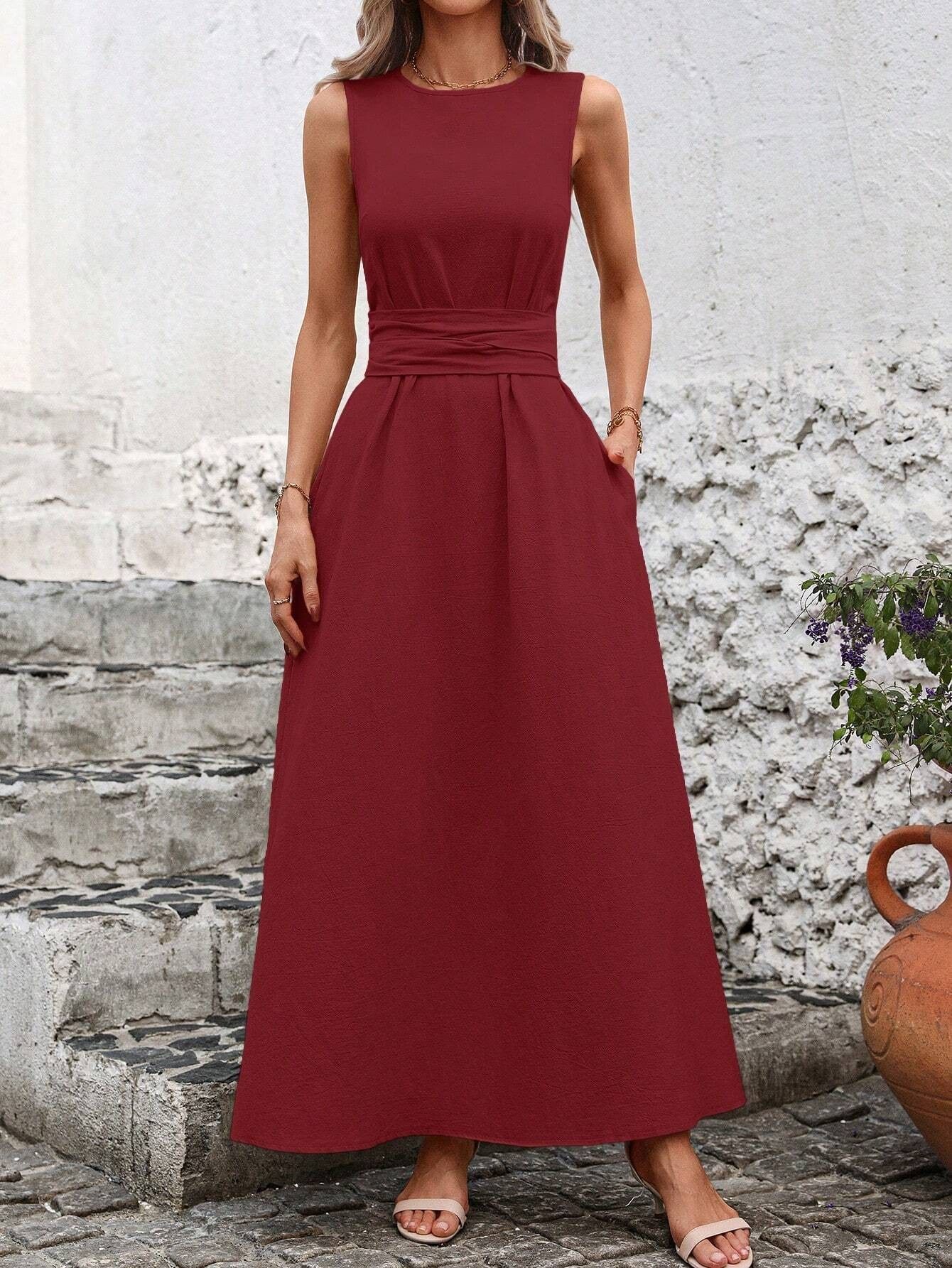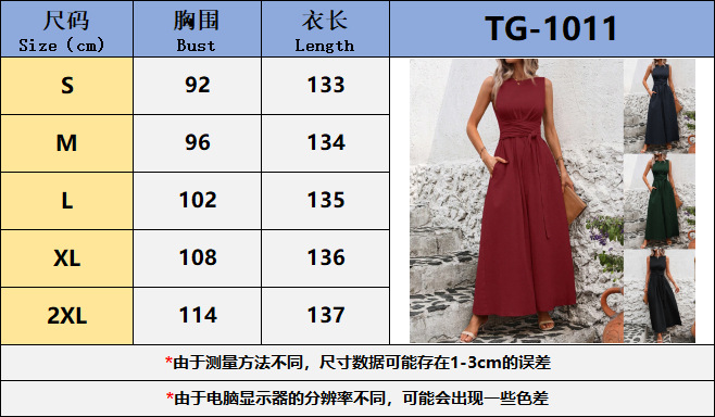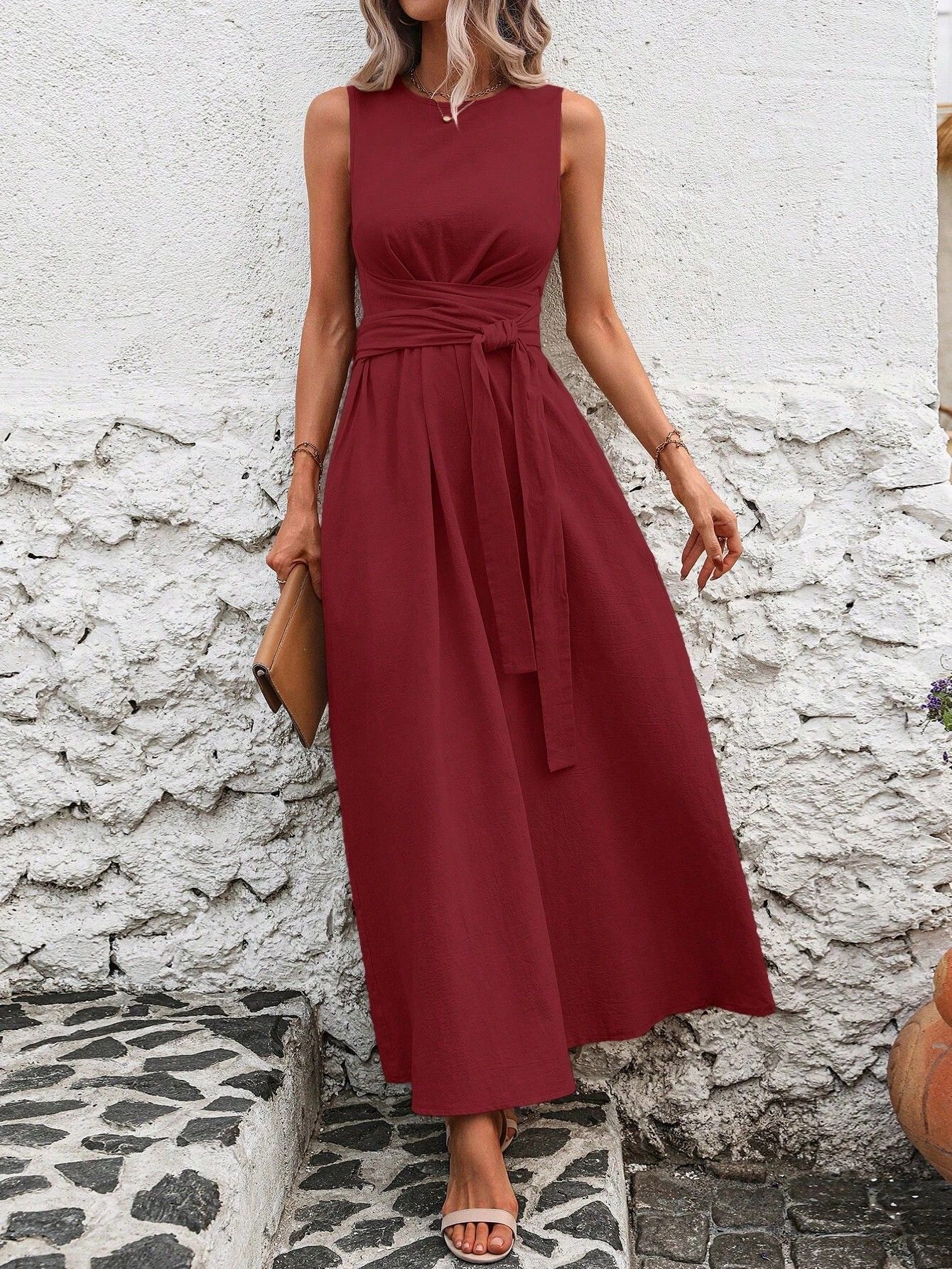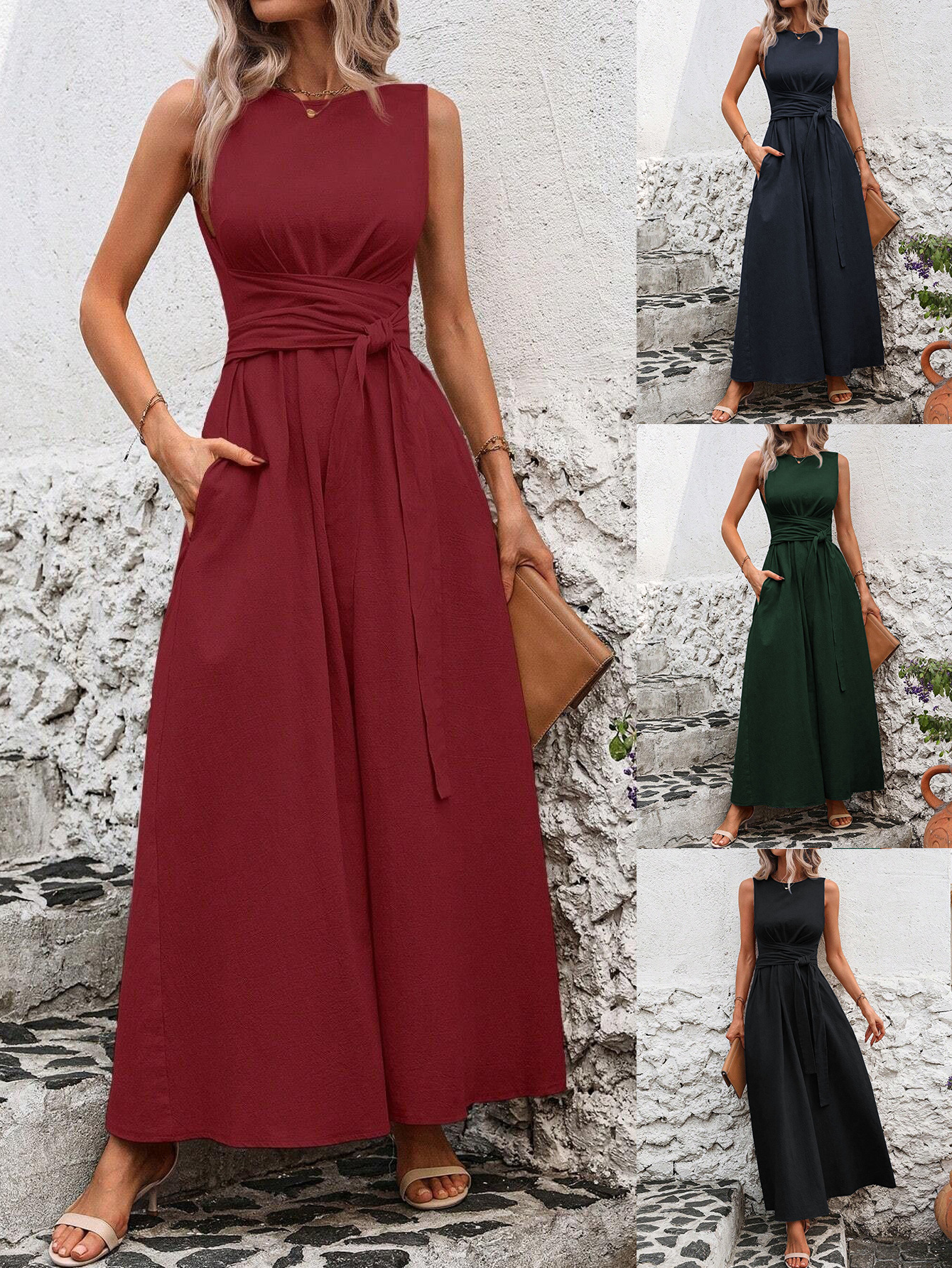 솔리드 컬러 라운드 넥 허리 스트랩 민소매 드레스 편안한 캐주얼 홀리데이 스타일 롱 스커트 유럽과 미국 여성 의류