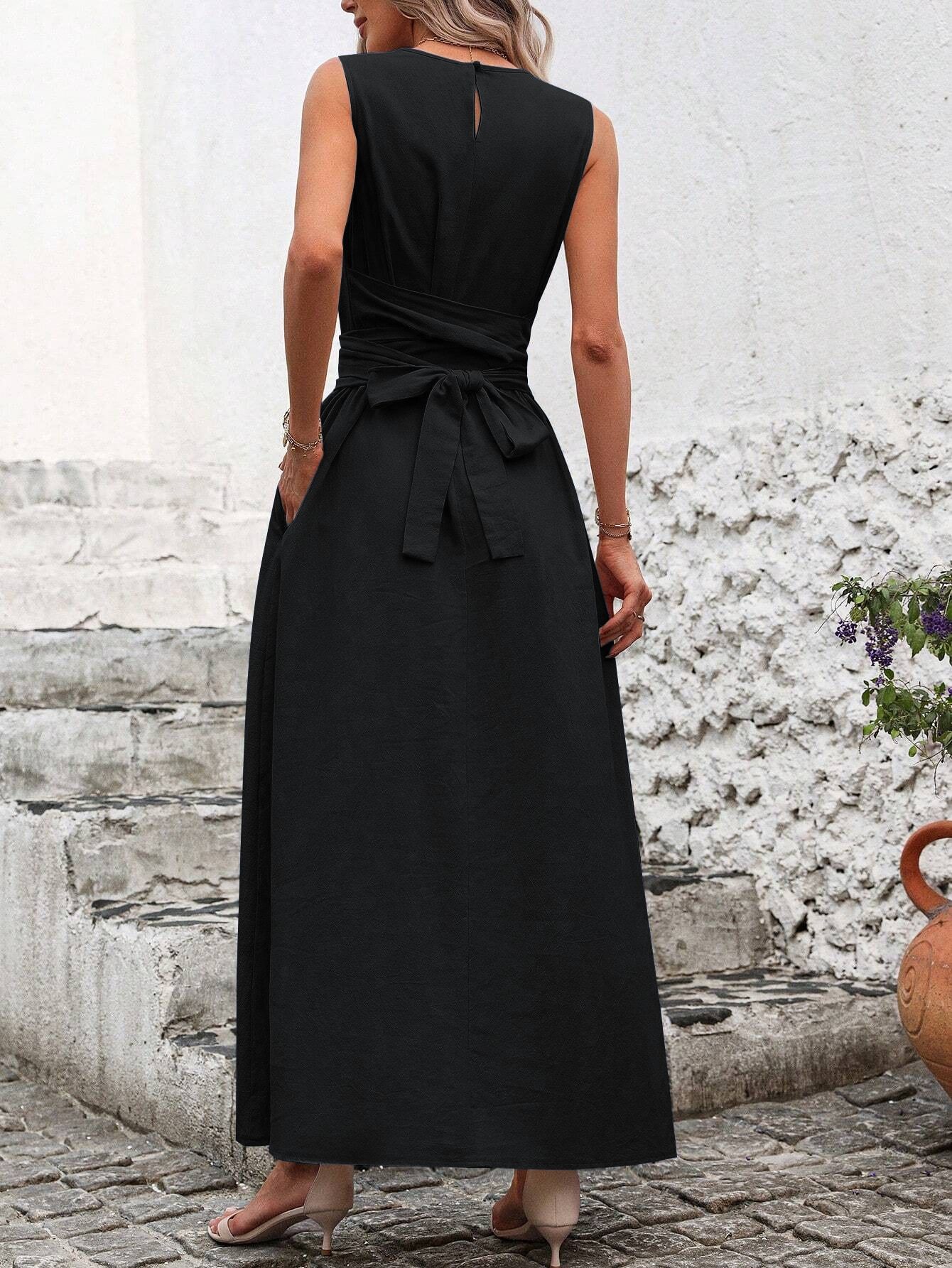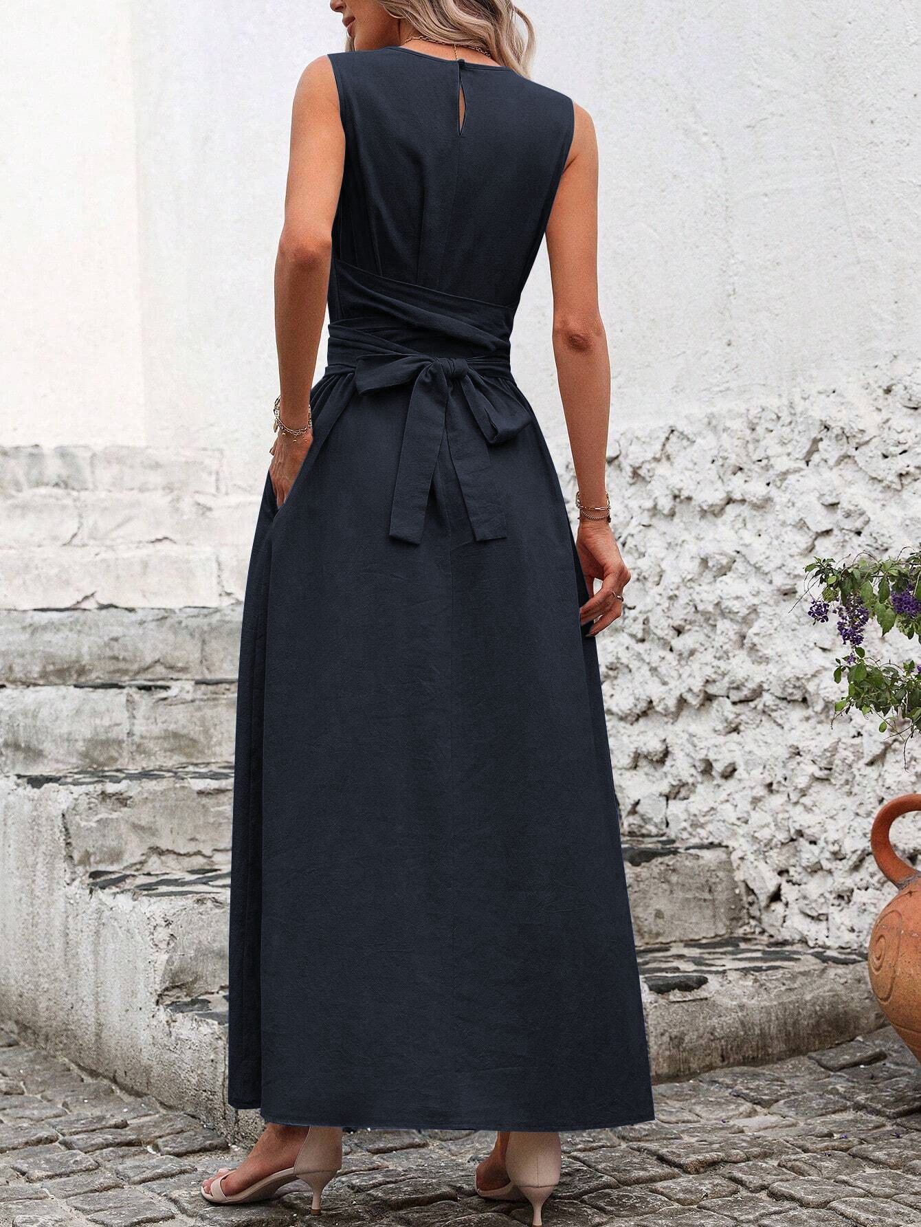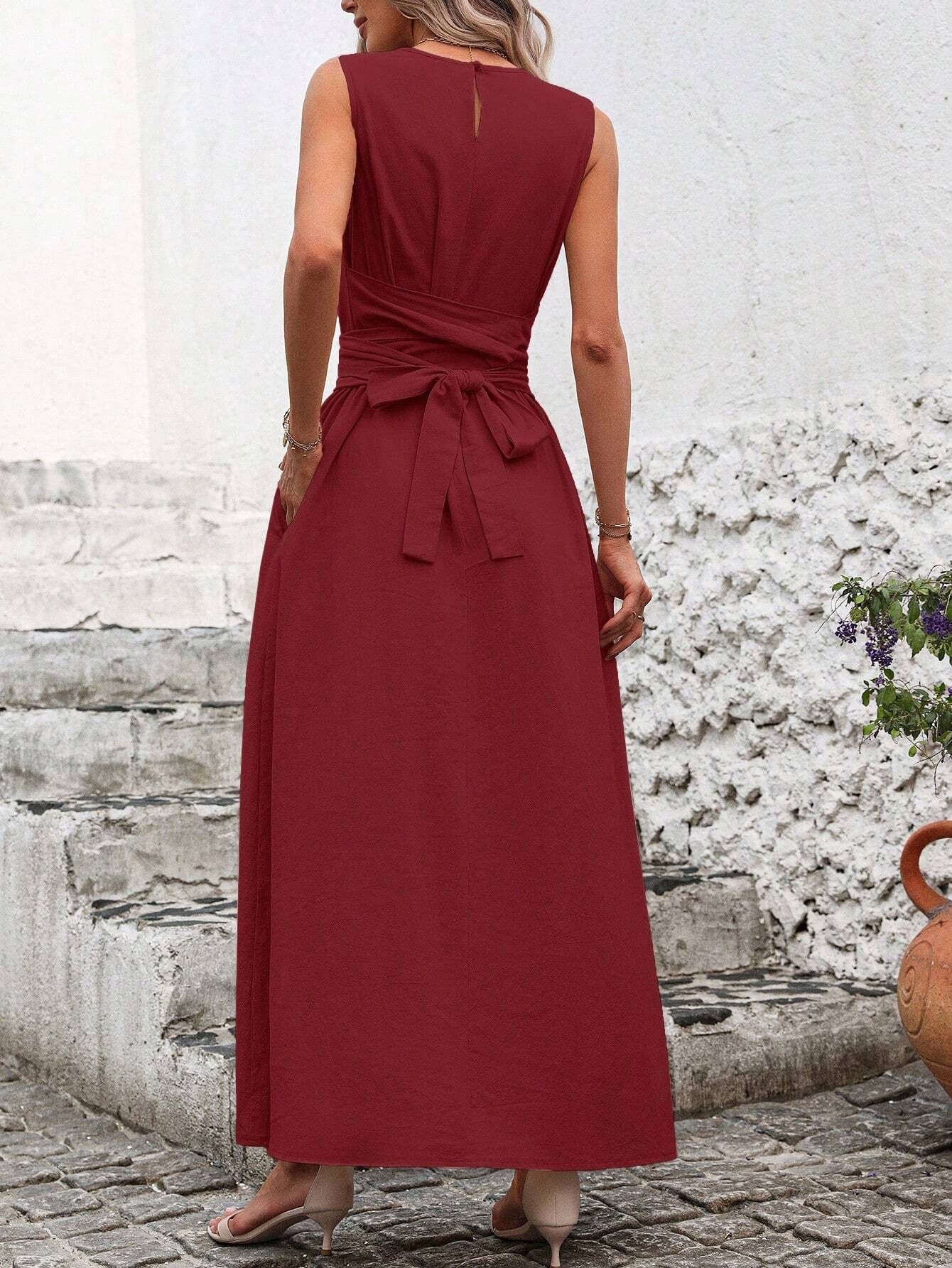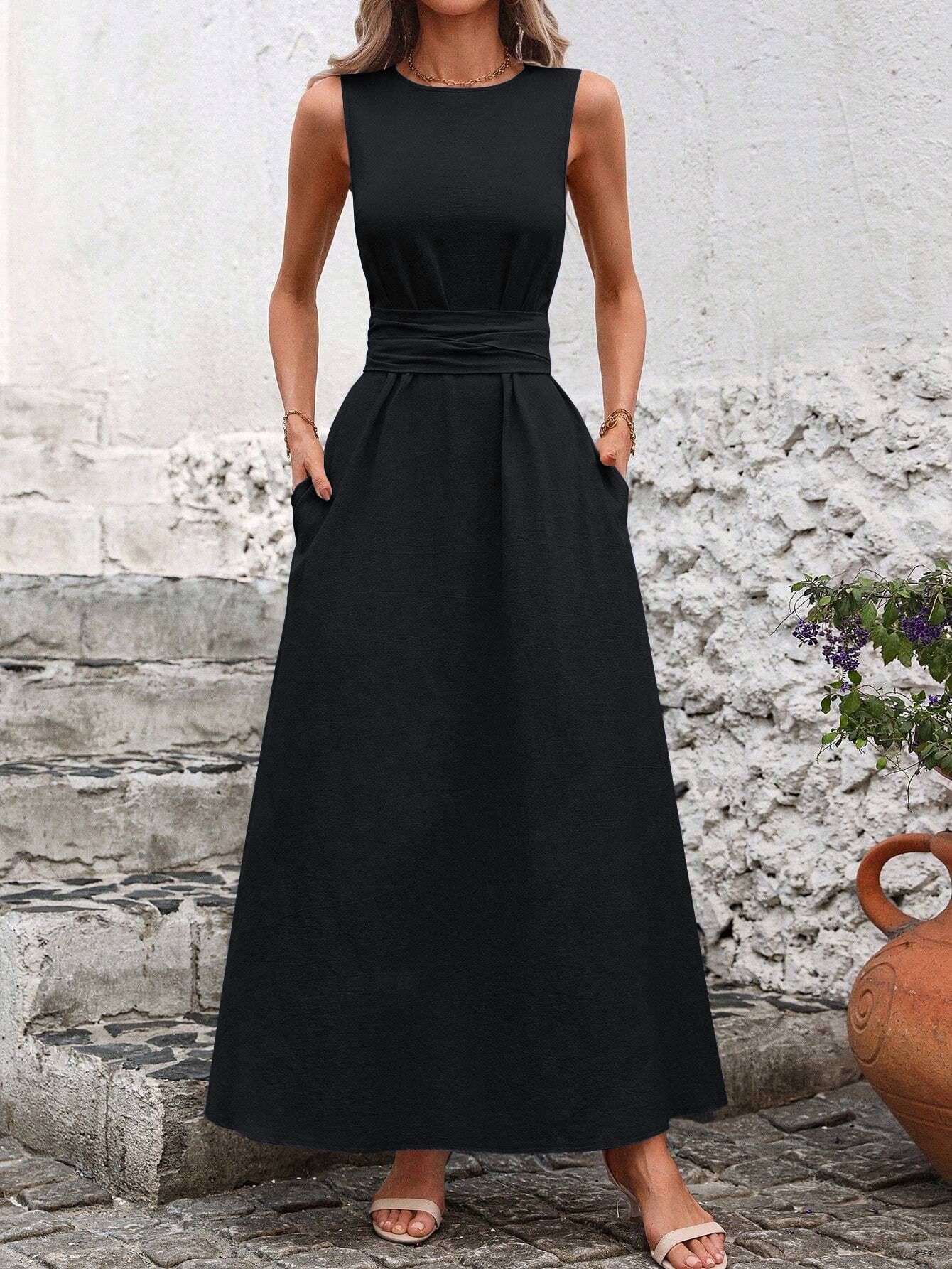 솔리드 컬러 라운드 넥 허리 스트랩 민소매 드레스 편안한 캐주얼 홀리데이 스타일 롱 스커트 유럽과 미국 여성 의류