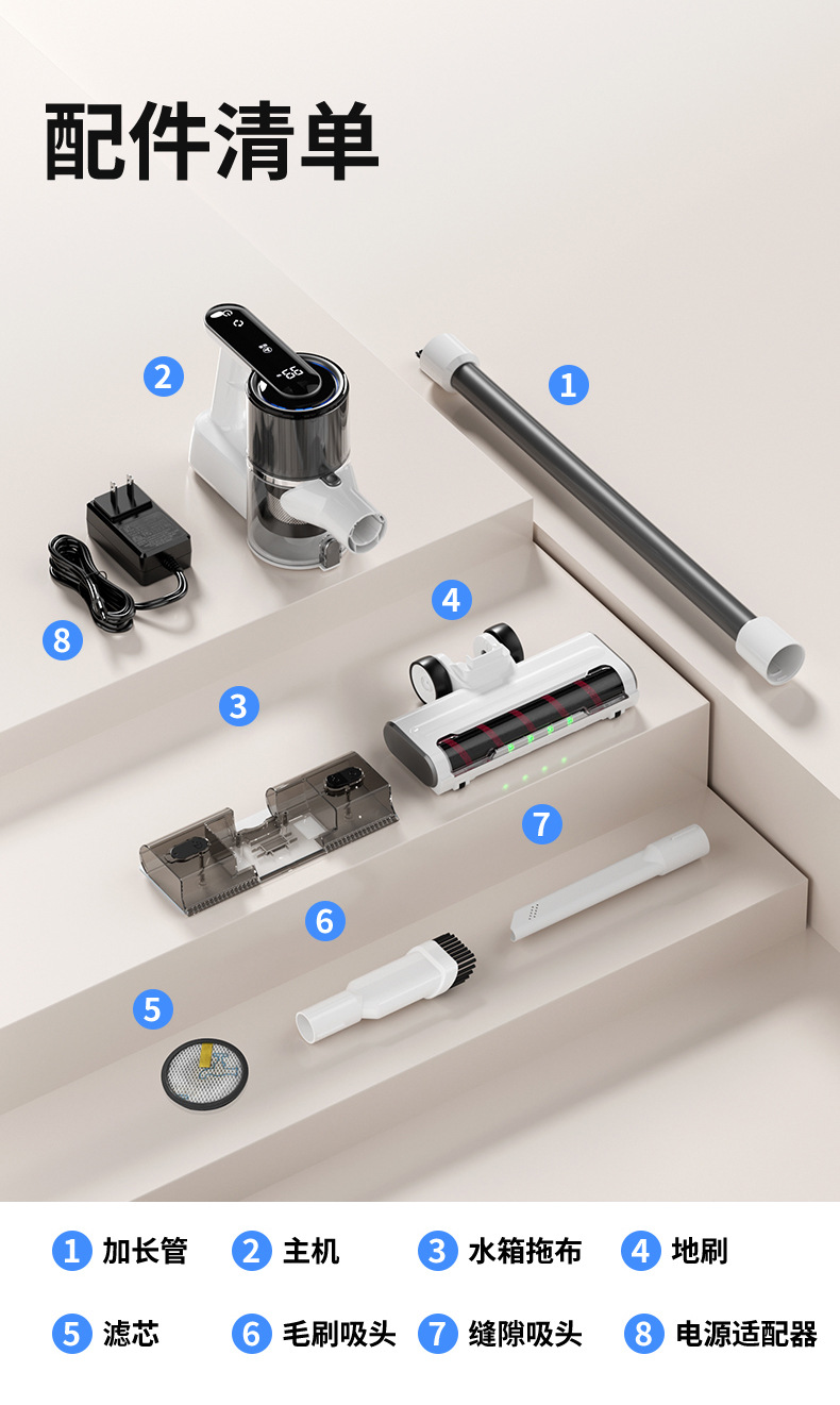 装箱清单:主机*1、铝管*1、滚轮吸盘*1、水箱*1、抹布*1、扁吸嘴*1、毛刷头*1、滤芯*2、说明书*1、充电线*1