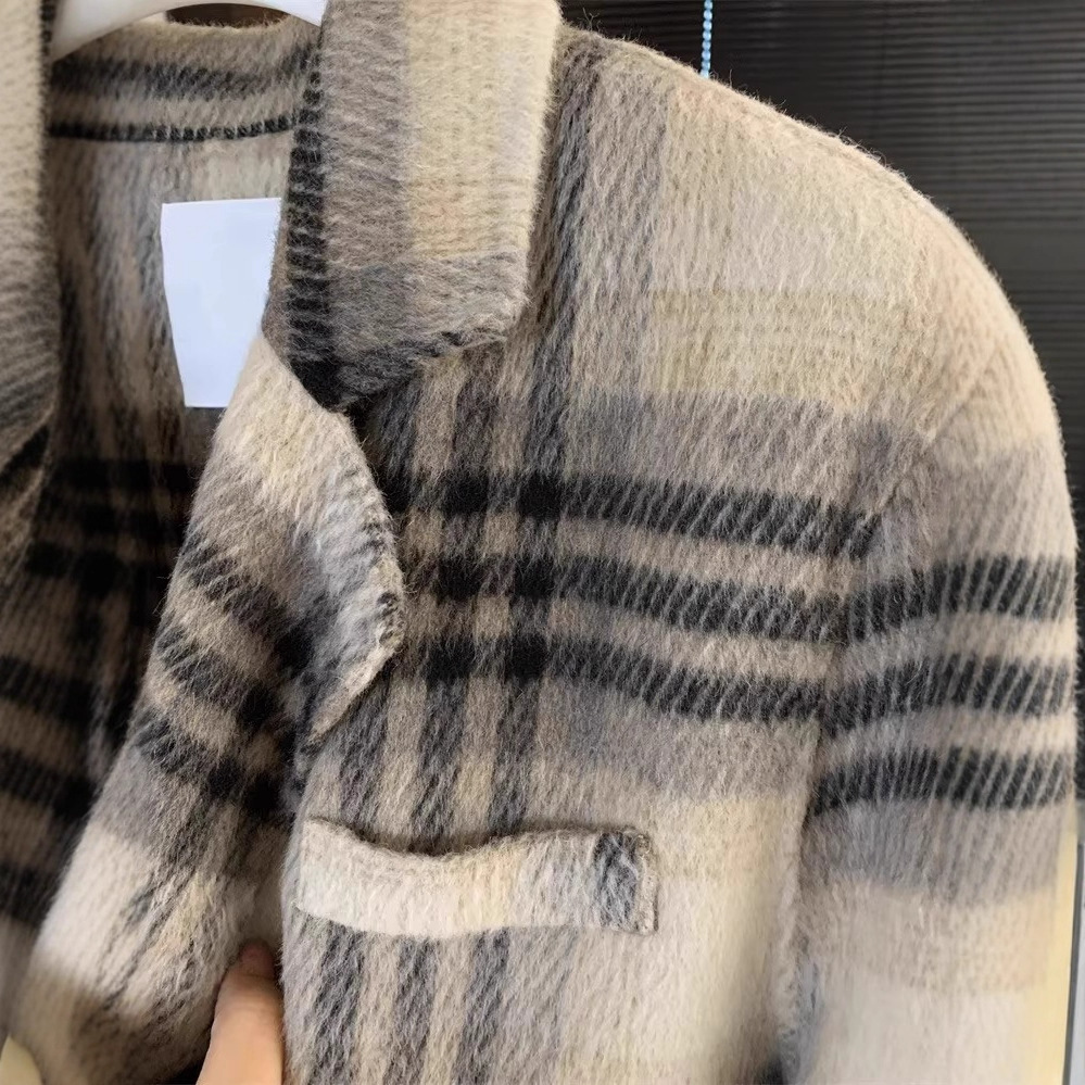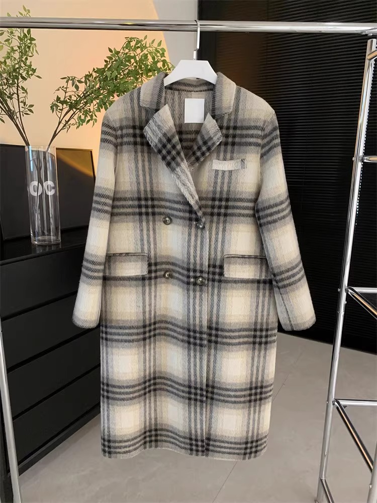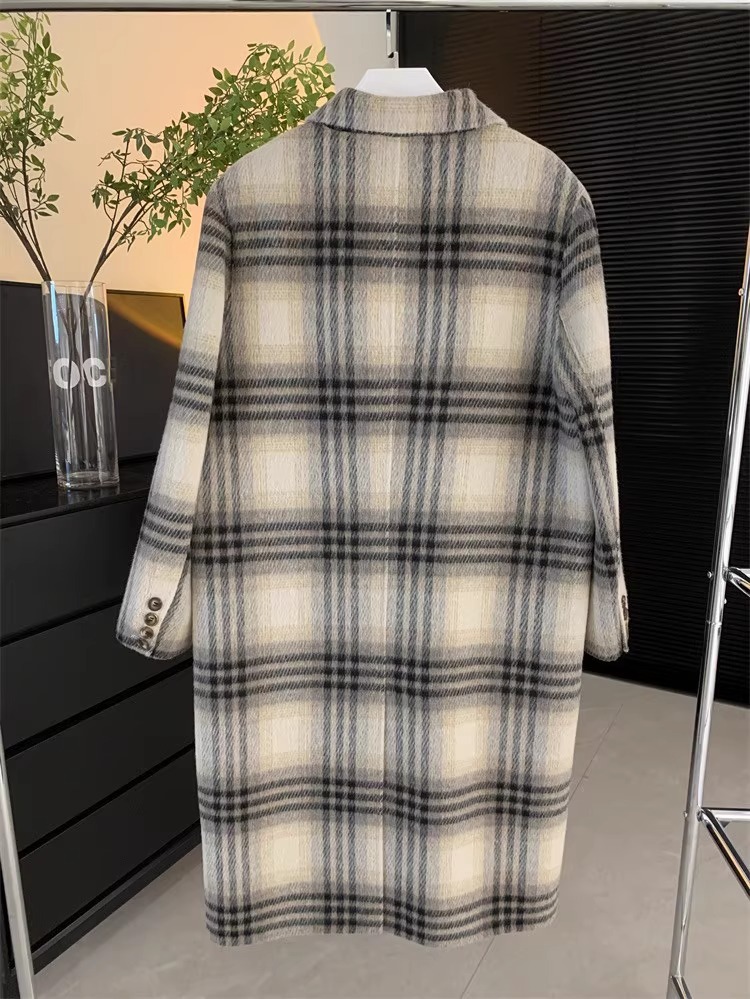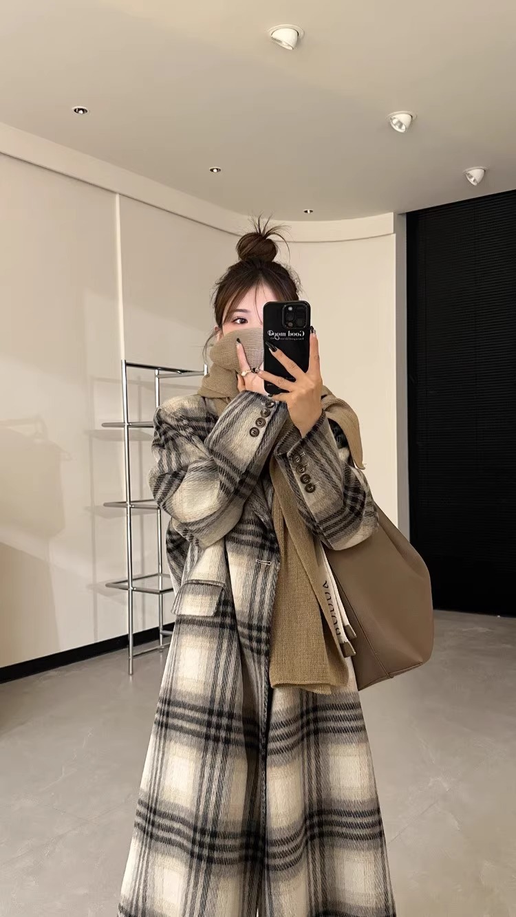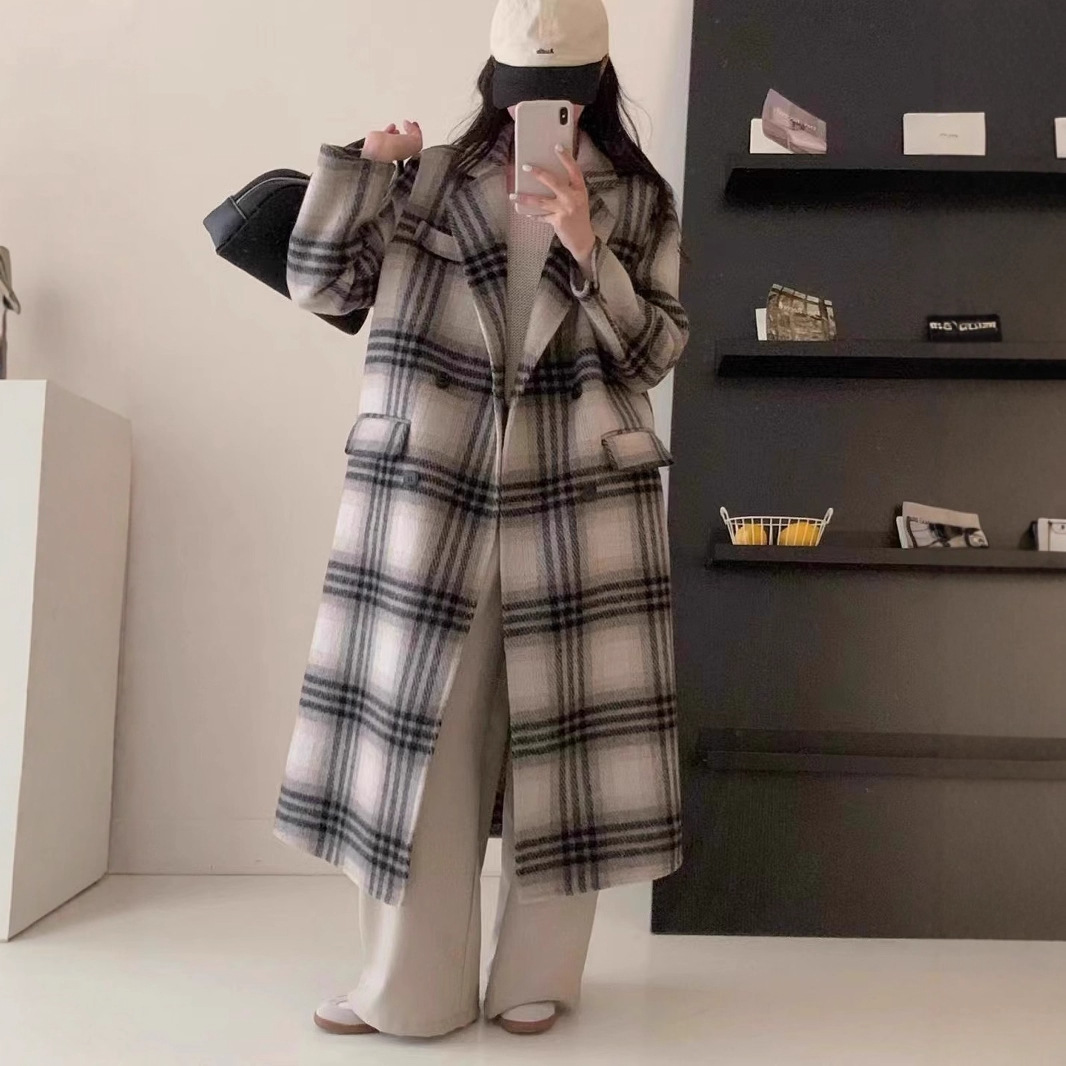 2025 새로운 가을 겨울 긴 머리 고급 한국 격자 무늬 단면 캐시미어 코트 여성용 엑스트라 롱 모직 코트