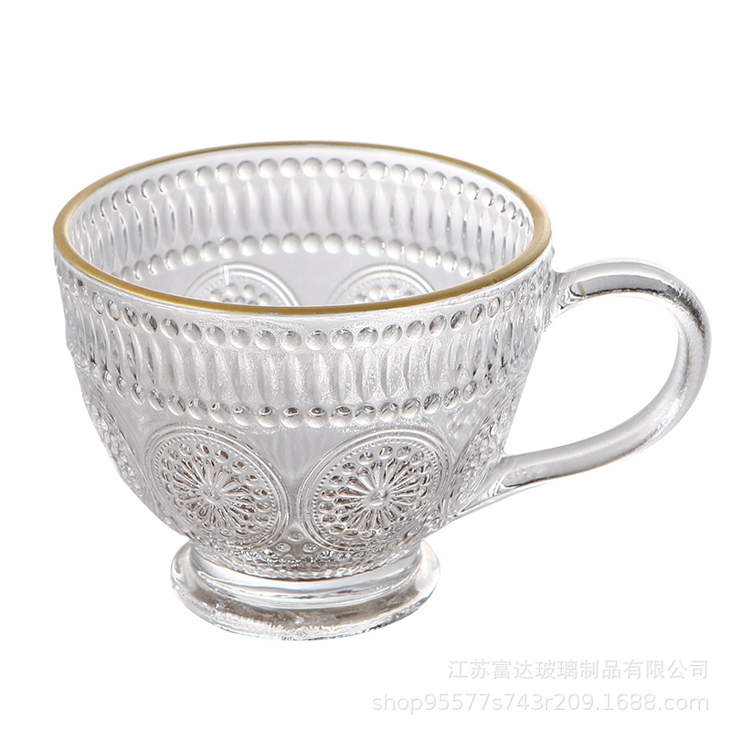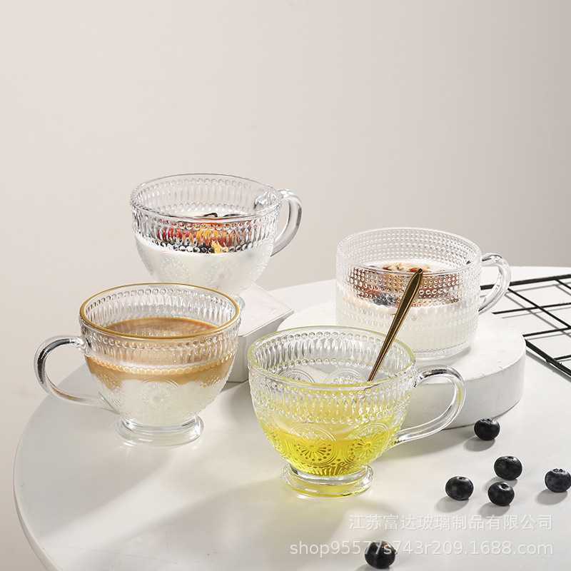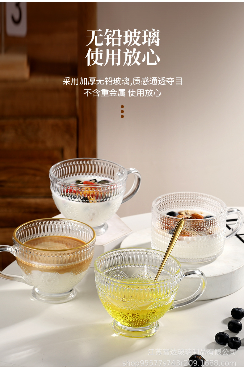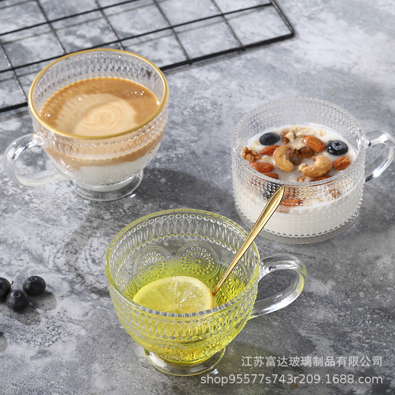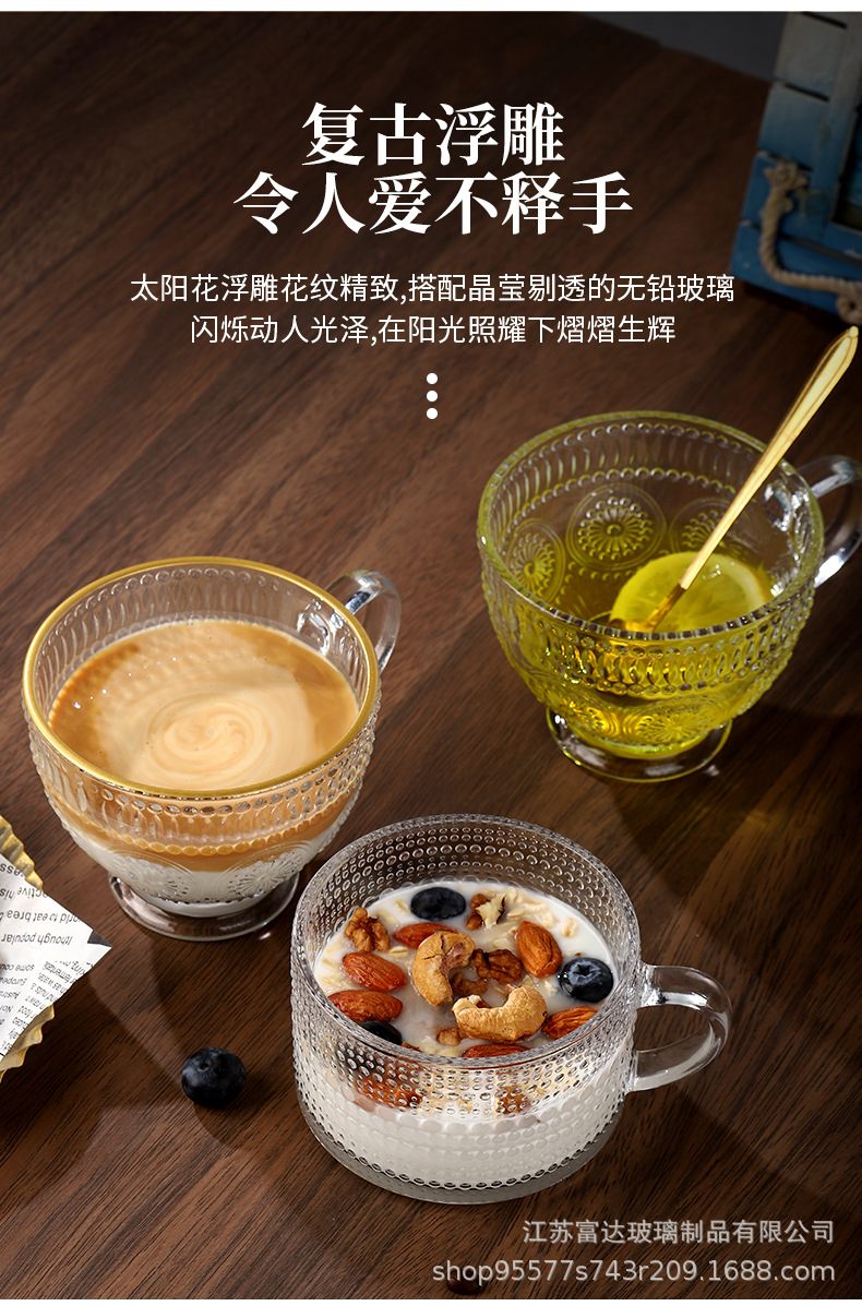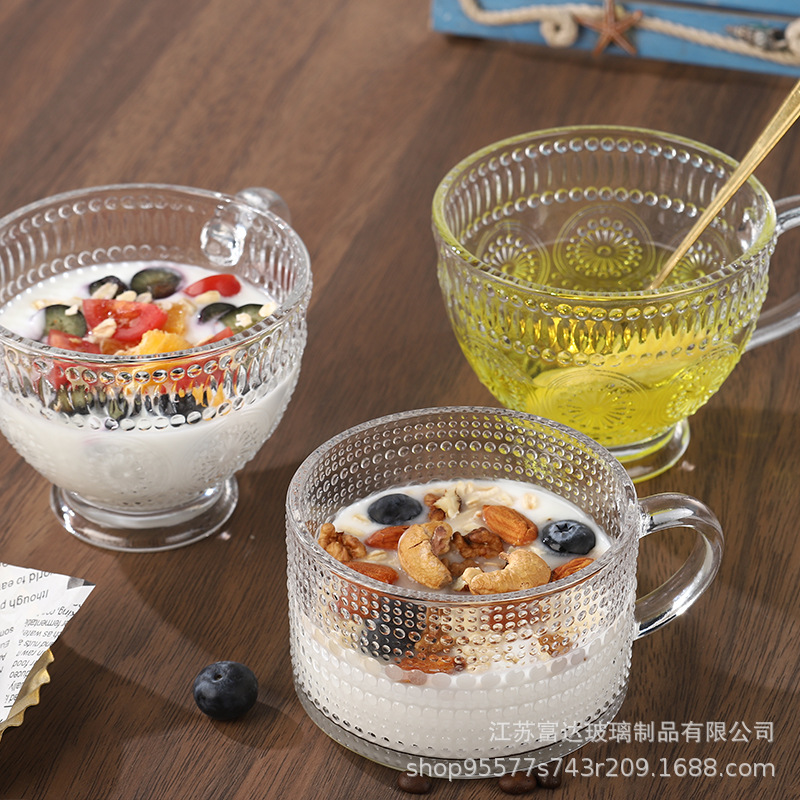 양각 해바라기 아침 식사 그릇 고급스러운 유리 컵 손잡이가있는 대용량 요구르트 그릇 가정용 시리얼 그릇