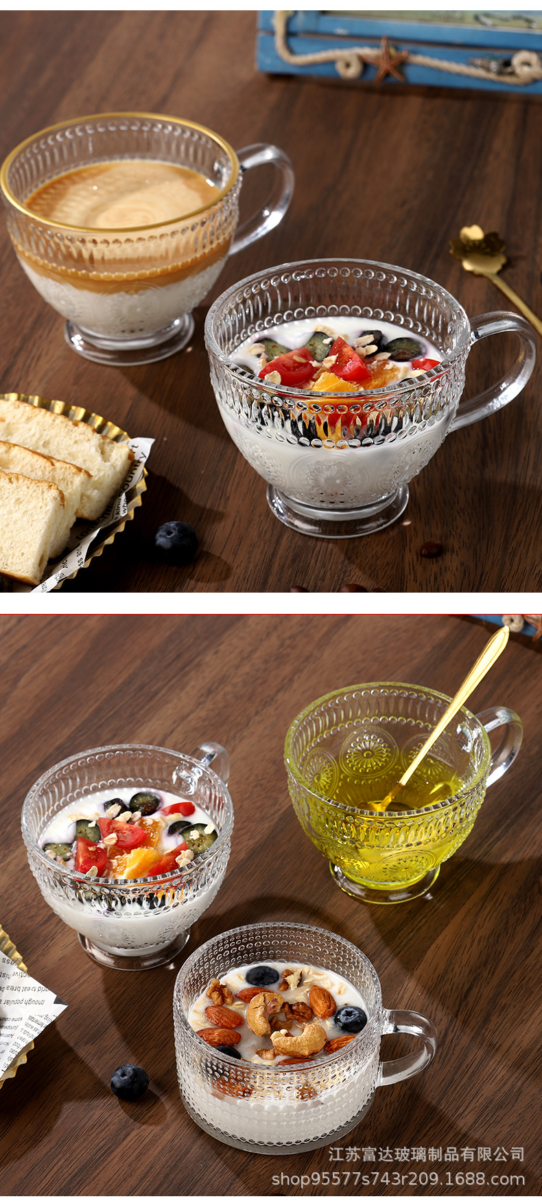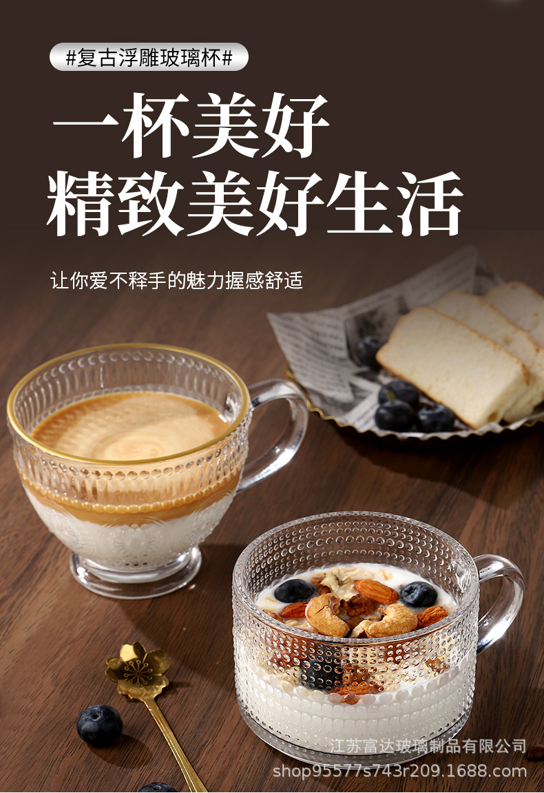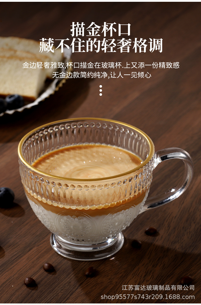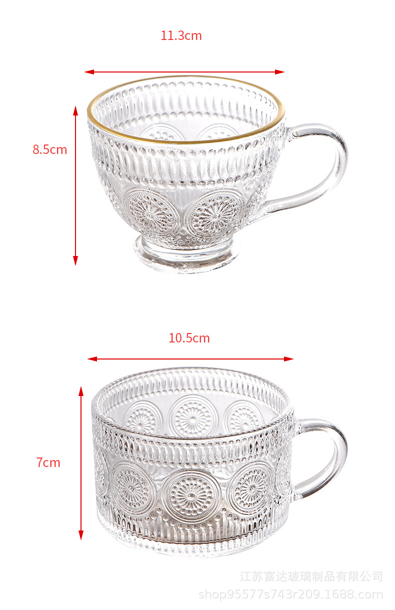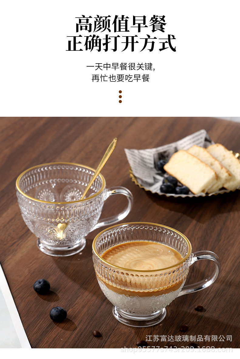 양각 해바라기 아침 식사 그릇 고급스러운 유리 컵 손잡이가있는 대용량 요구르트 그릇 가정용 시리얼 그릇