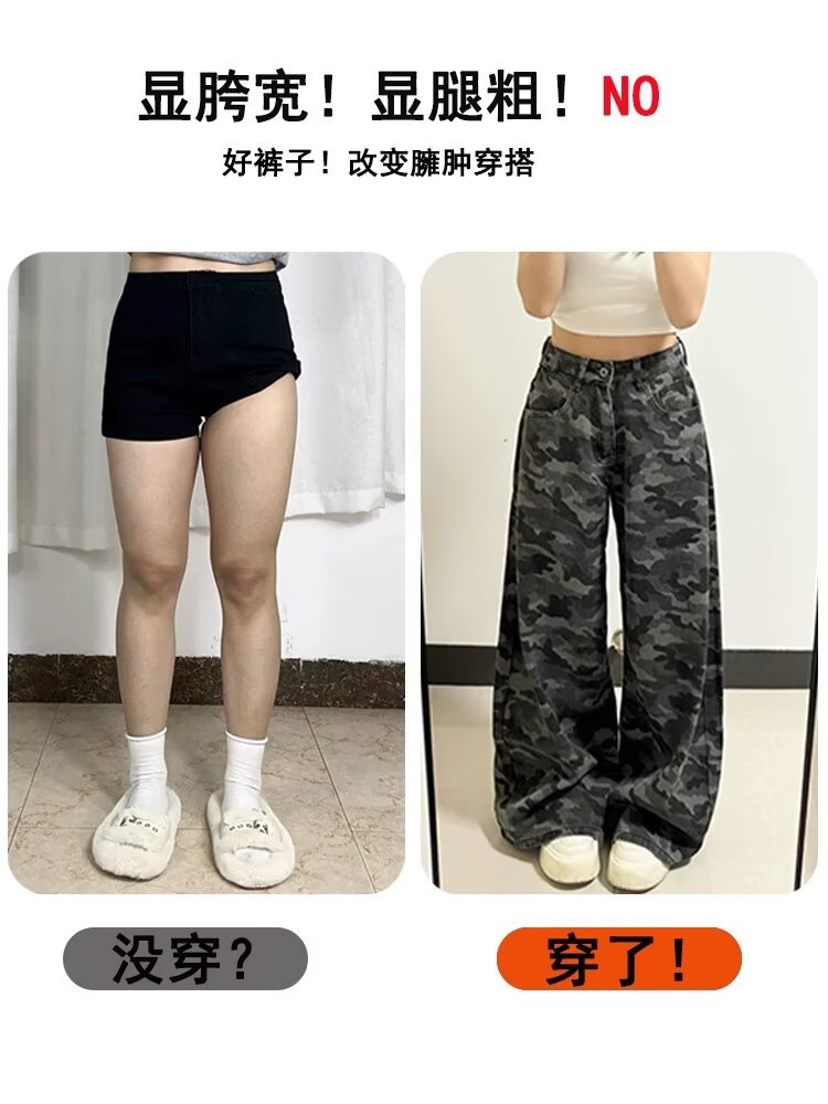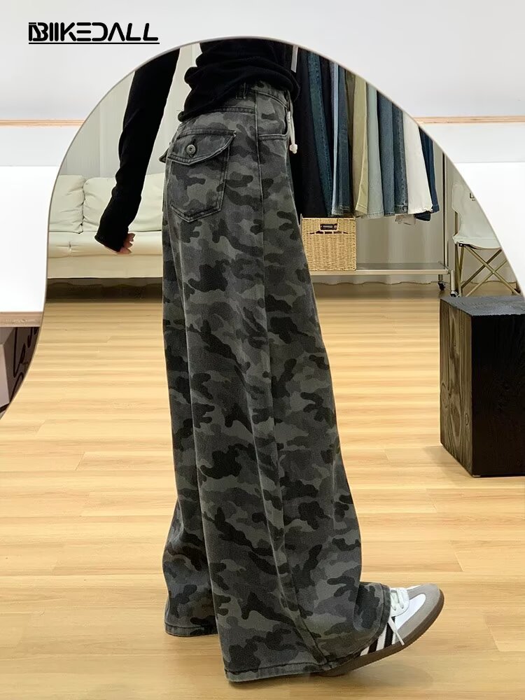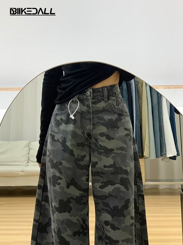 여성을위한 미국 하이 스트리트 카모 와이드 레그 오버올 2024 겨울 루즈 스트레이트 슬리밍 다목적 바닥 길이 데님 바지
