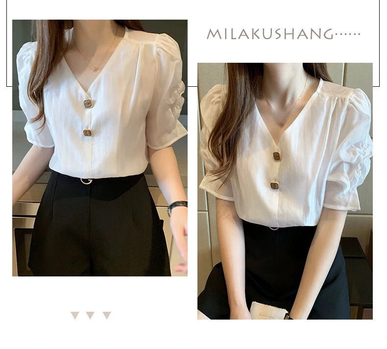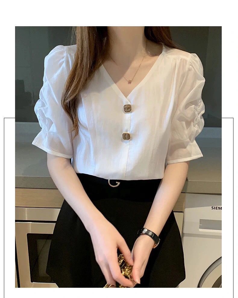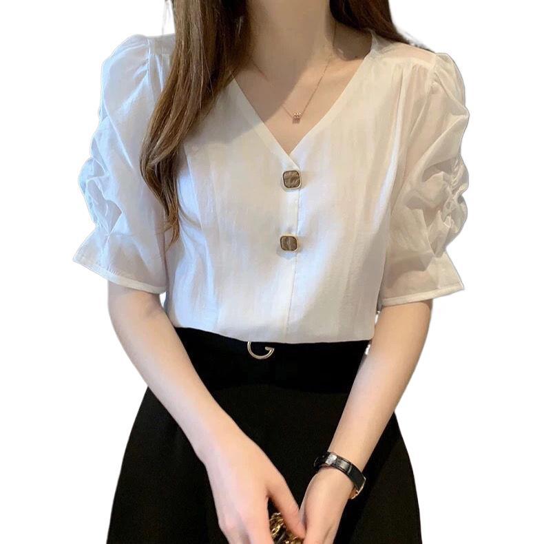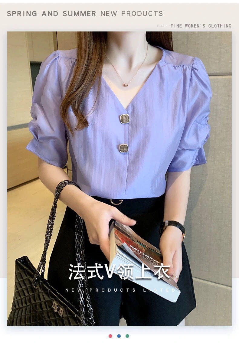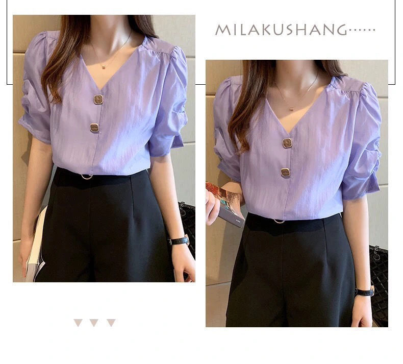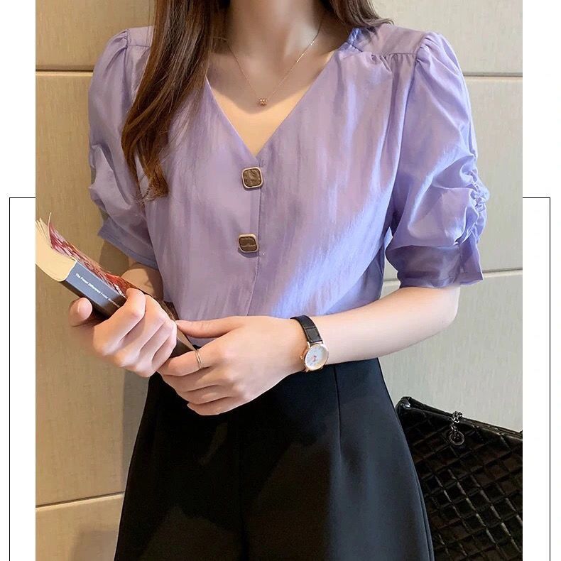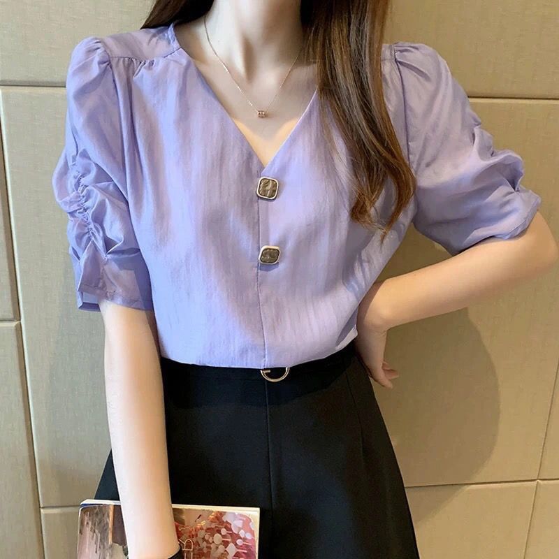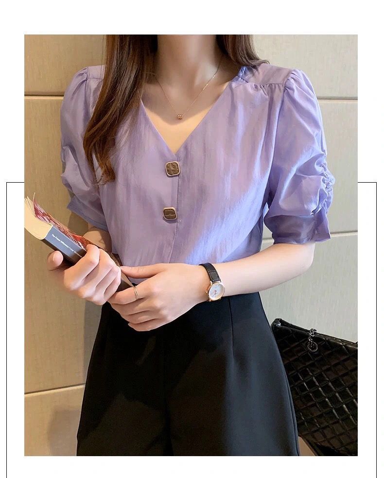 시폰 셔츠 여성 반팔 셔츠 2025 여름 신작 루즈한 브이넥 퍼플 퍼프 슬리브 탑 패셔너블 셔츠 트렌디
