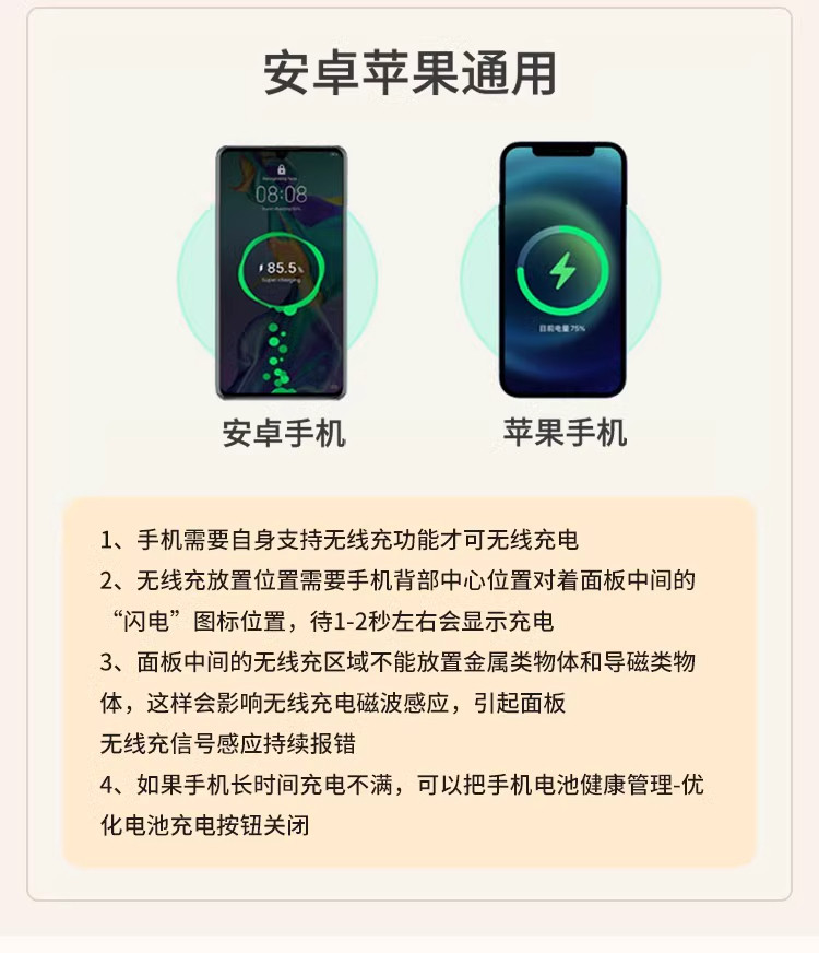 색상 비고 강화 유리 표면 무선 충전 + USB 충전 포트