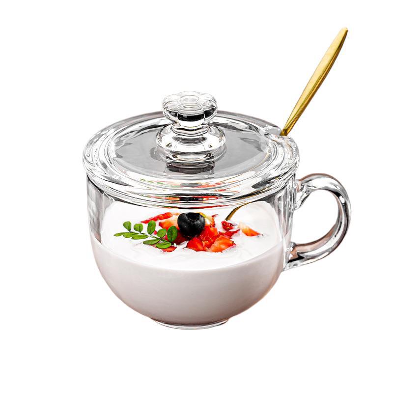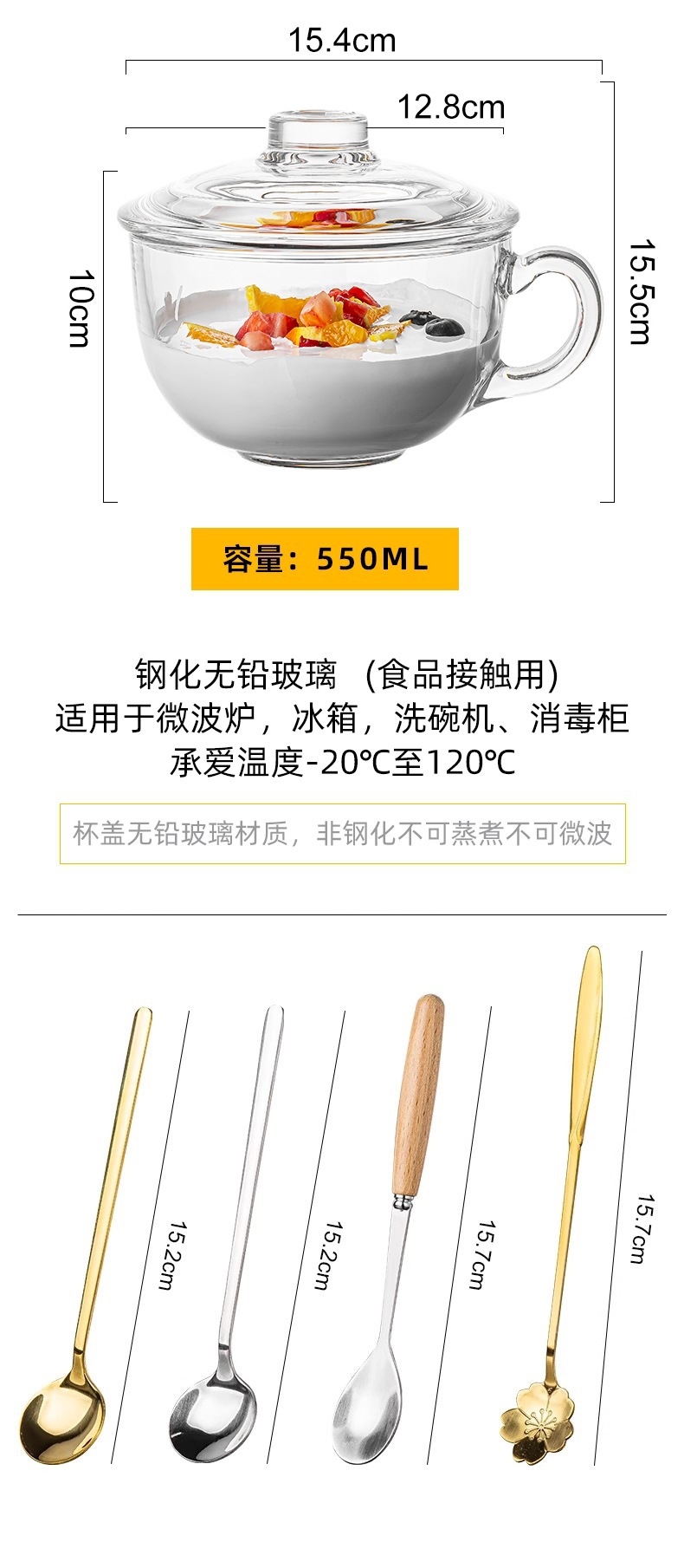 【钢化防摔】550ml加大早餐杯+玻璃盖+银色勺子