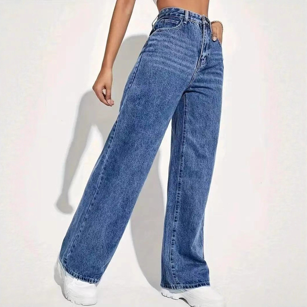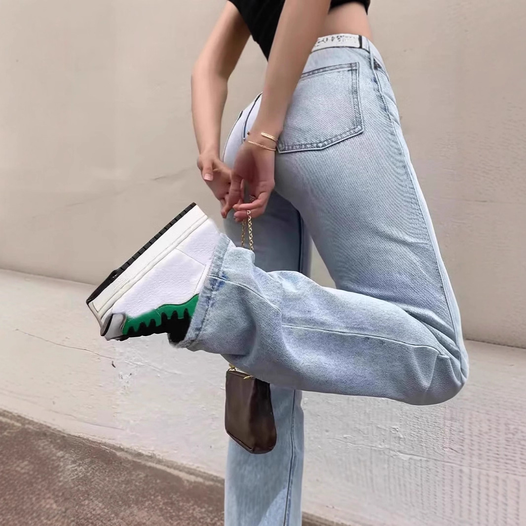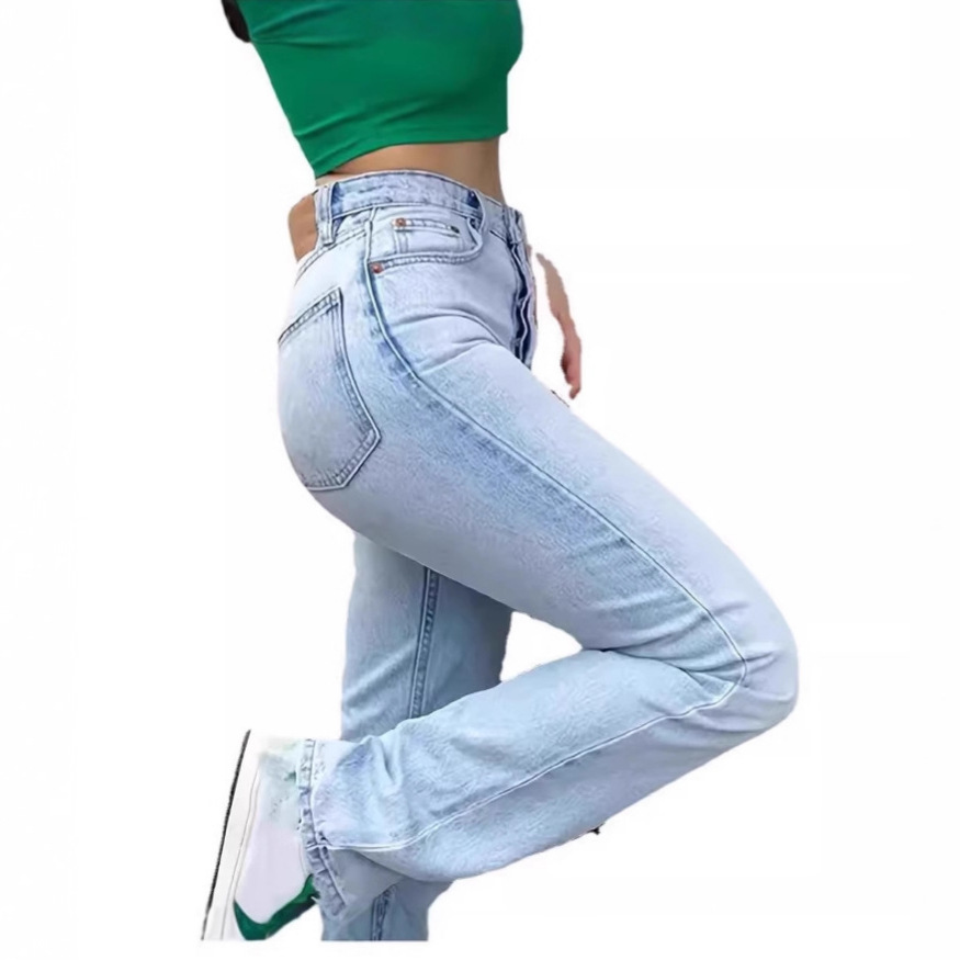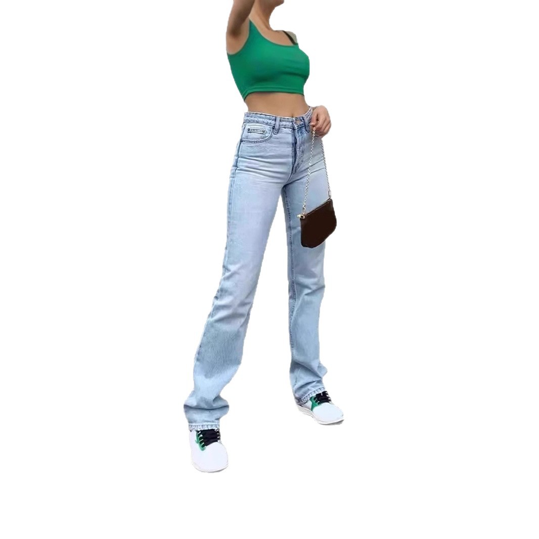 크로스보더 유럽 및 미국 스타일 슬림핏 솔리드 컬러 워싱 하이웨이스트 스트레치 스트레이트 데님 팬츠 여성용