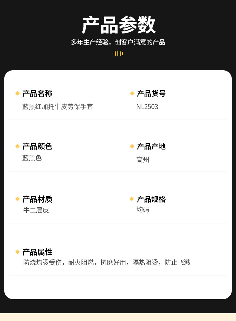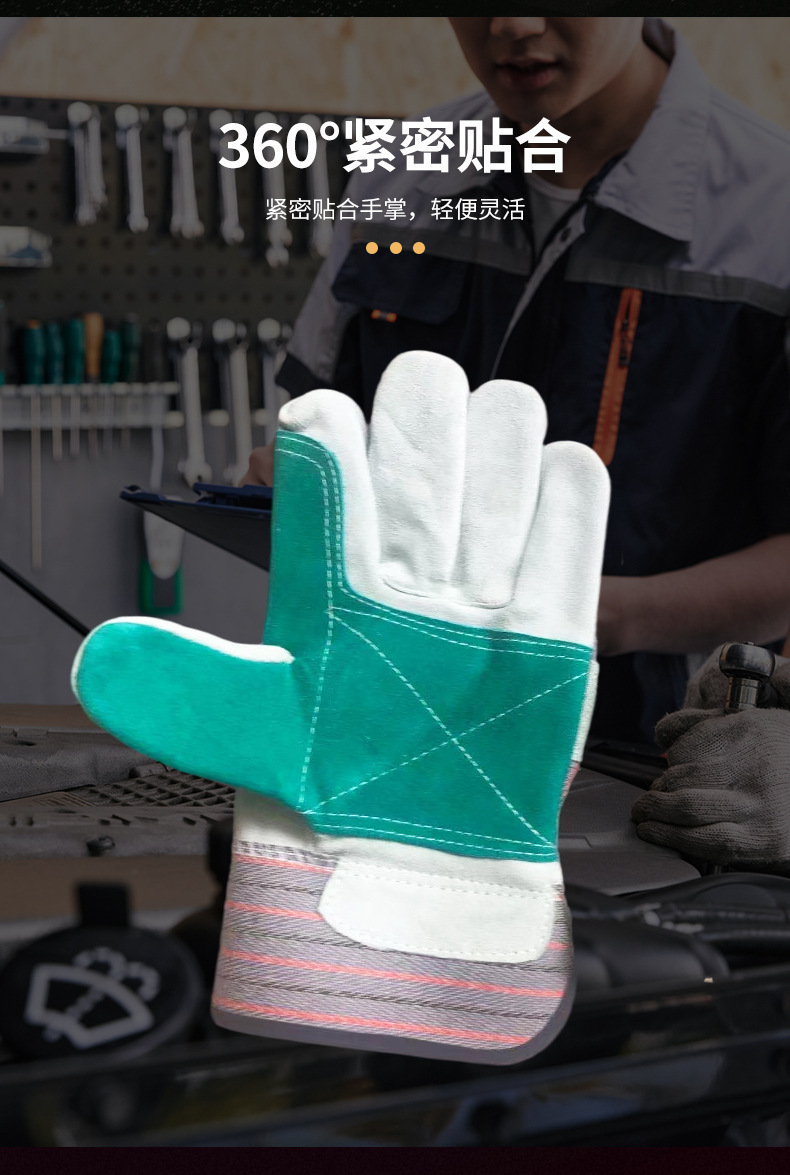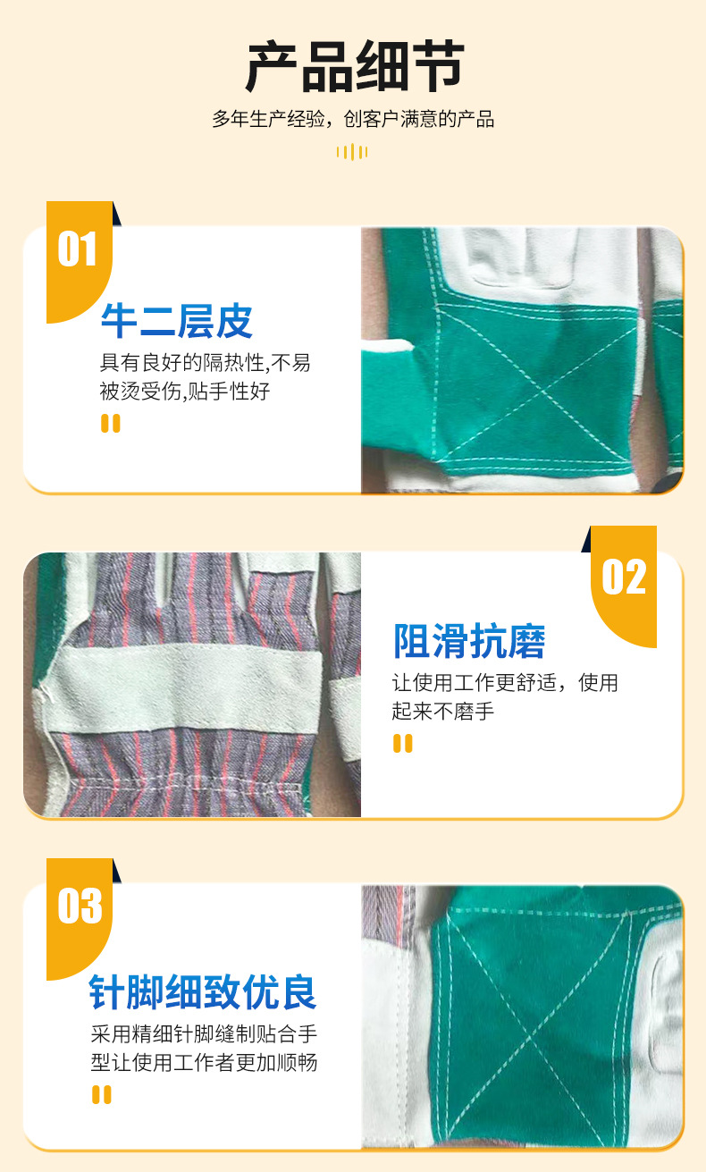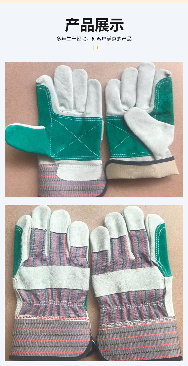 厂家供应加托牛皮劳保手套,采用加厚牛皮材质 + 虎口加托加固工艺,耐火阻燃、隔热阻烫、防飞溅耐磨,有效防止焊渣、高温工件灼伤手部,同时防割防刺、防滑抗磨,适用于电焊作业、机械加工、建筑施工、搬运装卸、汽修维修等多场景,支持批量定制与印 LOGO,现货充足,交期准时,是工厂车间、工地作业的优质防护用品。 电焊 / 气焊 / 焊接作业:防焊渣飞溅、防高温灼伤,保护手部安全 机械加工 / 五金制造:防划伤、防油污、防磕碰,适配车间多工种防护 建筑施工 / 工地搬运:防割防刺、耐磨抗造,应对粗糙建材与重物搬运 物流 / 仓储装卸:防滑抗磨、提升抓握力,防止重物打滑脱手 汽修 / 机械维修:防油污、防磕碰、防划伤,适配维修作业防护 铸造 / 热处理车间:耐高温、防烫,搬运高温金属工件