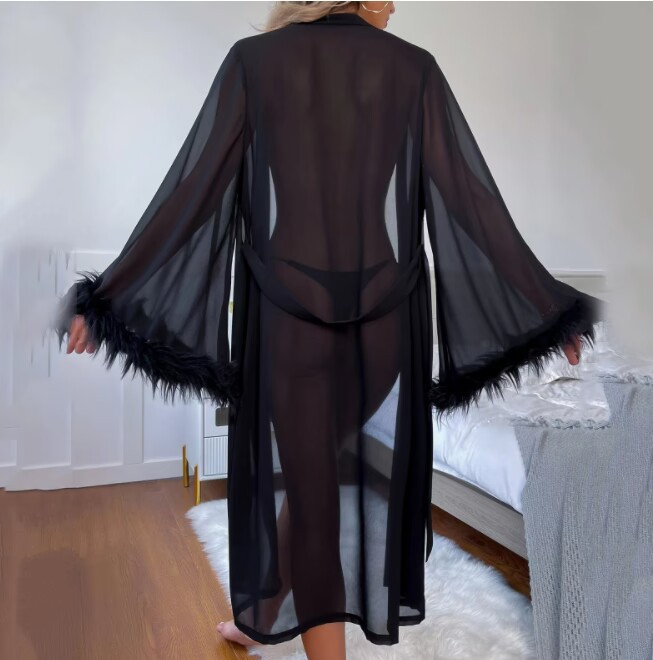 2023 유럽과 미국의 새로운 여름 스타일 모조 실크 깃털 긴팔 잠옷, 편안한 스트랩 여성 홈웨어